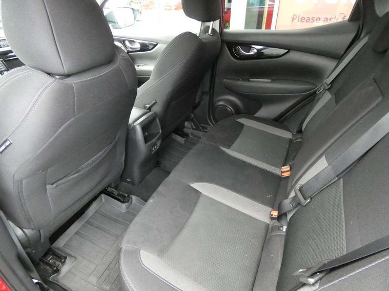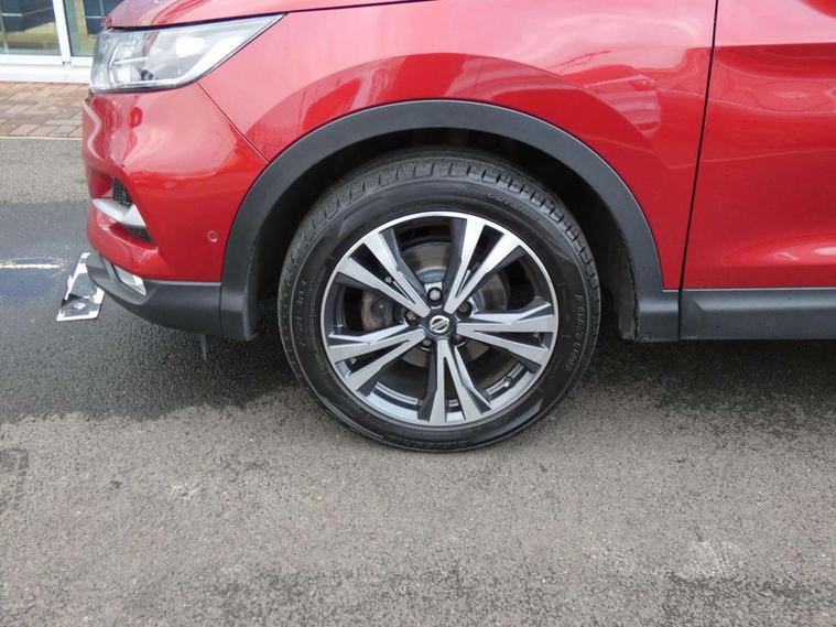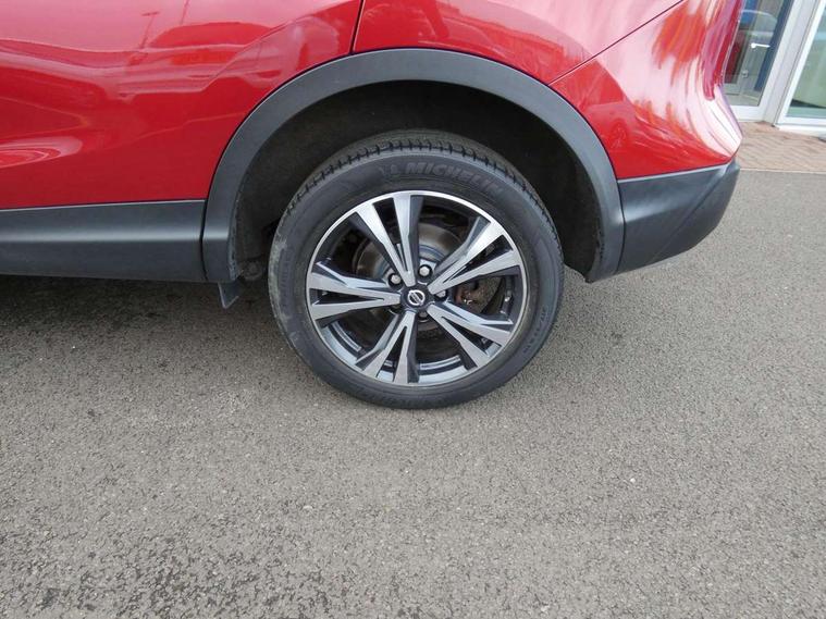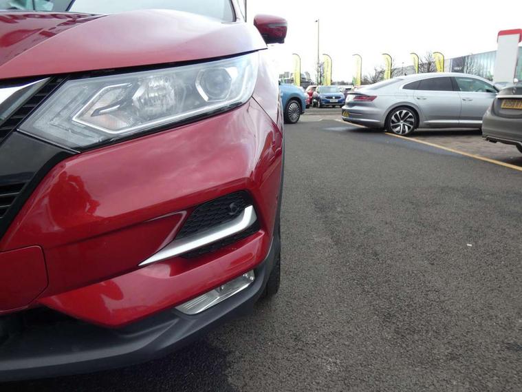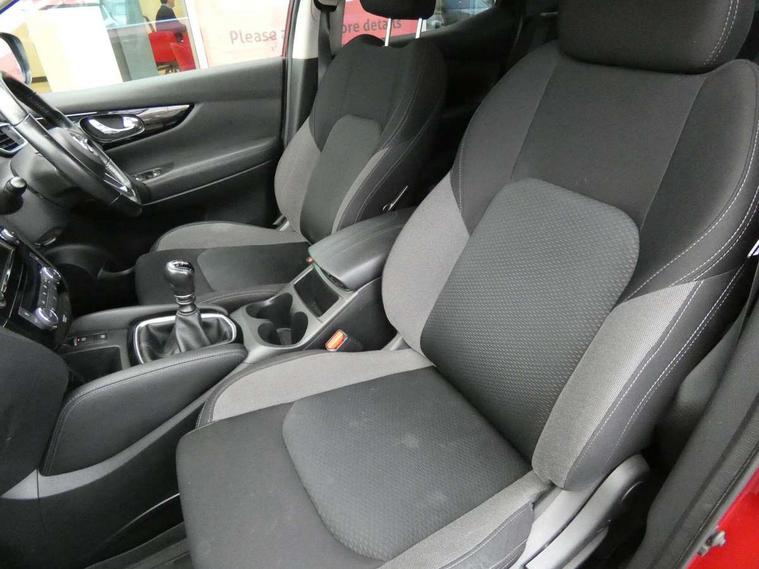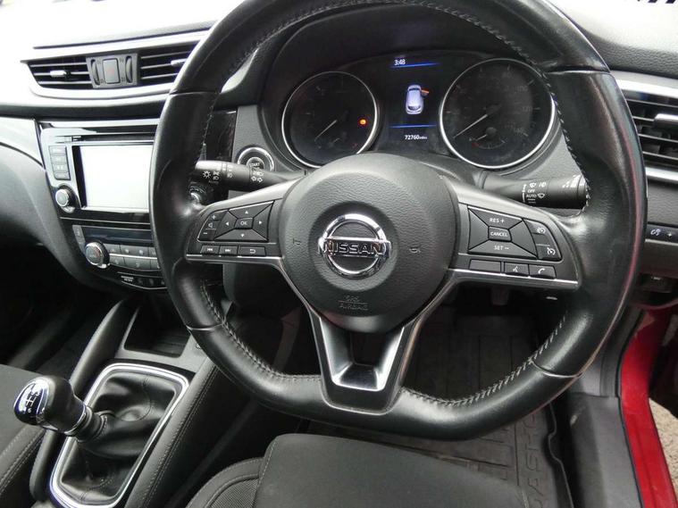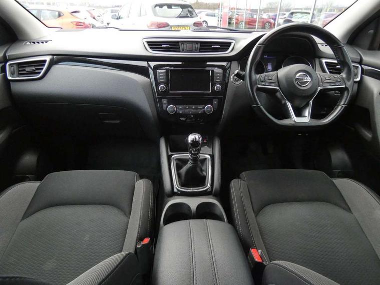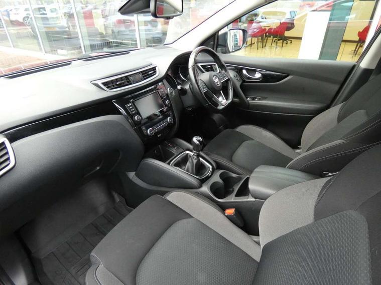 Advanced drive assist display 5'' TFT coloured screen, Android Auto, Apple CarPlay preparation, Bluetooth connectivity, Electric speed sensitive power steering, Front parking sensors, Intelligent around view monitor, Intelligent parking assist, Lane departure warning system, Nissan connect evo 7" touchscreen navigation and entertainment system, Normal or sport selectable steering, Outside temperature sensor, Push button starter, Rear parking sensors, Rear view camera, Service interval indicator, Smartphone integration, Stop/start system, Tomtom connected services, Traffic sign recognition, Trip computer, Voice control system, Diesel particulate filter, 6 speakers, AM/FM radio, CD audio system, Aux-in socket, DAB Digital radio, Rear USB connection, Steering wheel mounted audio controls, USB port, Anti dazzle rear view mirror, Auto wipers, Body colour bumpers, Body coloured door handles, Body coloured door mirrors, Chrome window surround, Daytime running lights dip function when turn signal applied, Electric folding door mirrors, Electric front and rear windows with one touch illuminated window controls, Electric front/rear windows, Electrically adjustable door mirrors, Front fog lights, Halogen headlights, Heated door mirrors, High beam assist, Intelligent auto headlights, LED indicators in door mirrors, Matt silver roof rails, One touch 4x auto windows with illuminated switches, Privacy glass, Rear roof spoiler, Rear wiper with reverse link, Shark fin antenna, Signature LED daytime running lights, Underbody vortex generators, 2 X front 12v power sockets, 3 height adjustable rear headrests, 60/40 split folding rear seat, Ambient lighting, Ambient lighting in centre console, Boot lighting, Centre console storage box/armrest, Chrome interior door handles, Cloth upholstery, Configurable luggage board system, Driver's seat manual height adjust, Dual zone climate control, Front and rear door pockets with bottle holders, Front and rear seat belt pre-tensioners with load limiters, Height adjustable front headrests, ISOFIX restraints on outer rear seats x2, Leather D shaped steering wheel, Leather gear lever, Leather knee pad, Manual height adjustable front passenger seat, Manual lumbar support on driver seat, Manual lumbar support on passenger seat, Parcel shelf stow function under luggage board, Pollen filter, Rear armrest with 2 cupholders, Synthetic leather wrapped door handle with contrasting stitching, Tilt/telescopic adjustable steering wheel, Safety shield plus pack - Qashqai, 6 airbags - Driver, front passenger, curtain and side airbags, ABS, ESP, EBD and brake assist, Auto hold function, Child locks on rear doors, Electronic parking brake, Front and rear seat belt warning, Front passenger airbag deactivation, Height adjustable front seatbelts, Hill start assist, Intelligent emergency braking with pedestrian recognition, Three 3 point rear seatbelts, Tyre pressure monitoring system, Anti-theft immobiliser, Intelligent Key, Remote central locking, Thatcham Cat.1 alarm, Glossy black dash trim, Tyre puncture repair kit,