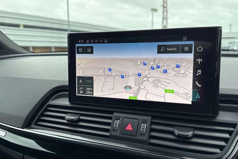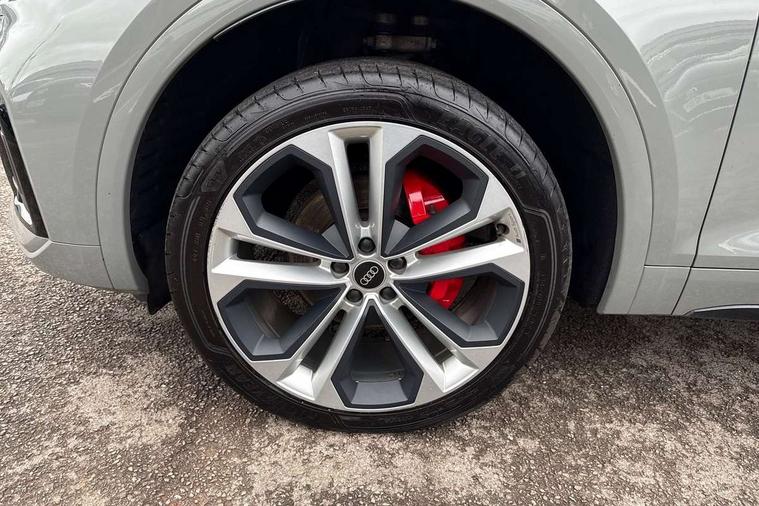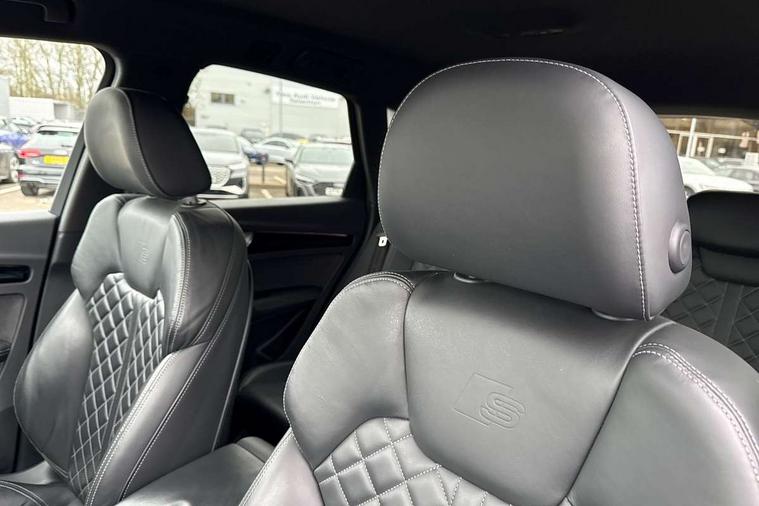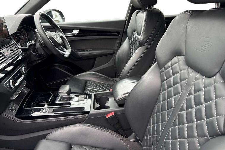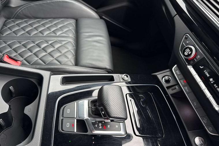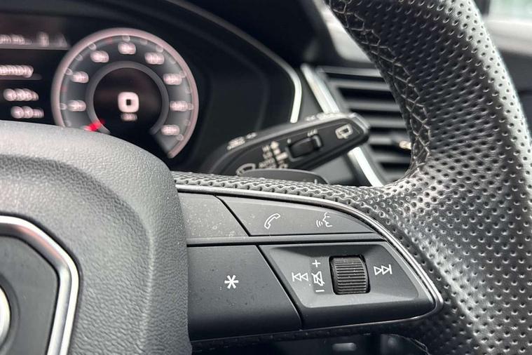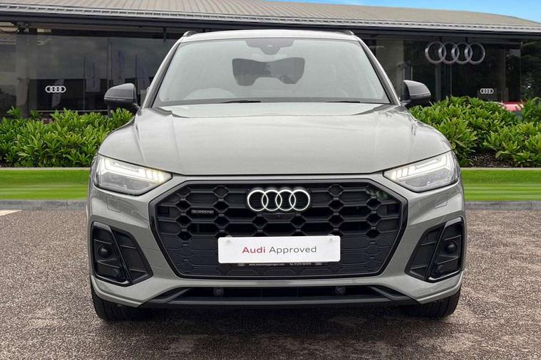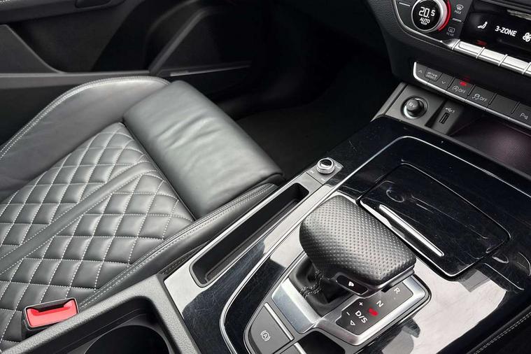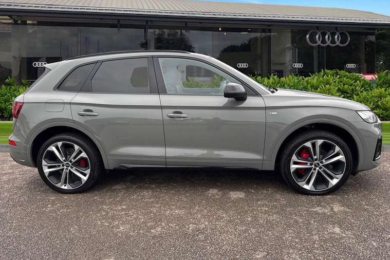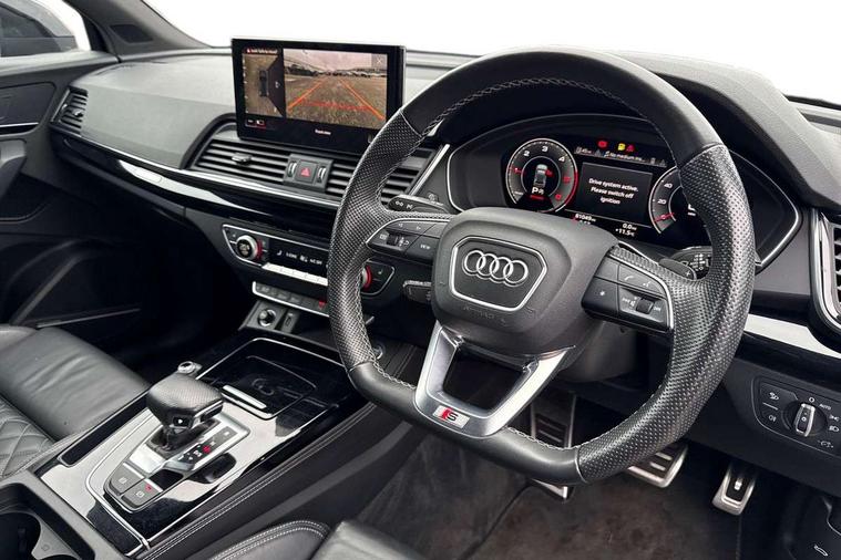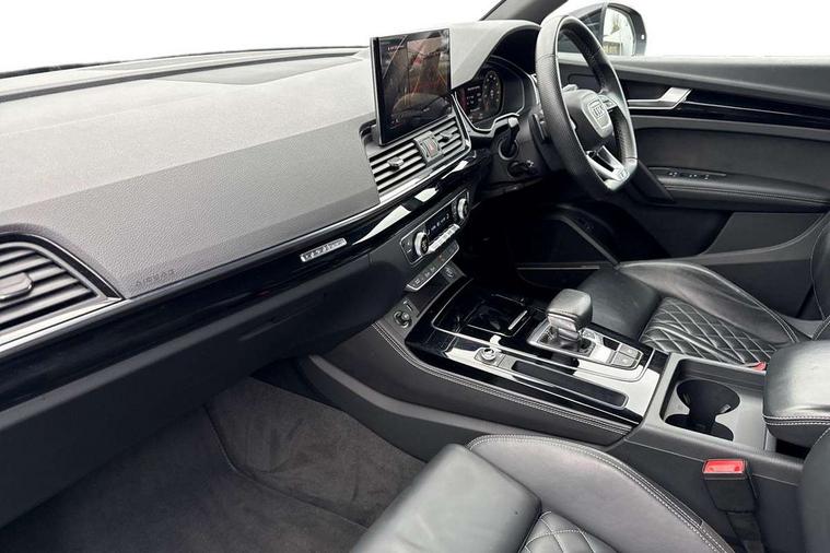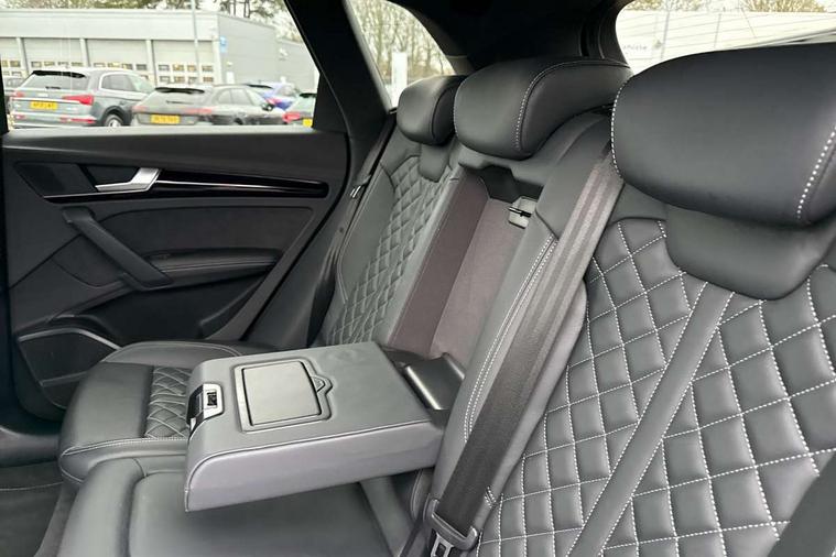 Audi connect safety and service (e-call), Audi connect with Amazon Alexa Integration, Audi drive select, Audi virtual cockpit plus with 12.3" screen and three different layout designs, Audi wireless smartphone interface, Automatic start-stop system with coasting functionality and efficiency programme, Bluetooth interface, Electro - mechanical power assisted steering, MMI navigation plus with 10.1" touch screen, Power tailgate, Reversing camera, Service interval indicator, Voice control system with Audi hotword activation "Hey Audi", Diesel particulate filter, Quattro on demand, S line sports suspension, 2 x USB charging port with aux input socket, DAB Digital radio, Acoustic windscreen, Audi matrix LED headlights with dynamic front and rear indicators, Audi rings at front and rear in black, Audi rings decal on rear doors, Auto dimming door mirrors, Auto dimming rear view mirror, Automatic headlights and windscreen wipers, Black door mirrors, Black roof rails, Body colour bumpers, Body colour underbody protection, Chrome plated exhaust trims, Daytime running lights, Door sills in Selenite silver, Electric adjustable/heated/folding door mirrors, Front air inlet surrounds in titanium black, Front and rear electric windows, Headlight washers, High gloss black B pillar trims and triangular rear door trim, High level LED brake light, Rear chrome trim strip below lights, Rear privacy glass and rear side windows, Rear side wing doors, Rear wiper, Roof bars, S Line rear spoiler, 3 rear headrests, 4 way electric lumbar support for driver and front passenger, 40:20:40 split folding 3 rear bench seat in 2nd row with rear centre armrest, Black cloth headlining, Comfort front centre armrest, Contrast stitching on seats, steering wheel and gear lever gaiter, Deluxe 3 zone electronic climate control, Electrically adjustable front seats, Fine Nappa leather upholstery with diamond pattern contrast stitching + front sport seats with S embossed logo, Front/rear floor mats, Gear lever in black leather, Heated front seats, Height adjustable front head restraints, Height/reach adjustable steering column, Illuminated door sill trims with S logo, ISOFIX child seat mounting and top tether, Rear seat bench plus, Removable luggage compartment floor, Single front passenger seat, Stainless steel pedals, Sunvisors with vanity mirrors, Black styling package - Q5 Edition 1, Extended interior upholstery pack - Q5, Extended LED Interior multi coloured Lighting Pack - Q5, 3 point seatbelts on all seats, 6 airbags - Driver, front passenger, curtain and side airbags, Electrically operated child locks on rear doors, Electromechanical parking brake, Electronic stabilisation control including ABS, ASR and EDL, Front and rear brake calipers painted in red, Front passenger airbag deactivation, Hill descent control, Hill hold assist, Multi collision brake assist, Pop-up bonnet for pedestrian protection, Pre sense city, Seat belt force limiter, Seatbelt monitoring, Tyre pressure warning, Warning triangle and first aid kit, Anti theft alarm, Anti-theft wheel bolts, Keyless Go access/ignition system, Remote central locking, Piano black finish inlay,