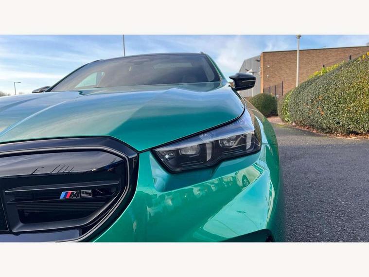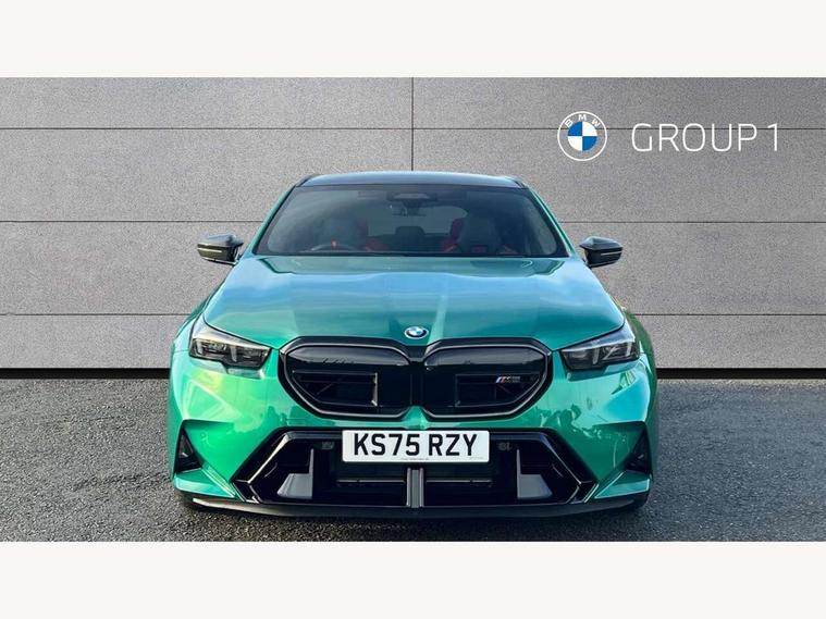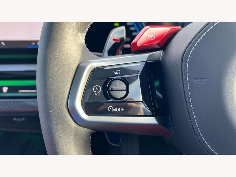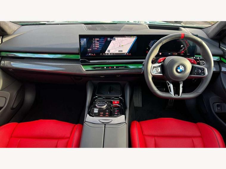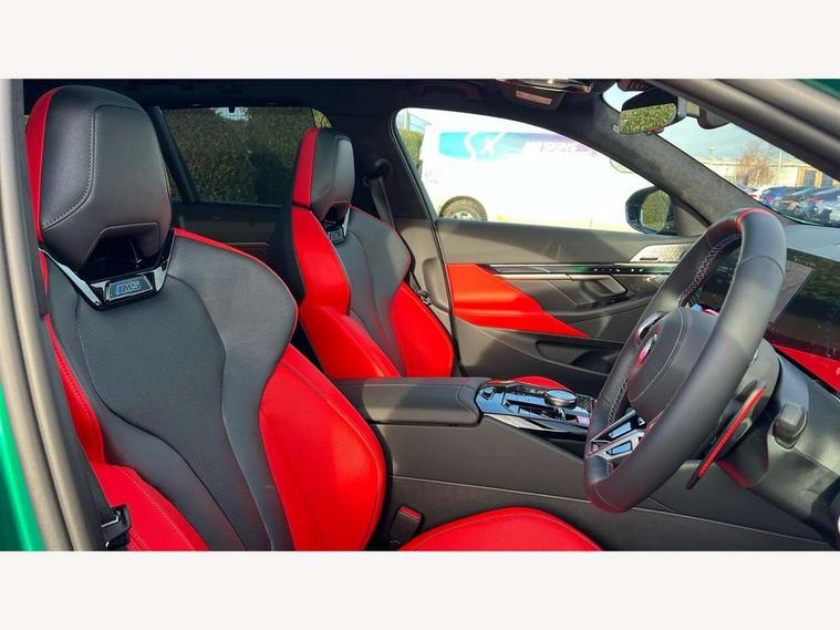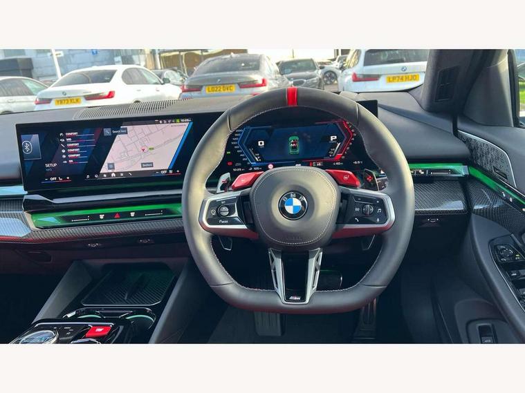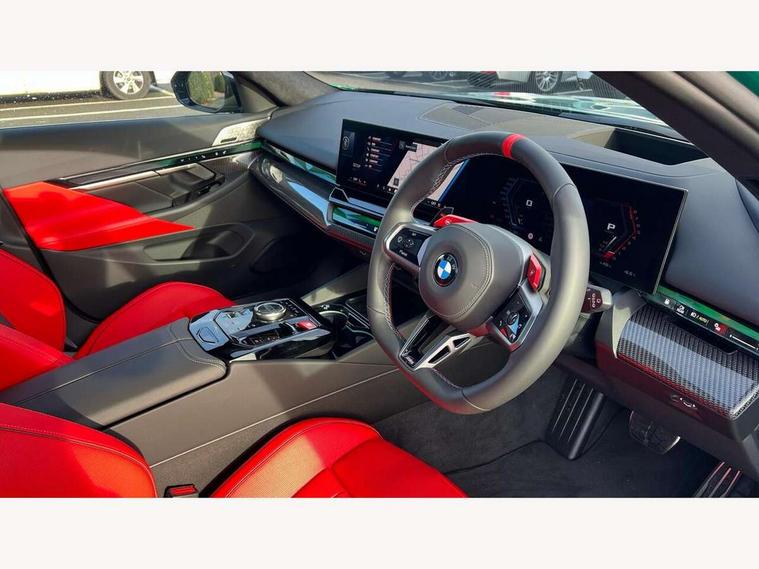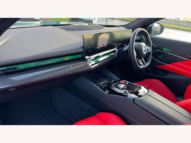 Active Guard, Automatic operation of tailgate with remote opening and closing, Bluetooth Wi-Fi interface, BMW Iconic sounds electric, BMW interaction bar, BMW legal emergency call, BMW Live Cockpit Professional with head up display with driver profile, 4G LTE connectivity, augmented view, full colour head-up display, BMW Teleservices, Connected drive services, Driving Assistant Plus Preparation, M Servotronic steering, Oil sensor for level and grade, On board computer (OBC) includes average speed, fuel consumption and range, journey computer, outside temperature display, personal profile functions, Personal e-SIM, Service interval indicator, AC Fast charging preparation (Maximum charging power 11kW), Adaptive M Suspension with electronically controlled dampers and integral active steering, BMW xDrive system, Charging cable professional (mode 3) for public charging (up to 22 kW), M Drive professional with M track mode, M laptimer, dynamic and dynamic plus, boost control, M Sport differential, Bowers and Wilkins surround sound system, DAB radio, Wireless charging with smartphone storage tray, Adaptive LED Headlights, Auto dimming door mirrors, Black contrast roof, BMW Iconic glow kidney grille, Body coloured bumpers, Electric front and rear windows with fingertip open/close + anti-trap all round and comfort closing function, Heated windscreen washer jets, High beam assistant, High level LED brake light, Interior rear view electrochromatic mirror with automatic anti dazzle function, LED daytime running lights, M lights shadowline, M specific electrically adjustable/foldable/heated exterior mirrors with integrated direction indicators, Rain sensor including auto headlights activation, Rear side hinged doors, Rear wiper, Sun protection glass, 12V power sockets 2 x rear, 1 x luggage compartment (additional 1 X double USB adaptor with 2A charging current), 3 seat bench in 2nd row, 4 zone control automatic air conditioning, Armrest - front and rear integrated door trim, centre console includes storage compartment, rear centre includes 2 cupholders, Child seat ISOFIX attachment with rear outer seats includes top tether, Driver and front passenger lumbar support, Electric seat adjustment with memory, Floor mats in velour, Front ambient light - inside door opener, pull handle, map pocket, curved display, charging tray, cupholder, crystalline glass backlit interaction bar, Glove Compartment with light, Headrests for all seats, Height and length electric adjustment steering column, High-gloss black door switch cluster, power window switch and tailgate button on first and second row seat, M multifunctional seats driver and front passenger with and illuminated M5 logo headrests, M steering wheel with paddle shift, Multifunction controls for leather steering wheel, Rear ambient light - inside door opener, pull handle, map pocket and back panel of front seats, Single front passenger seat, Steering wheel heating, Through loading system with 40/20/40 split folding rear seat, Connected package professional - M5, Exterior design pack - M5, M high gloss Shadowline exterior trim pack - M5, M high gloss shadowline with extended contents pack - M5, Parking assistant plus pack with anti travel recorder - M5, Acoustic protection for pedestrians, Airbag deployment is controlled with respect to the intensity and scope, Anti lock braking system (ABS) with cornering brake control, Automatic door lock when driving away, Brake assist function, Child locks, Crash sensor for activation of hazard warning lights, Driver and front passenger airbags, Driver central airbag, DSC - Dynamic Stability Control, Electromechanical parking brake with automatic drive away release and auto hold function, Emergency brake assist, Head airbags, M Sport seatbelts, PC iBrake PostCrash approah collision warning with braking function, Side airbags for driver and front passenger, Side impact protection, Three inertia reel rear seatbelts, Trailer stability control, Tyre pressure monitoring system, Warning triangle and first aid kit, Alarm system for monitoring doors, engine compartment, interior movement sensor, tilt sensor and siren with emergency power supply, Automatic door locking, Comfort access system with BMW digital key plus, digital key card, smartphone as vehicle key, smart opening/closing, gesturing tailgate, light staging, Interior camera, Locking wheel bolts, Tyre repair kit,