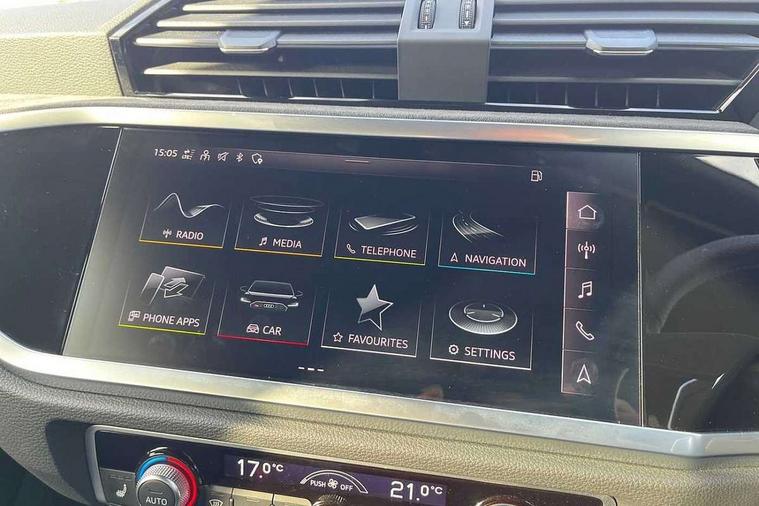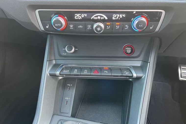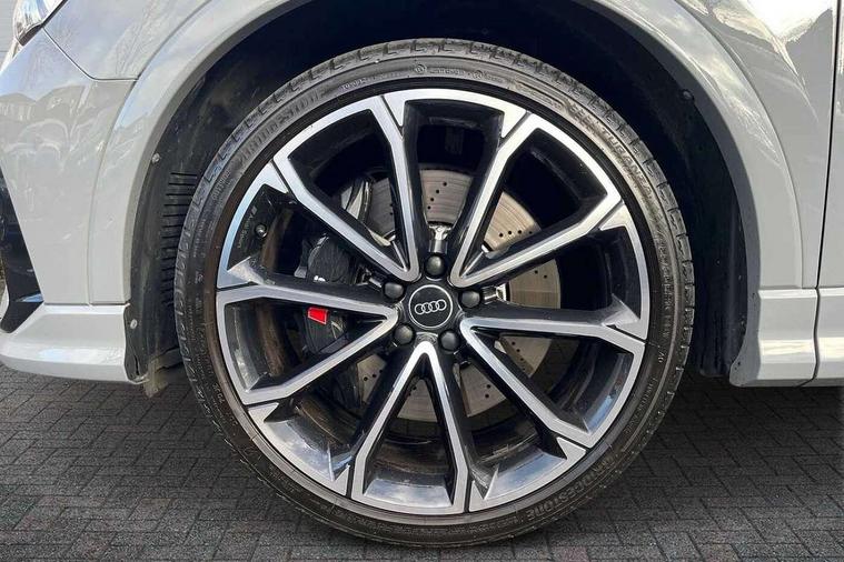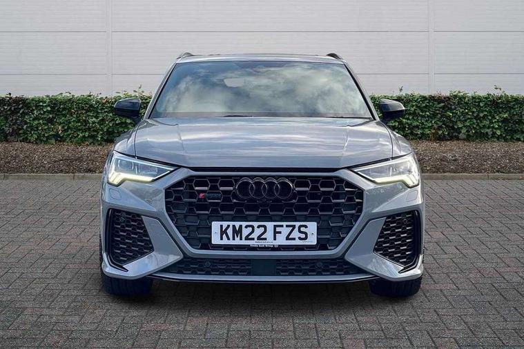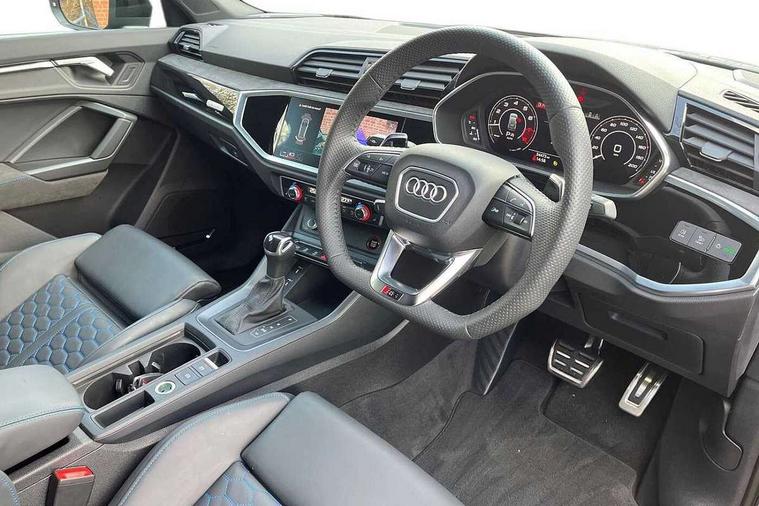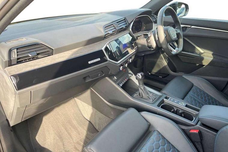 Audi connect safety and service (e-call), Audi drive select with new RS modes, Audi lane departure warning, Audi parking system plus with front and rear sensors, Audi virtual cockpit plus - 12.3 inch display, Bluetooth interface, Camera based traffic sign recognition, MMI Navigation Plus with high resolution 10.1 inch touchscreen colour display, Power operated tailgate, Progressive steering, Smartphone interface includes wireless Apple carplay/Android Auto, Start stop system with recuperation, Voice control system with natural language interaction, Quattro all wheel drive, 2 USB-C ports with charge and data functions, Audi sound system, DAB digital radio module, Acoustic windscreen, Audi Beam uses LEDs to project the Audi Sport logo, Auto dimming frameless rear view mirror, Black roof rails, Body colour rear spoiler, Electrically folding, adjustable and heated door mirrors with integrated LED side indicators and kerb view function for passenger side, Flared wheel arches, Flat slits on single frame grille, Headlight washers, High gloss black finish B and C pillars, Honeycomb radiator grille in gloss black, Illuminated door sill trims with RS logo, LED headlights with LED daytime running lights and dynamic rear indicator, LED rear lights, LED third brake light, Panoramic glass sunroof, Privacy glass dark tinted rear and rear-side windows (from B-pillar backwards), Rain and light sensors, Rear side wing doors, Rear wiper, RS specific bumpers with large front air inlets in black, RS Sport exhaust system, dual branch with exhaust flap control and gloss black oval tailpipe trims, Tinted rear windows, Variable front intermittent wipers, 3 seat bench in 2nd row, 4 way electric lumbar support for driver and front passenger, Adjustable rear seat bench/backrest with centre armrest and cupholder, Black Alcantara elements - dashboard and the armrests in the front and rear doors, Black cloth headlining, Dual zone electronic climate control, Electrically adjustable front seats, Fine Nappa leather upholstery with front sports seats + honeycomb stitching and RS embossed logo, Front and rear floor mats, Front and rear head restraints, Front centre armrest, Heated front seats, ISOFIX child seat mounting for front passenger with airbag deactivation and outer rear seat including top tether attachment point for outer rear seats, Single front passenger seat, Stainless steel luggage compartment sill finisher, Stainless steel pedals, Ambient lighting pack - RS Q3, Black styling pack - RS Q3, Non smoking pack - RS Q3, 3x3 point rear seatbelts, 6 airbags - Driver, front passenger, curtain and side windows, Audi pre-sense front with pedestrain and cyclist recognition, Electrically operated child locks on rear doors, Electromechanical parking brake, Electronic stabilisation control including ABS, ASR and EDL, Front seatbelt reminder, Hill descent control, Hill hold assist, Pre sense basic, RS brake system, Seatbelt monitoring, Tyre pressure warning, Warning triangle and first aid kit, Advanced key, Anti theft alarm, Anti theft wheel bolts, Immobiliser, Aluminium look interior elements, Detail dashboard around MMI touch colour display in glass look, black with surround in aluminium look, Inlay - Black piano finish, Tool kit, Tyre repair kit,