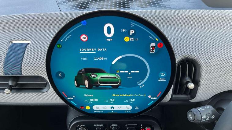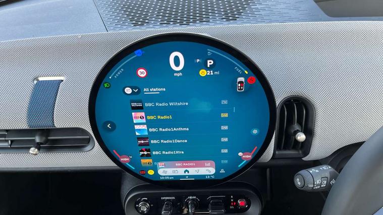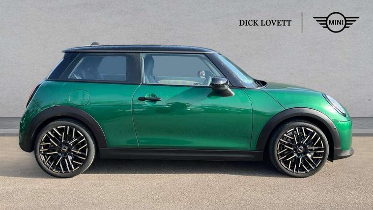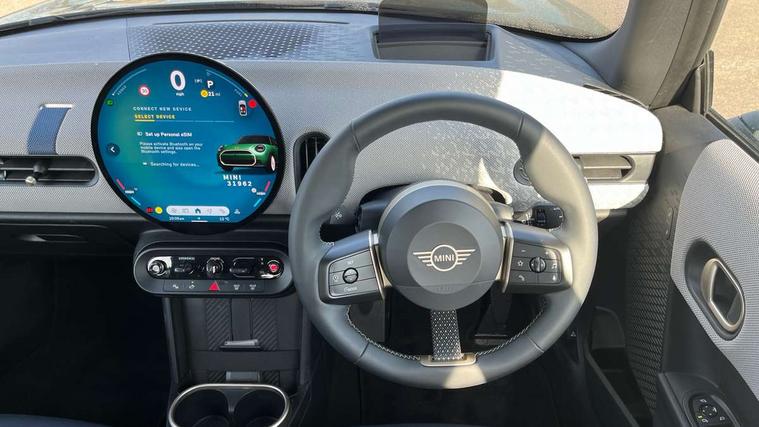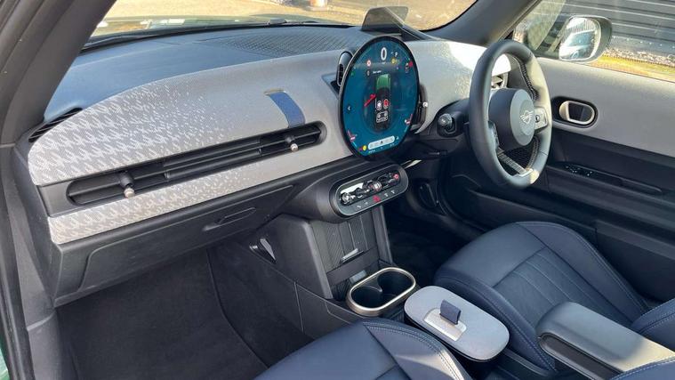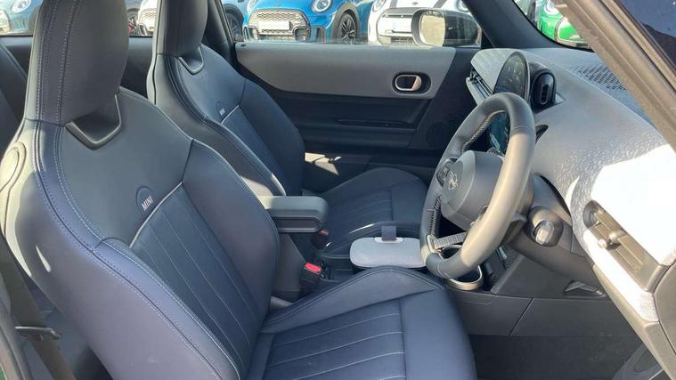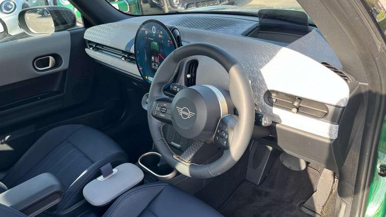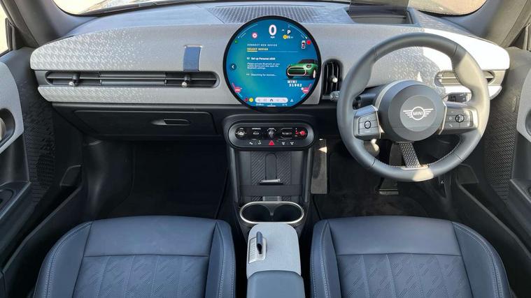 Central toggle bar, Circular OLED Screen, Compatible mobile phone bluetooth with audio streaming, Cruise control, Digital instrument cluster, Electro-mechanical speed dependant steering assistance, Emergency call service, MINI Experience Modes, Mini navigation system, On board computer, Service interval indicator, 7 speed steptronic transmission with double clutch, DAB Digital radio, Personal eSim, Auto headlights, Electric adjustable heated door mirrors, Electric front windows, Heated rear window, Heated windscreen washer jets, LED daytime running lights, LED Headlights, LED indicator lights, LED rear lights, Logos in Vibrant Silver, Rain sensor window wipers, Rear fog lights, Rear window wiper, Vibrant silver grille surround, 2 seat bench in second row, 2 zone automatic air conditioning, 60/40 rear seat bench, Ambient lighting, Cupholders, Dark headliner, Floor mats, Front and rear head restraints, Front compact armrest, Heated steering wheel, Height adjustable passenger seat, Lidded storage box in grey knit, Luggage compartment lighting, Single front passenger seat, Sport Vescin Steering Wheel, Sunvisors with vanity mirrors, Vescin synthetic leather upholstery, Driving assistant pack - Cooper Hatchback, Park assistant pack - Cooper Hatchback, 3 point seatbelts on all four seats, 6 Airbags - front, side, head and seat belt tensioners, Acoustic pedestrian protection, Anti-lock braking system (ABS), DSC - Dynamic Stability Control, Electronic parking brake, Front and rear disc brakes, Front ISOFIX (iSize), Front passenger airbag deactivation, Traction control, Tyre pressure monitoring system, Alarm, Immobiliser, Remote central locking, Blue decorative dash strap, Light Beige/Grey dash knit, Tyre repair kit,