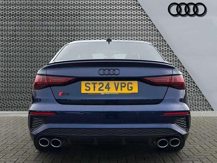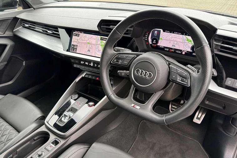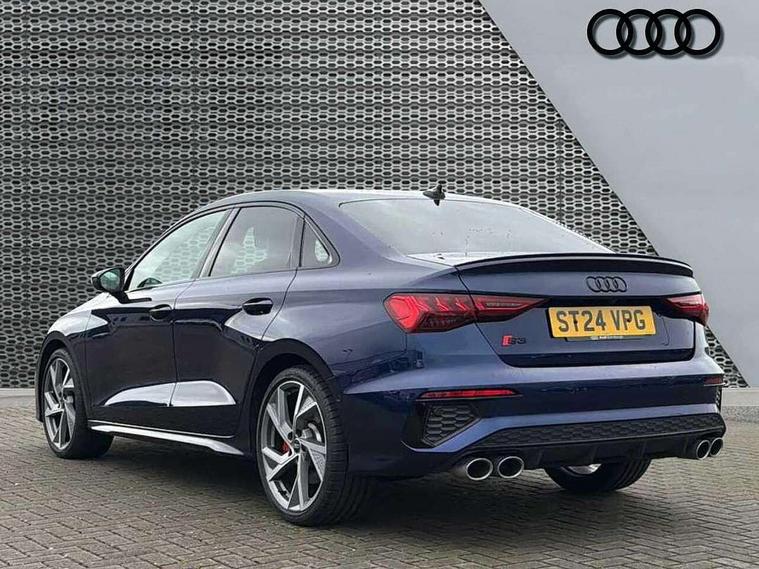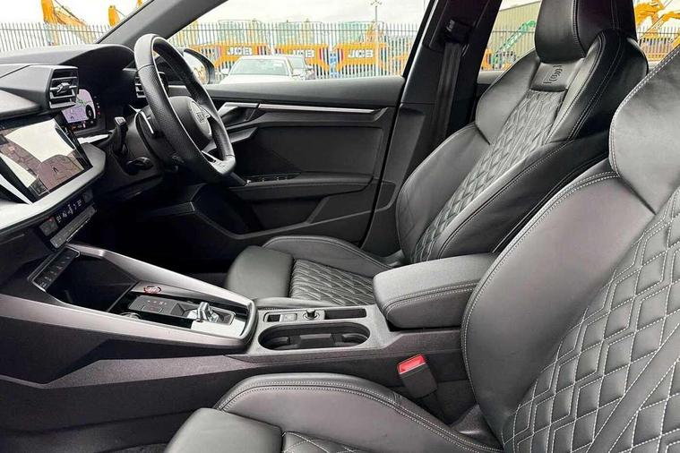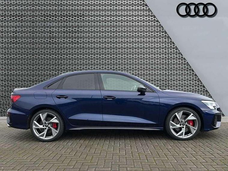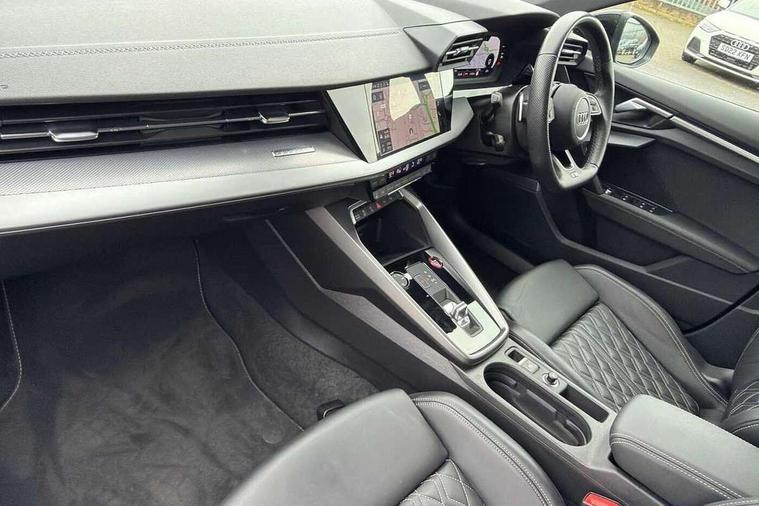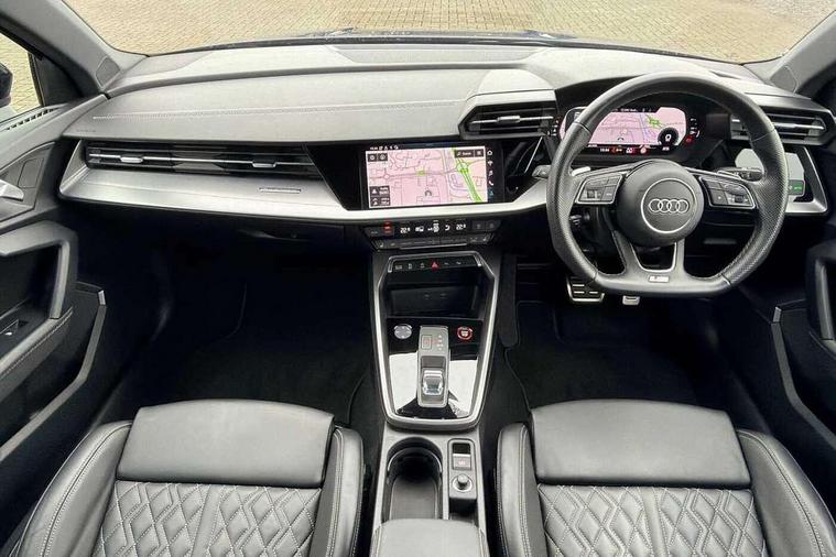 Audi drive select (Auto, Comfort, Dynamic, Efficiency and Individual), Audi smartphone interface, Audi Virtual Cockpit - 10.25" digital and colour instrument cluster, Automatic start/stop system with recuperation, Bluetooth interface, Camera based traffic sign recognition, Collision avoidance assistant, e-Call (emergency call), Lane departure warning system, MMI Navigation Plus with high resolution 10.1" colour touch screen display, Progressive steering, Service indicator, Trip computer, Voice control system with natural language interaction, Quattro permanent all wheel drive, S sport suspension with spring damper adjustment and lowering by 15mm, 2xUSB-C connection with data and charging functions, CD player, DAB Digital radio, 3rd brake light, Acoustic glass windscreen, Audi Beam uses LEDs to project the Audi logo onto the ground as you exit your S3, Auto dimming frameless rear view mirror, Dual branch oval twin tailpipes in chrome plated finish, Electrically adjustable/heated/folding/auto dimming door mirrors with integrated LED indications + kerb view function for passenger side, Front electric windows, Headlight washers, Illuminated door sills with aluminium inserts at the front with S logo, LED daytime running lights, LED headlights with LED rear lights and dynamic rear indicators, Light and rain sensors, Model and engine designation badges at rear, Privacy glass - dark tinted rear window, rear door and side windows, Rear boot, Rear electric windows, Rear side wing doors, 12V socket and storage compartment in front centre console, 3 seat bench in 2nd row, 3 spoke flat bottomed leather multifunction sport steering wheel with gear shift paddles, 4 way electrically adjustable lumbar support for driver and front passenger, 60/40 split folding rear seat bench, Black cloth headlining, Dual zone electronic climate control, Fine Nappa leather upholstery with front sports seats S embossed logo, Front and rear centre armrest in artificial leather, Front and rear headrests, Front/rear floor mats, Height and reach adjustable steering wheel, Interior lighting - glove compartment light and right hand side, Luggage compartment floor covering, Manual boot compartment lid, Manually adjustable front seats, Single front passenger seat, Stainless steel pedals and front footrest in black, Aluminium interior elements pack - A3, Black styling pack - A3 Saloon/S3, Body styling design pack - S3, Extended ambient lighting pack - A3/S3 Saloon, Storage pack - A3/S3 Saloon, Technology pack with parking assist - A3 Saloon, 3x3 point rear seat belts, Driver and front passenger airbag with passenger airbag deactivation, Electronic Stabilisation Control (ESC) including ABS, ASR and EDL, First aid kit with warning triangle and 2 safety vests, Front side airbags with head airbags and interaction airbag, Pre-sense front with pedestrian and cyclist detection, Seatbelt monitoring, Tyre pressure loss indicator, Anti theft alarm, Anti-theft wheel bolts, Electronically operated child locks, Immobiliser, Remote control central locking, Aluminium air vent surrounds, Dark spectrum aluminium inlays, accent surfaces in the dashboard and centre console in platinum grey silk effect paint finish,