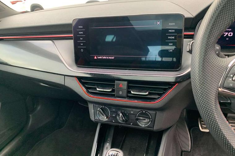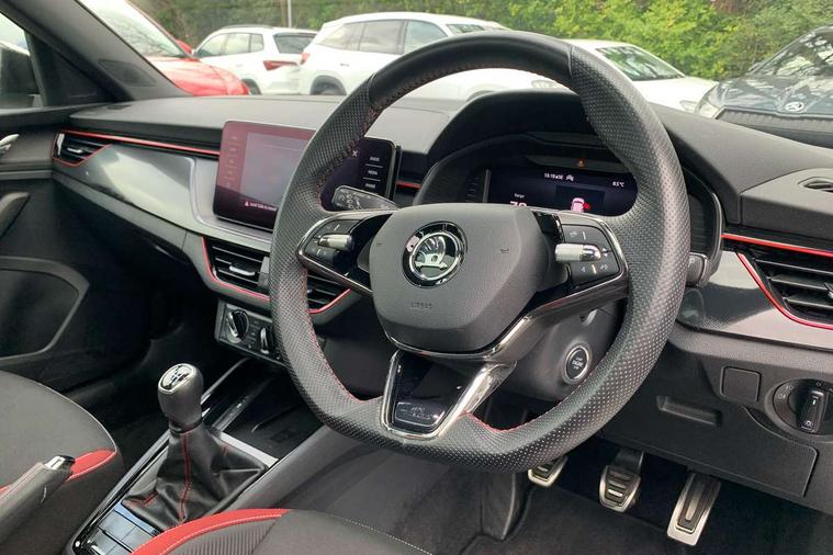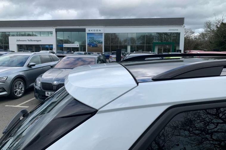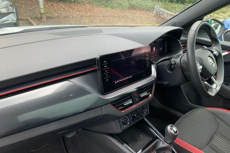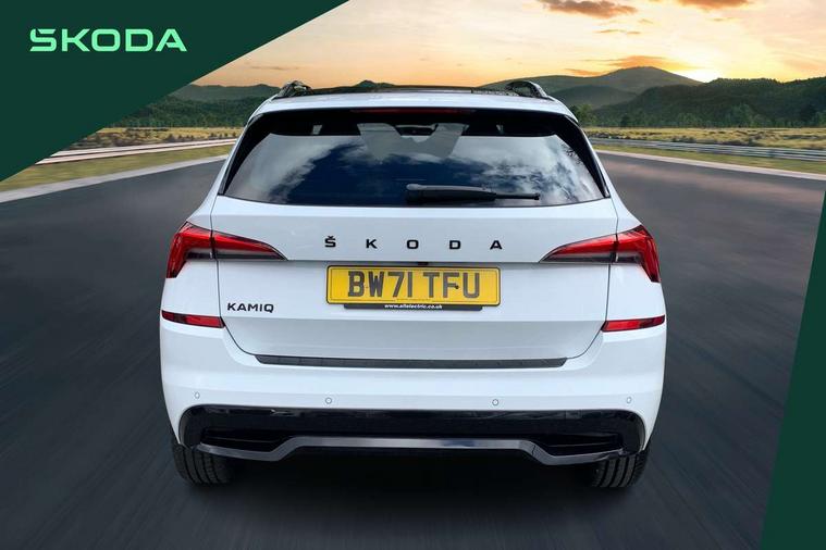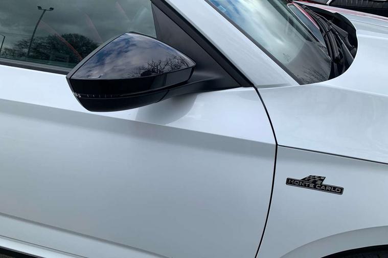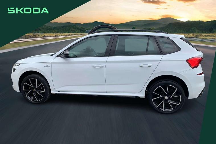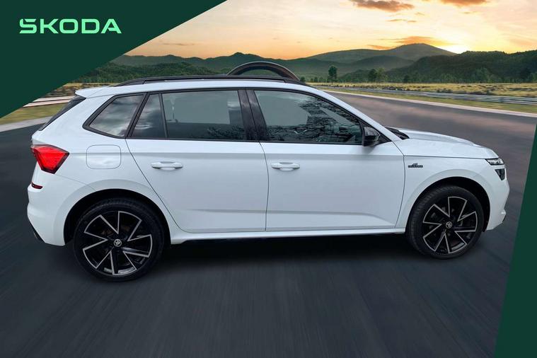 Amundsen satellite navigation with 9.2" touchscreen display, voice control, virtual cockpit and web radio, Bluetooth system, E-call, Front assist system, Gesture control, PAS, Service indicator, Speed limiter, Virtual cockpit with 10.25"display, Wireless SmartLink for apple car play, android auto and mirrorlink, 8 speakers, Auxiliary input socket, DAB Digital radio, Black door mirrors, Black radiator grille, Black rear diffuser, Body colour bumpers, Body colour door handles, Body colour roof spoiler, Boot lettering in black, Chrome grille surround, Dimming rear view mirror with black surround, Electrically adjustable and heated door mirrors, Front and rear electric windows, Front sport bumper, Full LED headlights with adaptive front light system, dynamic indicators, cornering function and fog lights, Headlight range control, Heated rear window, High functionality rear led lights with dynamic indicators, KAMIQ Door sills, Light sensors, Monte carlo plaque, Panoramic sunroof with black roof rails, Privacy glass, Rear fog lights, Rear side wing doors, Rear wiper, 12V Accessory socket in centre console, 3 seat bench in 2nd row, Aluminium pedals, Black ceiling for black/beige interior, Chrome inner door handles, Cloth upholstery, Front head restraints, Glove compartment with illumination, Ice scraper, Isofix child seat fittings on outer rear seats, ISOFIX on front passenger seat, Leather gear lever, Manual lumbar support for front seats, Rake/reach adjustable steering wheel, Reading lights, Single front passenger seat, Sports seats, Sun visors with illumination on front passenger, Textile floor mats, Third rear headrest, Top tether for front passenger seat, Umbrella in driver's door, 3x3 point rear seatbelts, Airbags - driver and front passenger, ESP, Front passenger airbag deactivation switch, Front side airbags with curtain airbags, Hill hold control, Manual parking brake, Manual rear child locks, One tone horn, Rear disc brakes, Seatbelt reminder for driver an co-driver, Traction control, Tyre pressure monitor, Anti-theft alarm system with interior monitoring, backup horn, towing protection and remote central locking with SAFE system, Anti-theft wheel bolts, Electronic engine immobilizer, Chrome air vent surrounds, 18" Vega alloy wheels in black,