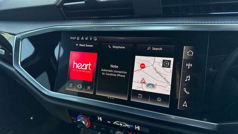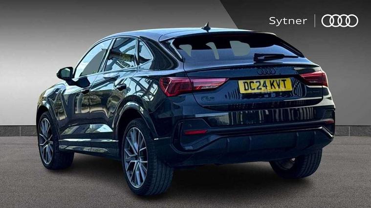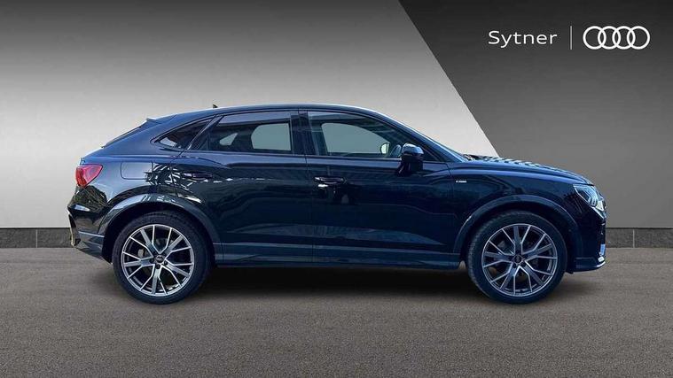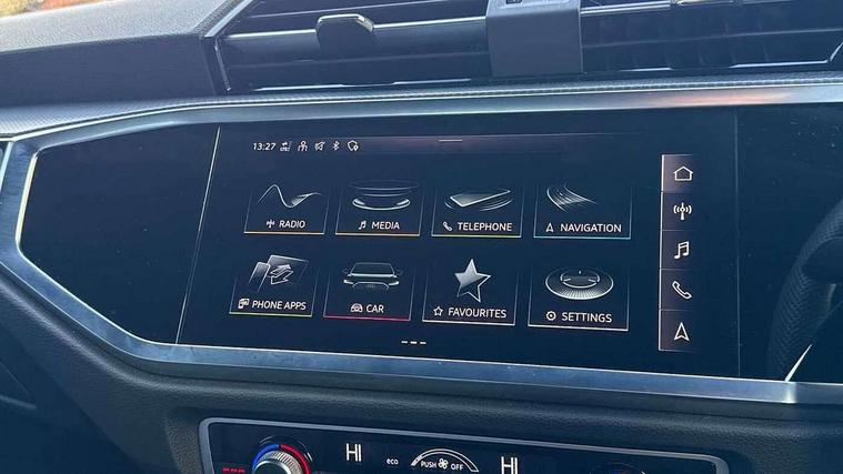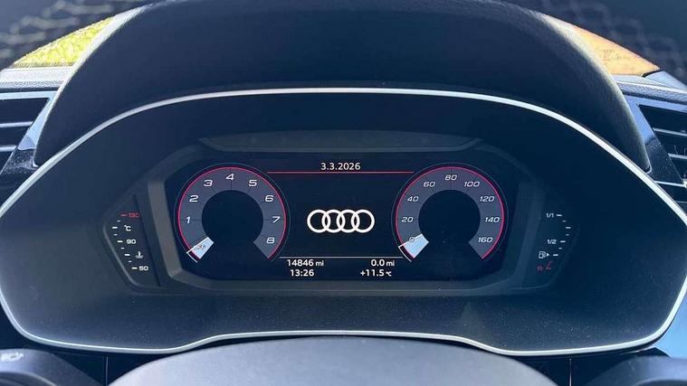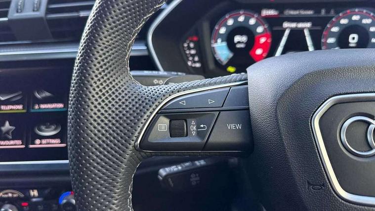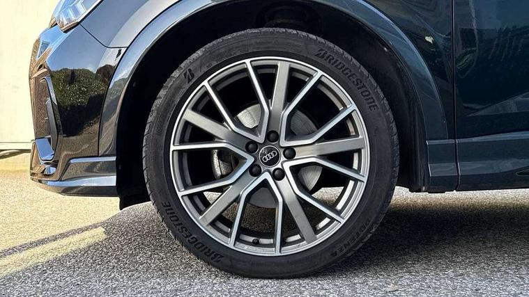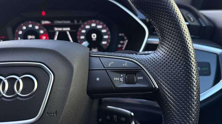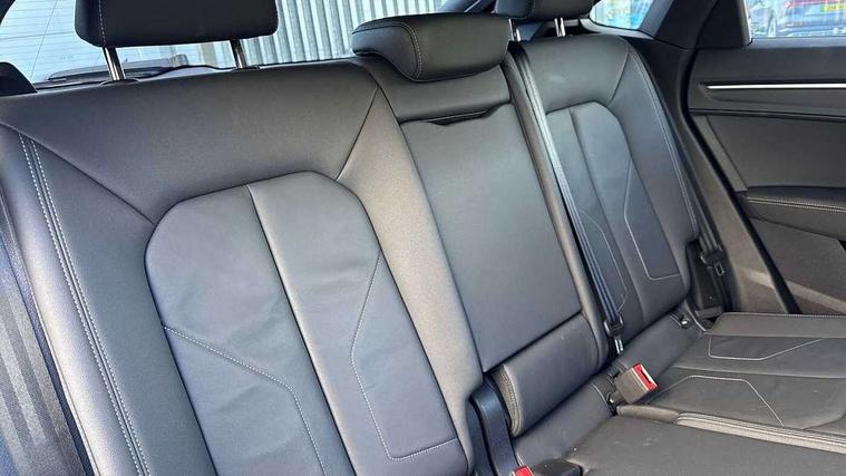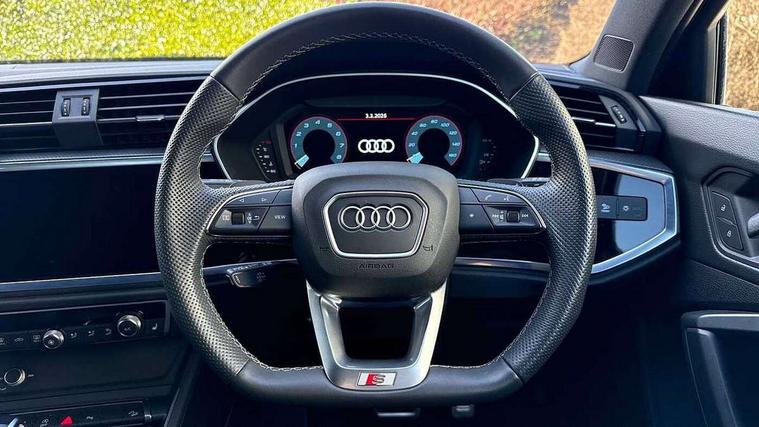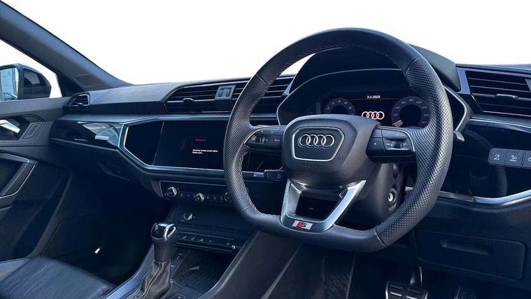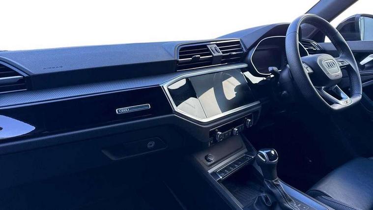 Audi connect safety and service, Audi drive select, Audi lane departure warning, Audi smartphone interface includes wireless Apple carplay/Android Auto, Audi Virtual Cockpit - 10.25" display, Bluetooth interface, Camera based traffic sign recognition, Distraction and Fatigue warning, Legal emergency call, MMI Navigation Plus with high resolution 10.1 inch touchscreen colour display, Power operated tailgate, Progressive steering, Service interval indicator, Start stop system with recuperation, Voice control system with natural language interaction, Sports suspension, 2 USB-C ports with charge and data functions, 6 passive loudspeakers, DAB digital radio module, Acoustic windscreen, Audi Beam uses LEDs to project the Audi logo onto the ground as you exit your Q3, Auto dimming door mirrors, Auto dimming frameless rear view mirror, Diffuser grille in grained matt black, Diffuser trim in selenite silver, Electrically folding, adjustable and heated door mirrors with integrated LED side indicators and kerb view function for passenger side, Front and rear electric windows, Front fog lights, Front underbody protection in manhattan grey paint finish, High gloss black finish B and C pillars, LED Dynamic rear indicators, LED headlights with LED daytime running lights, LED rear lights, LED third brake light, Privacy glass dark tinted rear and rear-side windows (from B-pillar backwards), Rain and light sensors, Rear side wing doors, Rear underbody protection in matt black, Rear wiper, S line front and rear bumpers and side skirts in contrasting Manhattan grey paint finish, Variable front intermittent wipers, 12V socket in rear centre console, 3 seat bench in 2nd row, 40:20:40 folding with manual adjustment for 60:40 forwards/backwards position and backrest angle, Adjustable rear seat bench/backrest with centre armrest and cupholder, Black cloth headlining, Dual zone electronic climate control, Electric lumbar support, Front and rear black floor mats with contrast stitching, Front and rear headrests, Front centre armrest, Height and reach adjustable steering wheel, Illuminated door sill trims with S logo, ISOFIX child seat mounting for front passenger with airbag deactivation and outer rear seat including top tether attachment point for outer rear seats, Luggage compartment sill protection in stainless steel, Manual front seats with height adjustment, Perforated leather gearknob, Single front passenger seat, Stainless steel pedals, Twin leather upholstery with front sport seats + S embossing, Black styling pack - Q3, Non smoking pack - Q3, 3x3 point rear seatbelts, 6 airbags - Driver, front passenger, curtain and side windows, Audi pre-sense front with pedestrain and cyclist recognition, Electrically operated child locks on rear doors, Electromechanical parking brake, Electronic stabilisation control including ABS, ASR and EDL, Front seatbelt reminder, Hill descent control, Hill hold assist, Pre sense basic, Seatbelt monitoring, Tyre pressure warning, Warning triangle and first aid kit, Anti theft alarm, Anti theft wheel bolts, Immobiliser, Remote central locking, Aluminium look interior elements, Detail dashboard around MMI touch colour display in glass look, black with surround in aluminium look, Leatherette door armrest, Piano black inlay,