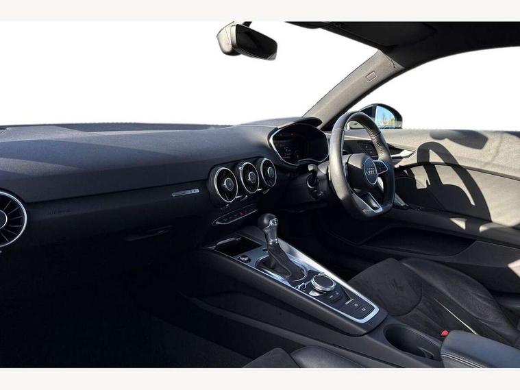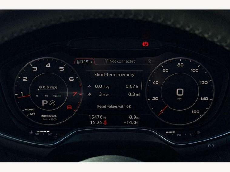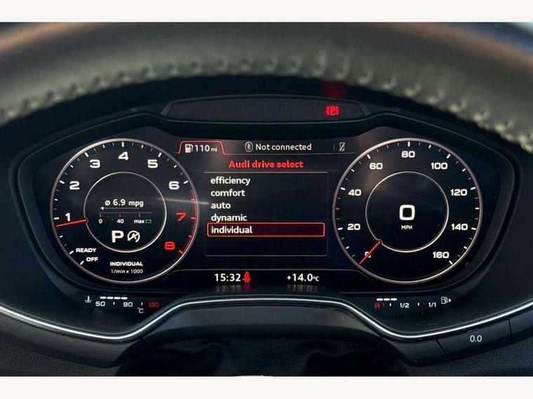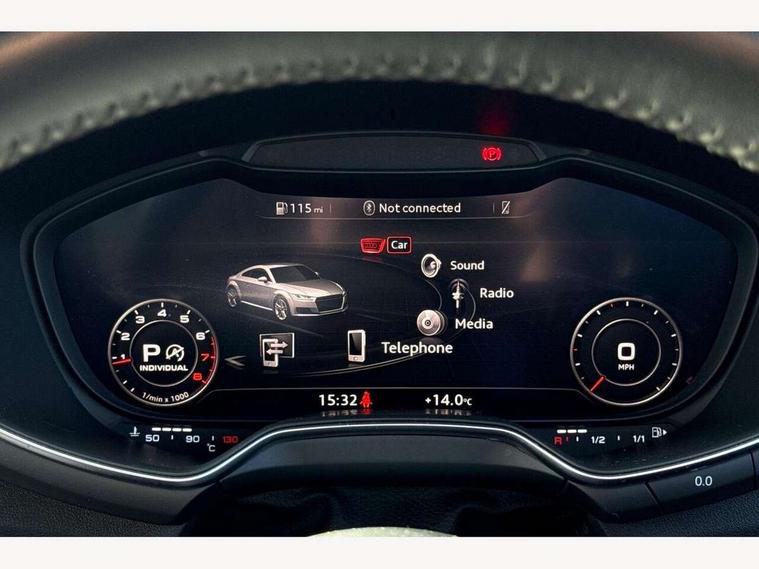 Audi drive select with 4 Pre configured modes, Audi smartphone interface, Audi virtual cockpit - 12.3" high-resolution LCD display with fully customisable instrument cluster, Cruise control + speed limiter, Emergency call service, Mobile phone preparation with bluetooth interface, Progressive power assisted steering, Service interval indicator, Start/Stop system with energy recuperation, TP memo, Sports suspension, AM/FM radio, Bluetooth audio streaming, DAB Digital radio, MMI Radio with CD player and SD/XC card slot, Auto dimming rear view mirror, Body colour bumpers, Body colour door mirrors, Electric folding door mirrors, Electric front windows, Electrically adjustable and heated door mirrors with integrated LED side indicators, Front fog lights, Green tinted heat insulating glass, LED 3rd brake light, Light and rain sensors, Rear boot, Retractable rear boot spoiler, Sunband for windscreen, Xenon headlights with LED daytime running lights with automatic headline range control + LED rear lights, brake lights and rear indicators, 12V socket, 2 rear seats, 3 spoke flat bottomed high multi-function leather sport steering wheel with gearshift paddles, Alcantara/Leather upholstery includes seat centre panels, door trim inserts in black Alcantara with side bolsters, head restraints in black leather, Aluminium door sill trims, Front centre armrest, Front passenger seat, Front sports seats, Heated front seats, Height/reach adjust steering wheel, Integrated head restraints, ISOFIX child seat mounting for front passenger seat with airbag deactivation, Manual adjustment of seat height, fore/aft position, seat angle, seat depth and backrest angle, Rear head restraints, Rear top tether child seat ISOFIX attachment, Split folding rear seat, Non smoking pack - TT/TT RS, Technology pack without Audi phone box - TT, 3 point front seat belts, ABS, ASR traction control, Curtain airbags, Driver and front passenger airbag with front passenger airbag deactivation, EDL traction control, Electromechanical parking brake, ESP, First aid kit, Front side airbags, Head airbags, Hill hold assist, Seatbelt warning, Tyre pressure loss indicator, Warning triangle, Anti theft alarm, Anti theft wheel bolts, Immobiliser, Keyless Go, Remote central locking, Aluminium design inlays, Tool kit, Tyre repair kit,