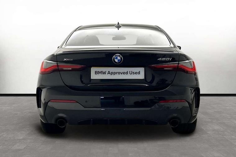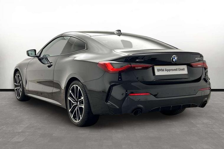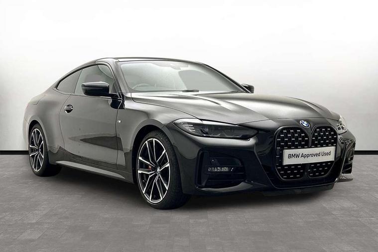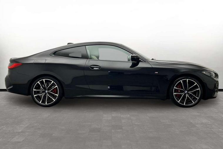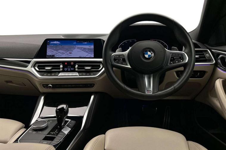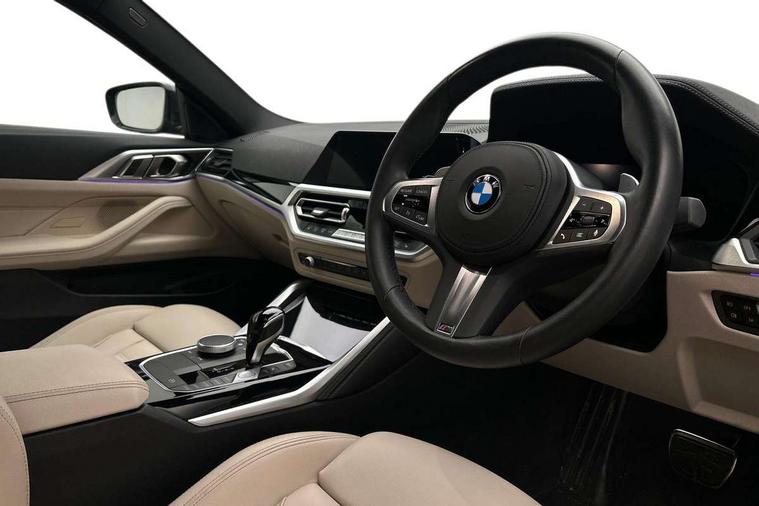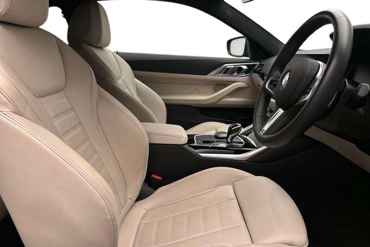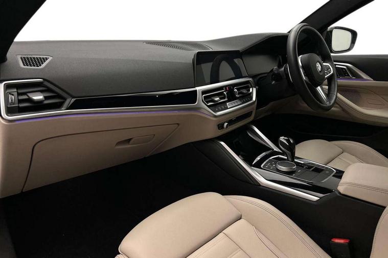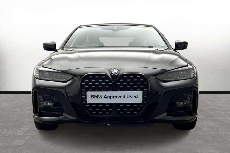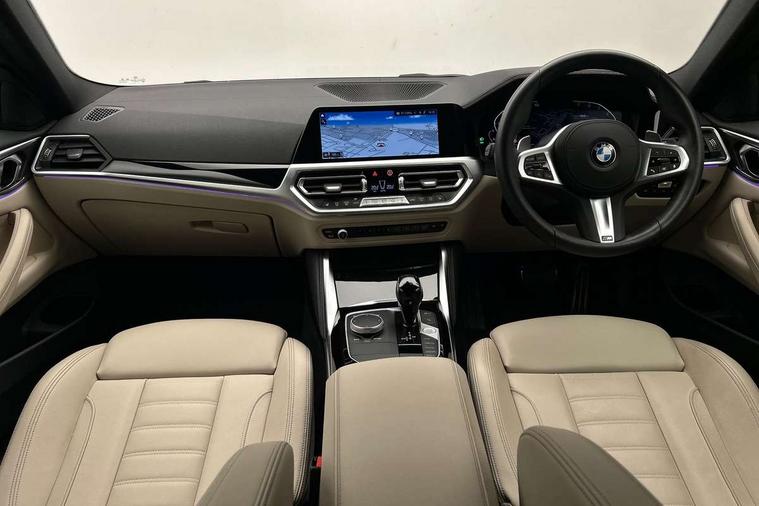 Active guard plus, Attentiveness assist, Auto start-stop, BMW ConnectedDrive online services, BMW iDrive controller on centre console, BMW Live Cockpit Professional Nav with 12.3" instrument display + 10.25" display, Intelligent Voice Assist, BMW OS 7, HDD, 2USB, 4G LTE connect, BMW service history, BMW Teleservices, Brake pad wear indicator in front and rear, Check Control warning system for monitoring of lights and door/luggage compartment open warning, Condition based service, Cruise control with speed limit function, Electric power steering with Servotronic steering optimised at all speed ranges, Gearshift time display in manual mode, Instrument cluster with speedometer with mph readout, tachometer, fuel gauge and oil temperature gauge, Integrated owners handbook, Oil sensor for level and grade, warning by check control system, On board computer - average speed, fuel consumption, outside temp display with acoustic warning, clock/date, service interval, odometer/trip meter, Optimum shift indicator, Run flat indicator, Shifting point display, Touch control functionality for BMW Live Cockpit Professional Nav, Variable sport steering, 8 speed automatic steptronic transmission with gearshift paddles, Balanced 50/50 weight distribution, Double joint spring strut front axle, Double VANOS, Drive performance control - ECO PRO, comfort and sport modes, Electronic differential lock control (EDLC), High precision injection, Low centre of gravity, M sport suspension, Petrol Particulate Filter, Stroke dependent dampers, VALVETRONIC engine management, 2x USB Type C ports in front centre console for charging and data transfer, 2x USB Type C ports in rear centre console for charging, DAB tuner, Electronic service booklet, Acoustic glazing, Automatic headlight beam throw control with load dependent regulating reaction, dynamic compensation of braking dive and acceleration squat, Automatic windscreen wipers and automatic headlight, Automatically dimming electrochromatic rear view mirror, BMW emblem on engine compartment lid and tailgate, BMW kidney grille with mesh grille front side of the nuggets in matt aluminium and frame in chrome high gloss, Body colour fuel filler flap, Body colour roof fin, Brushed aluminium inserts in the front door sill finishers with BMW designation, Door sill strips, Dynamic brake lights, Electric windows - front and rear, with open/close fingertip control, anti trap facility and comfort closing function all round, Exterior mirrors - electrically folding with anti-dazzle, Fading support, Follow me home headlights, Front and rear bumper system, Front apron plastic in body colour, Green tinted heat protection glazing, High gloss shadow line exterior trim, Illuminated bow type door handles in body colour drivers side with door lock, Interior rear view electrochromatic mirror with automatic anti dazzle function, LED daytime running lights, LED front fog lights, LED front indicators, Licence plate panel integrated into front bumper and tailgate, Lightweight engineering, M designation on front side panels, left and right, M sport rear boot spoiler with body colour gurney, Model designation on right side of tailgate, One piece front bumper cover including towing eye cover in body colour, Preparation for high beam assistant, Rear boot, Reversing light, Side frame decorative moulding black matt, Two part LED tailights in L-shape with components in smoked glass, brake light, LED turn indicator and rear fog light, Visible exhaust tailpipe finisher, Visible VIN plate, Welcome lights in interior and door handle area, Widened track and increased camber values for max transverse dynamics, agility and steering precision, Window recess cover black high gloss, Windscreen wipers with integrated heated washing jets, 12V power socket in front centre console, 2 front cupholder in centre console with clamping elements and matt black inlay, 2 Rear seat headrests, 2 seat bench in second row, 3 spoke M sport leather multifunction steering wheel, 3 zone automatic air conditioning, 4 pieces lashing eyelets in luggage compartment, 40:20:40 split folding rear seat and rear centre armrest with two cupholders, Anthracite headlining, Armrest integrated in front and rear door trim + front centre console armrest, BMW ID, Driver seat backrest width adjustment, Four grab handles integrated in roof lining, Front and rear door pockets, Front and rear reading lights, Front sport seats, Heated driver and front passenger seats, Height adjustable front headrests, Height adjustable mechanically and infinitely variable steering column, Illuminated armrest storage compartment, Illuminated glove compartment with separate small compartment, Make-up mirror lights, Single front passenger seat, Storage compartment in rear centre console, Sunvisors with illuminated vanity mirrors and ticket pocket, Toolkit located in luggage compartment, Velour front floor mats, Vernasca leather upholstery, Ambient lighting pack - 4 Series, Connected professional pack - 4 Series, M sport exterior styling pack - 4 Series, 2 x 3-point rear seatbelts, Battery safety cut-off, BMW emergency call, Brake energy regeneration, Braking pre-tensioning, Child seat ISOFIX attachment for the two outer rear seats, Coasting in idle in ECO PRO mode, Cornering brake control (CBC), Crash sensor activating of airbags, Unlocking doors, hazard warning lights, interior light, safety battery terminal, Driver and front passenger side airbags, integrated in the door side seat backrest bolsters for all seat variants, Driver/Front Passenger airbags, Dry braking, Dynamic brake control, Dynamic stability control + (DSC+) - Anti-lock Braking System (ABS) with brake assist and cornering brake control + Automatic Stability Control (ASC), Dynamic Traction Control - DTC, Electric parking brake including automatic hold function and automatic release of the parking brake when driving off, Front and rear ventilated brake disc, Front passenger manual airbag deactivation, Head airb