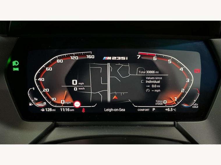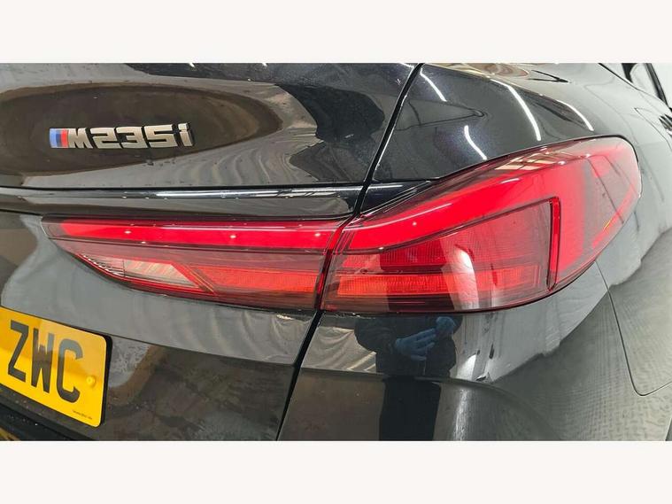 Active guard plus, Attentiveness assist, Auto start-stop, BMW Intelligent Personal Assistant, BMW Live Cockpit Professional with 10.25" high resolution instrument and control display, BMW Online services, BMW operating system with 7.0 mid interface, BMW Teleservices, Check Control warning system for monitoring of lights and door/luggage compartment open warning, Electro hydraulically controlled multi plate clutch in rear axle, Energy efficient operating strategy, iDrive controller with touch function and 7 short cut favourite buttons on centre console, Integrated navigation data with map data via USB +features such as 3D landmarks and micro city models, Integrated owners handbook, Intelligent voice assistant, M Sport steering with M235i xDrive M performance specific settings, On board computer - average speed+fuel consumption, service interval, clock/date, odometer/trip meter, outside temperature display and ice warning, Optimum shift indicator, Personal Profile, Pull away assistant, Speed limiting function, 2 balance shafts, 8 speed sport automatic transmission with electronic selector lever, auto P function, coasting idle, race track, sport, gearchange display manual mode, Aluminium lightweight construction, Double VANOS, Drive performance control with ECO PRO comfort + sport mode, Electronic differential lock, Engine cover with M performance designation, High precision injection, Larger fuel tank capacity (50 litres), Launch control, M235i specific heavily de-throttled engine intake air guide, M235i specific high-performance cooling package, M235i specific larger turbocharger with integrated divert-air valve, Performance Control, Petrol Particulate Filter, Power transmission of front wheel drive on the rear axle via angle transmission on the front axle differential and two part cardan shaft, VALVETRONIC engine management, Variable, stepless and infinitely adjustable distribution of drive torque between the front and rear axles, xDrive intelligent all wheel drive with M235i specific reinforced components, 2x USB Type C ports (for charging and data transfer), 4G LTE Connectivity with hard wied 4G network sim card, DAB digital radio, MP3 players and RDS double tuner, Automatically dimming rear view mirror, Body colour door handles, Direction indicator side lights integrated exterior mirrors, Electric windows - front and rear, with open/close fingertip control and trap release, Exterior mirrors - electrically folding with anti-dazzle, Fading support, Follow me home headlights, Front and rear bumper system with replaceable deformation elements, Front door sill finishers in black plastic with M235i designation, Heated, electrically adjustable exterior mirror aspheric on driver side, convex on passenger side, High gloss black B pillar finish, High gloss shadow line exterior trim, High level third brake light, LED daytime running lights, LED front fog lights, Lightweight engineering, M Performance exhaust system with valve control and minimised exhaust back pressure, M rear spoiler, Model designation on right side of tailgate includes xDrive designation onleft handside for M235i xDrive, Preparation for high beam assistant, Rain sensor with automatic headlight activation, Rear fog lights, Reinforced crank drive, new pistons and adapted con rods, Reversing light in rear light cluster, Welcome lighting, 12V power socket in centre console, 2 cupholders in front centre console, 3 rear seat head restraints, 3 spoke M sports design leather steering wheel finished in nappa leather with specific M badge, Additional under floor storage in luggage compartment, Anthracite finished floor mats with contrasting surround, Anthracite headlining, Automatic two zone climate control air conditioning, Child seat ISOFIX attachment for two outer rear seats and front passenger seat with anchorage points, Conditioned based service, Driver and front passenger seat heating, Front and rear door pockets including bottle trays, Front and rear side armrests integrated into door trim, Front armrest foldable with integrated storage compartment, Front centre interior light over interior mirror and rear centre automatic interior light when door is opened/ignition switched off or via remote key, Front head restraints, Front M Sport seats, Glove compartment, Glovebox with light, Luggage compartment lighting, Manually adjustment steering wheel column, Multi-function controls for steering wheel, Shift-by-wire selector shift, Steering wheel paddles, Sun visors with vanity mirrors and insert tab, Through loading system with 40/20/40 split folding rear seat, Two lashing eyes, Additional interior lighting pack - 2 Series Gran Coupe, Connected pack professional - 2 Series Gran Coupe, Extended storage pack - 2 Series Gran Coupe, M Sport exterior styling aerodynamics pack - 2 Series Gran Coupe 235i, 2 tone horn, Airbag - Front driver and passenger, front and rear head, front side, curtain head protection, manual deactivation of front passenger airbag possible, Anti lock braking system (ABS) with cornering brake control, BMW emergency call, Brake drying, Braking readiness, Crash sensor activating of airbags, Unlocking doors, hazard warning lights, interior light, safety battery terminal, Dynamic stability control + (DSC+), Dynamic Traction Control - DTC, Electrically operated hand brake, Integrated torsen mechanical limited slip differential on front axle, M Sport braking system in blue high gloss + blue painted brake calipers with M designation, M sport seatbelt, Rear brake discs, Rear child proof door locks, Seat belt security check for driver and front passenger, Seatbelt warning, Side impact protection, Three point seat belts on all seats including front belt stopper, pyrotechnic belt tensioners and belt force limiters, Trailer stability control, Tyre pressure monitoring system, Ventilated front disc brakes, Warning triangle and first aid kit, Central locking switch for all doors, fuel filler cap and luggage compartment, Deadlocking f