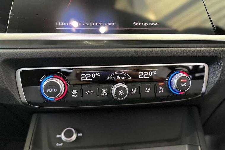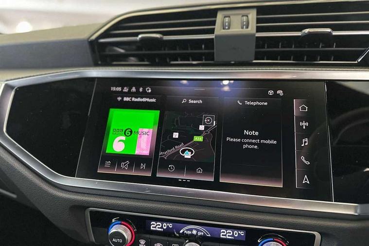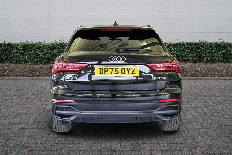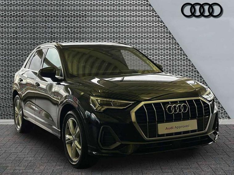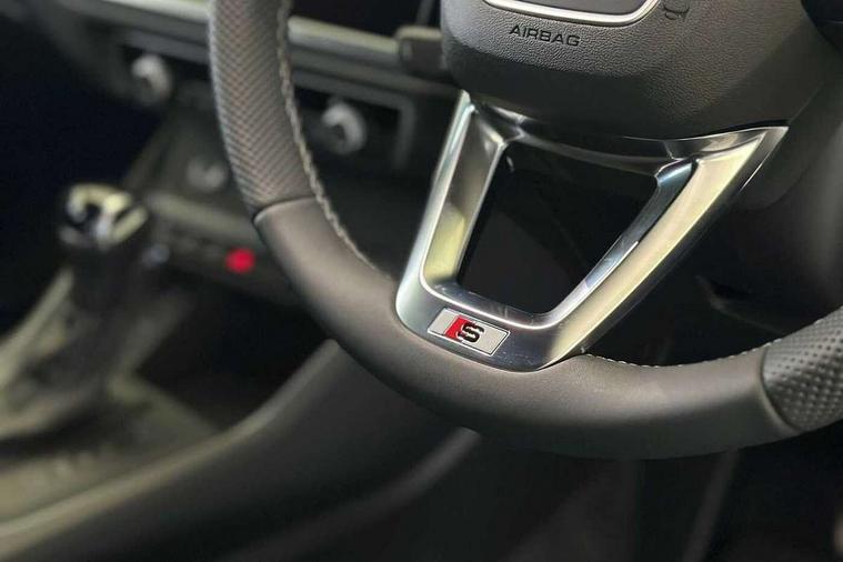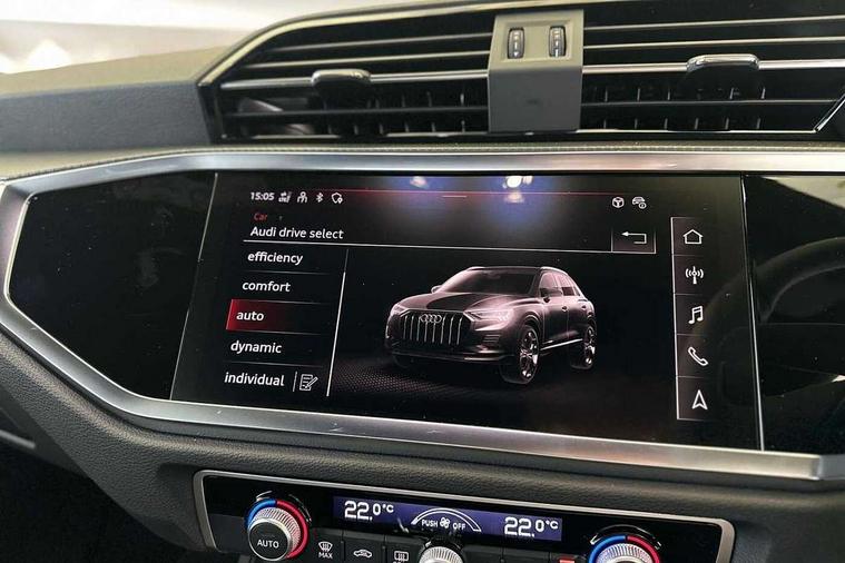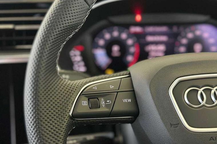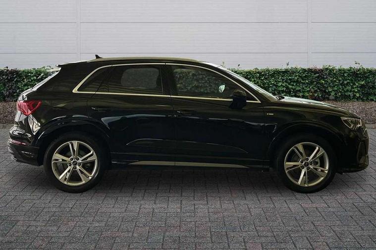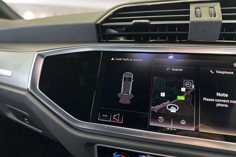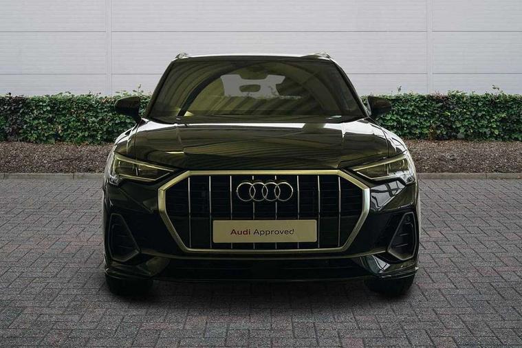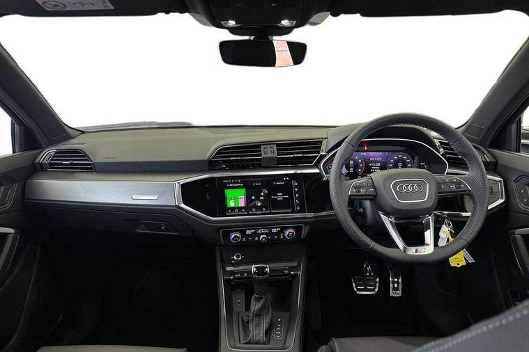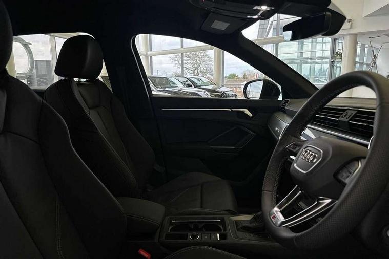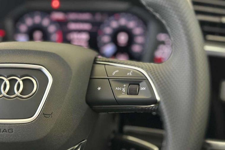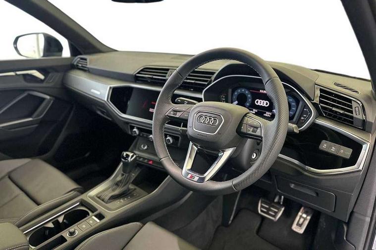 Amazon alexa Integration, Audi connect safety and service, Audi drive select, Audi lane departure warning, Audi Virtual Cockpit - 10.25" display, Bluetooth interface, Camera based traffic sign recognition, Distraction and Fatigue warning, Legal emergency call, MMI Navigation Plus with high resolution 10.1 inch touchscreen colour display, Power operated tailgate, Progressive steering, Service interval indicator, Smartphone interface includes wireless Apple carplay/Android Auto, Start stop system with recuperation, Voice control system with natural language interaction, Sports suspension, 2 USB-C ports with charge and data functions, 6 passive loudspeakers, DAB digital radio module, Acoustic windscreen, Aluminium roof rails, Aluminium window trim, Anthracite black radiator grille, Auto dimming door mirrors, Auto dimming frameless rear view mirror, Body colour front spoiler blade, Electrically folding, adjustable and heated door mirrors with integrated LED side indicators and kerb view function for passenger side, Front and rear electric windows, Front fog lights, Front side air inlets in matt platinum grey, Grille vertical bars in aluminium silver/Matt, High gloss black finish B and C pillars, LED Dynamic rear indicators, LED headlights with LED daytime running lights, LED rear lights, LED third brake light, Privacy glass dark tinted rear and rear-side windows (from B-pillar backwards), Rain and light sensors, Rear diffuser grille in grained matt black, Rear diffuser strip in matt anthracite black, Rear side wing doors, Rear wiper, S line badges on front wings, S Line front and rear bumpers and side skirts, Side skirt insert in matt Platinium grey, Variable front intermittent wipers, 12V socket in rear centre console, 3 seat bench in 2nd row, 3 spoke leather multifunction steering wheel features S badging and grips in perforated leather with contrast stitching, 40:20:40 folding with manual adjustment for 60:40 forwards/backwards position and backrest angle, Adjustable rear seat bench/backrest with centre armrest and cupholder, Black carpet mats, Black cloth headlining, Dual zone electronic climate control, Electric lumbar support, Front and rear black floor mats with contrast stitching in rock grey, Front and rear headrests, Front centre armrest, Height and reach adjustable steering wheel, Horizontal trim strip in matt platinum grey, Illuminated door sill trims with S logo, ISOFIX child seat mounting for front passenger with airbag deactivation and outer rear seat including top tether attachment point for outer rear seats, Luggage compartment sill protection in stainless steel, Manual front seats with height adjustment, Perforated leather gearknob, Single front passenger seat, Stainless steel pedals, Twin leather upholstery with front sport seats + S embossing, Non smoking pack - Q3, 3x3 point rear seatbelts, 6 airbags - Driver, front passenger, curtain and side windows, Audi pre-sense front with pedestrain and cyclist recognition, Electrically operated child locks on rear doors, Electromechanical parking brake, Electronic stabilisation control including ABS, ASR and EDL, Front seatbelt reminder, Hill descent control, Hill hold assist, Pre sense basic, Seatbelt monitoring, Tyre pressure warning, Warning triangle and first aid kit, Anti theft wheel bolts, Immobiliser, Remote central locking, Thatcham approved category 1 anti theft alarm, Aluminium look interior elements, Dark matt brushed aluminium inlay, Detail dashboard around MMI touch colour display in glass look, black with surround in aluminium look, Leatherette door armrest,