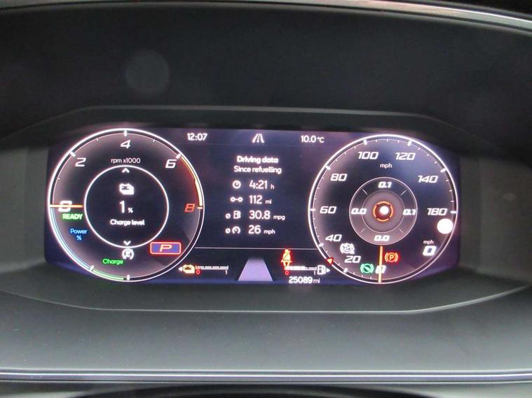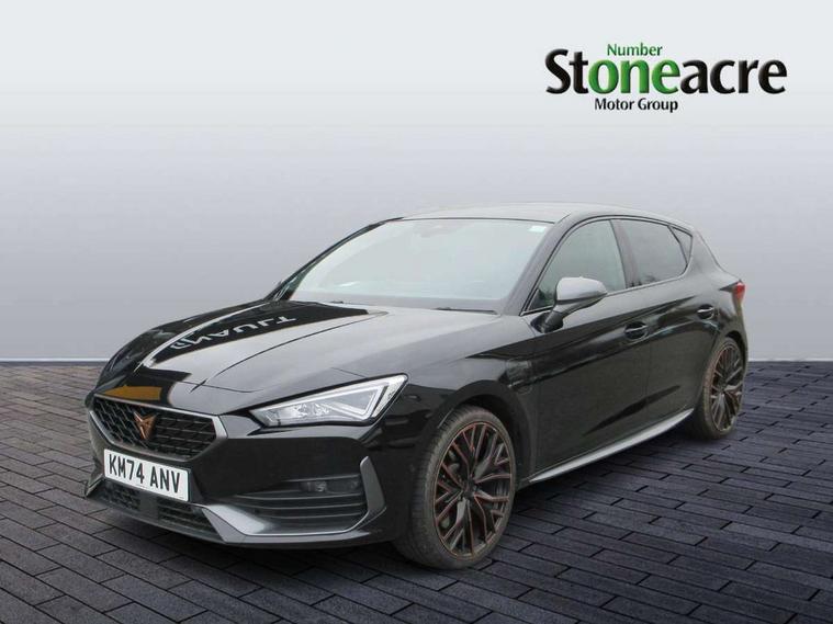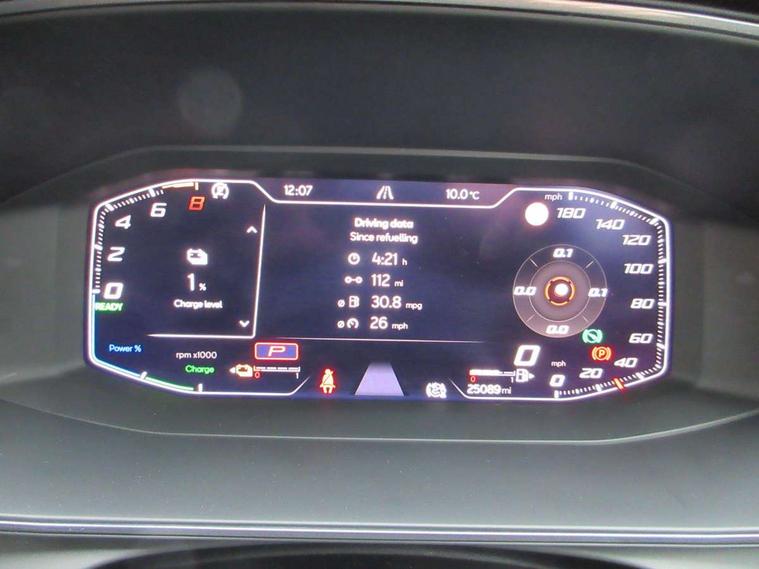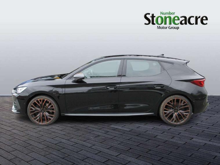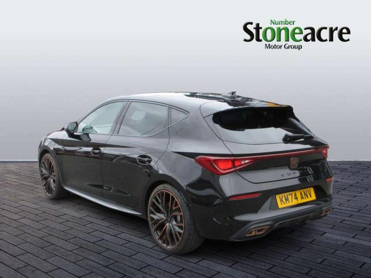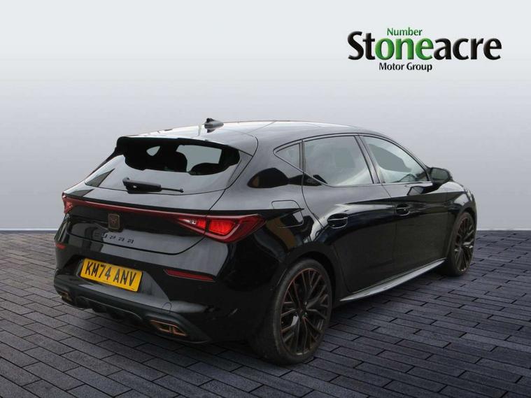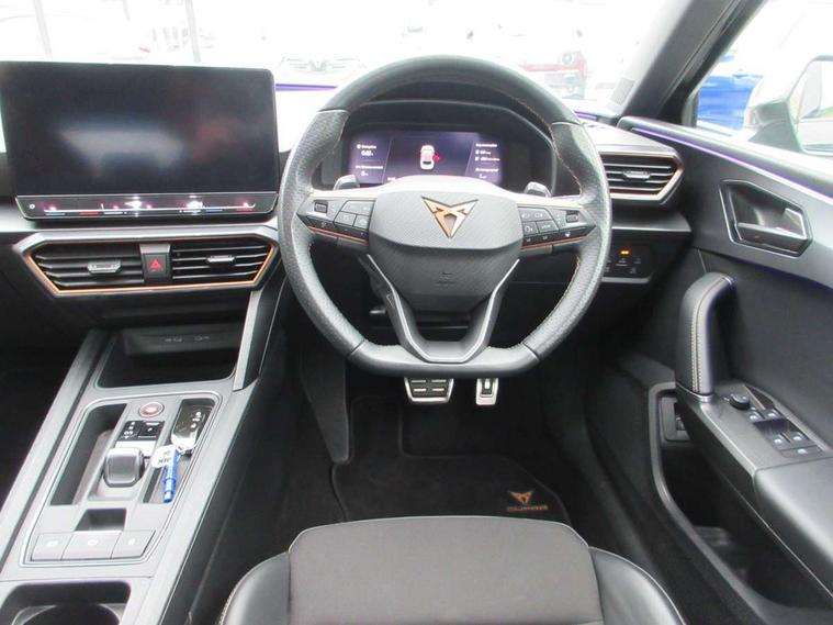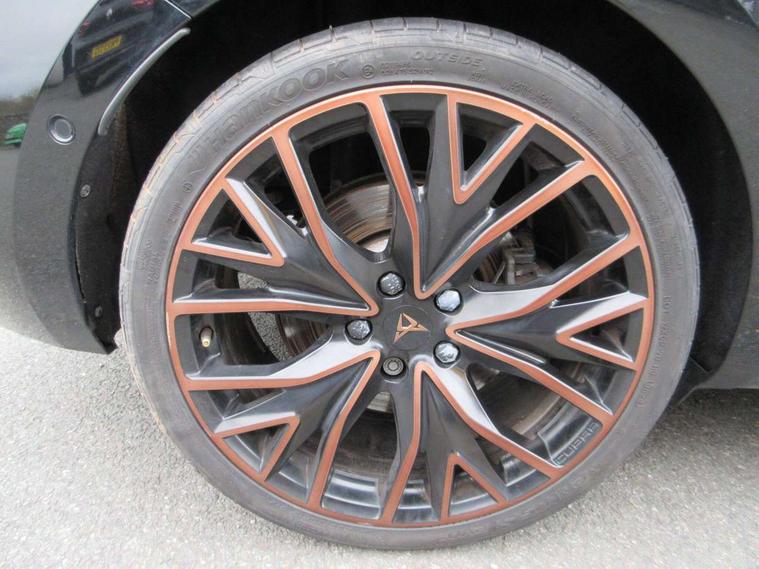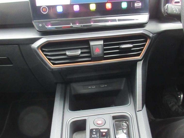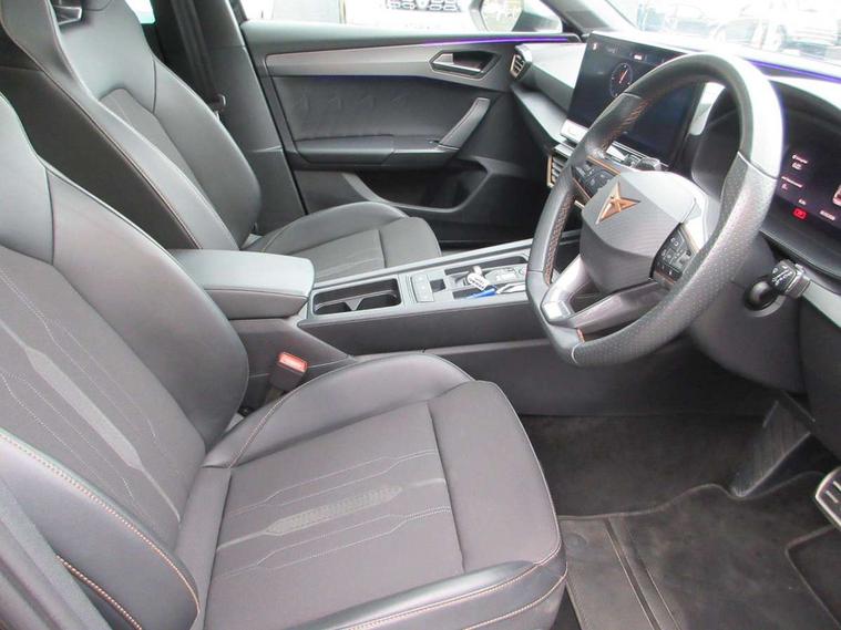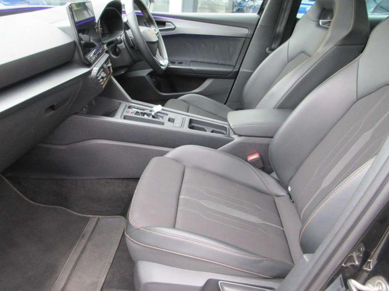 CUPRA drive profile selection with 4 modes (Comfort/Cupra/Sport/Individual), throttle response and gearshift mode, Digital cockpit, E-call, Front assist with forward collision warning braking reaction to vehicles, pedestrians and cyclists, Full link smartphone integration with Mirror Link, wireless Apple CarPlay and wired Google Android Auto, Lane assist, Lockable tailgate, Park assist (inc front/rear parking sensors), Rear view camera, RPM, trip computer, outside temp gauge, instrument light brightness, low fuel warning light, lights on reminder, gearshift indicator, Service interval indicator, Start/stop system with regenerative braking, Wireless phone charger, 10 amp mode 2 charging cable, 16 amp mode 3 charging cable, 3.6 kw On-board charger, Standard suspension, XDS electronic differential lock and dynamic traction support, Auxiliary input socket, Auto dimming rear view mirror, Body colour door handles, Body coloured bumpers, Cupra sports bumpers, Dark tinted rear windows, Electric front/rear windows, Electrically adjustable, heated and folding door mirrors, LED front fog lamps with cornering function, LED headlights with dynamic turn signals, tail lights, rear fog lights with rear coast to coast lighting, Panoramic sunroof, Rain sensing wipers, Rear diffuser with twin exhaust pipe on each side with simulated exhausts, Rear side wing doors, Rear wash/wipe, Separate daytime running light with automatic headlight control and coming home feature, Third brake light, 12v power supply in centre console, 3 seat bench in 2nd row, 5 headrests, 60/40 split rear bench seat with armrest, Ambient lighting (glovebox, footwell, ambient lighting multicoloured), Black headlining, CUPRA Leather flat bottomed, heated, perforated steering and gearshift paddles, Cupra sports pedals, Driver/passenger manual seat height adjustment, Dust/pollen filter, Folding boot cover, Four x USB Type C ports (2 in front and 2 in rear), Front and rear reading lights X 4, Front centre armrest, Front seats manual lumbar adjustment, Height/reach adjust steering wheel, Illuminated interior front door sills, Interior wraparound lighting, ISOFIX points in outer rear seats with top tether anchorage points, Luggage tie-down hooks, PVC/Cloth upholstery with copper stitching + Cupra embossed logo on headrest, Single front passenger seat, Sports bucket seats, Storage pockets on rear of front seats, Sunvisors with illuminated mirror, Three zone climate control, Design pack - Cupra Leon, Dynamic and comfort pack - Leon Cupra, Media system plus with navigation pack - Leon Cupra, 3 point seatbelts on all rear seats, ABS, Brake control system - ESC and brake booster, Child proof door locks, Cupra black brake calipers, Driver and front passenger airbags with front passenger airbag de-activation, front side and curtain airbags, Electronic parking brake, Extended safety system - seat belt tensioner, window closure and hazard lights, Hill hold control, Rear disc brakes, Seat belt reminder for front and rear seats, Tiredness recognition system, Tyre pressure monitoring system, Anti theft alarm system with interior monitoring in cab, backup horn and towing protection, KESSY Advanced - Keyless start, keyless entry, Locking wheel bolts, Chrome and copper interior detailing, 19" Performance satin black and copper alloy wheels with 91Y tyres, Breakdown kit, Tool kit,