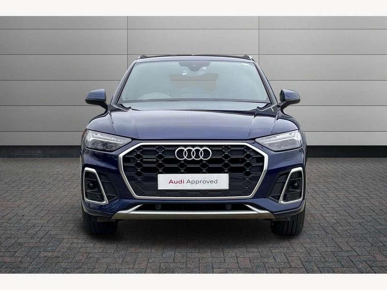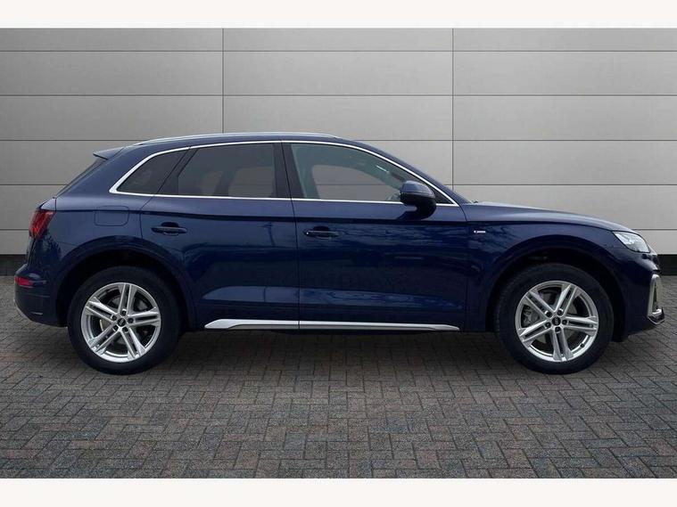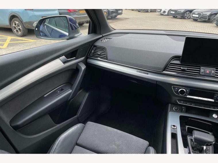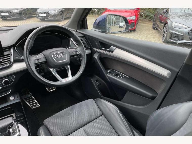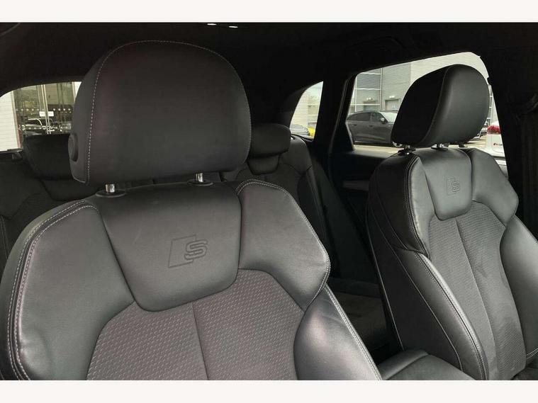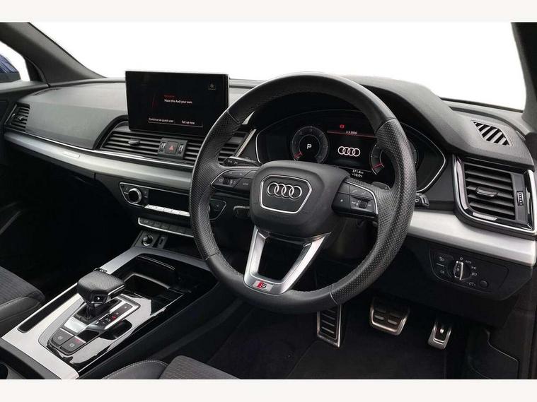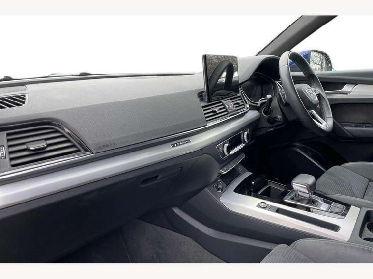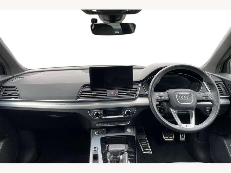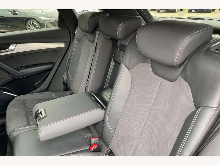 Acoustic front and rear parking sensor, Audi connect safety and service (e-call), Audi connect with Amazon Alexa Integration, Audi drive select, Audi virtual cockpit plus with 12.3" screen and three different layout designs, Audi wireless smartphone interface, Automatic start-stop system with coasting functionality and efficiency programme, Bluetooth interface, Electro - mechanical power assisted steering, MMI navigation plus with 10.1" touch screen, Power tailgate, Reversing camera, Service interval indicator, Voice control system with Audi hotword activation "Hey Audi", Diesel particulate filter, Quattro on demand, S line sports suspension, 2 x USB charging port with aux input socket, 8 loudspeakers, DAB Digital radio, Acoustic windscreen, Aluminium roof rails, Audi matrix LED headlights with dynamic front and rear indicators, Auto dimming door mirrors, Auto dimming frameless rear view mirror, Automatic headlight adjustment, Automatic headlights and windscreen wipers, Body colour bumpers, Body colour door mirrors, Body colour rear diffuser with matt aluminium silver surrounds, Body colour underbody protection, Chrome plated exhaust trims, Daytime running lights, Door sills in Selenite silver, Electric adjustable/heated/folding door mirrors, Front air inlet surrounds in aluminium, Front and rear electric windows, Front radiator grille in honeycomb design, Headlight washers, High level LED brake light, Lower bumpers painted in contrast Manhattan grey, Rear chrome trim strip below lights, Rear privacy glass and rear side windows, Rear side wing doors, Rear wiper, Roof bars, S Line badges on the front wings, S Line front and rear bumpers, S Line rear spoiler, S Line side skirts, 3 rear headrests, 3 spoke leather multifunction steering wheel with S badging perforated leather grips, 40:20:40 split folding 3 rear bench seat in 2nd row with rear centre armrest, Black cloth headlining, Comfort front centre armrest, Contrast stitching on seats, steering wheel and gear lever gaiter, Deluxe 3 zone electronic climate control, Front/rear floor mats, Gear lever in black leather, Heated front seats, Height adjustable front head restraints, Height/reach adjustable steering column, Illuminated door sill trims with S logo, Luggage compartment cover, Manual seat adjustment with 4-way electric lumbar support, Removable luggage compartment floor, Single front passenger seat, Stainless steel pedals, Sunvisors with vanity mirrors, High gloss pack - Q5, LED interior light pack - Q5, 3 point seatbelts on all seats, 6 airbags - Driver, front passenger, curtain and side airbags, Electrically operated child locks on rear doors, Electromechanical parking brake, Electronic stabilisation control including ABS, ASR and EDL, First aid kit with warning triangle and vests, Front passenger airbag deactivation, Hill descent control, Hill hold assist, ISOFIX child seat mounting for front passenger seat and ISOFIX child seat mounting with Top Tether for outer rear seats, Multi collision brake assist, Pop-up bonnet for pedestrian protection, Pre sense city, Seat belt force limiter, Seatbelt monitoring, Tyre pressure warning, Anti theft alarm, Anti-theft wheel bolts, Keyless Go access/ignition system, Remote central locking, Air vents inserts and centre console in gloss black, Matt brushed aluminium inlays,