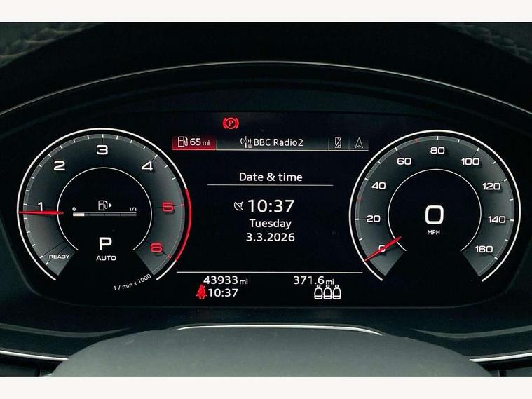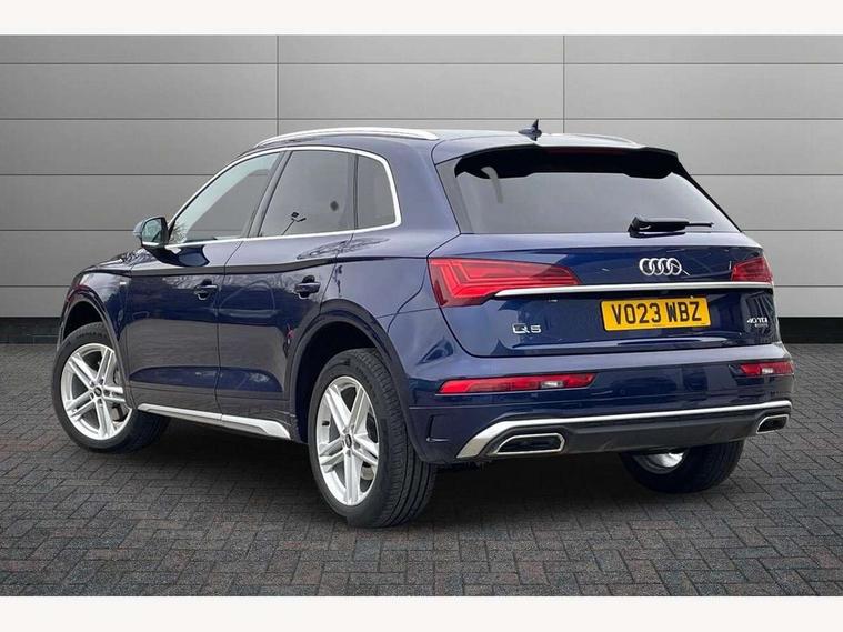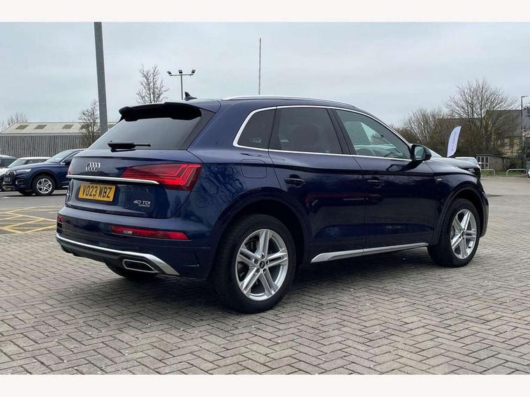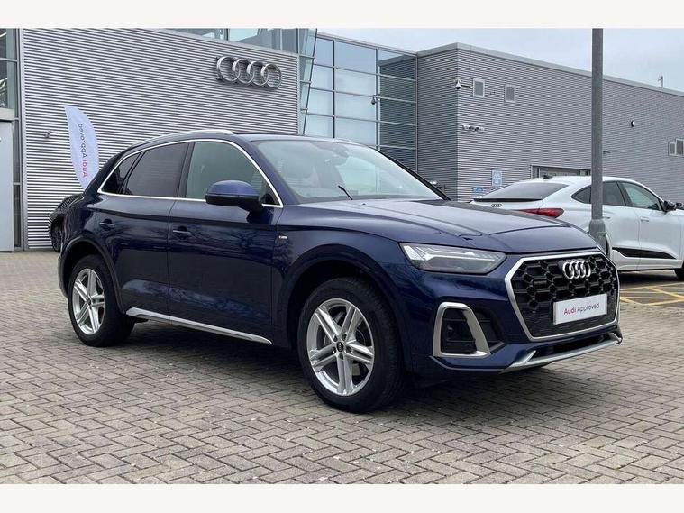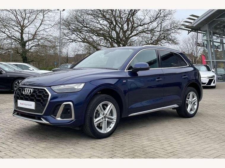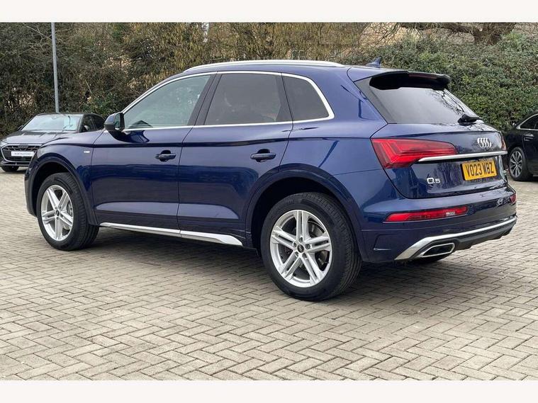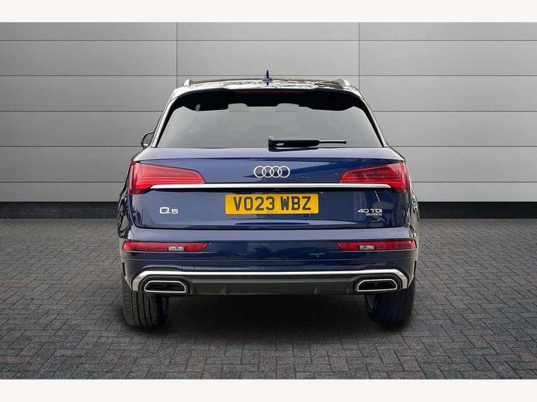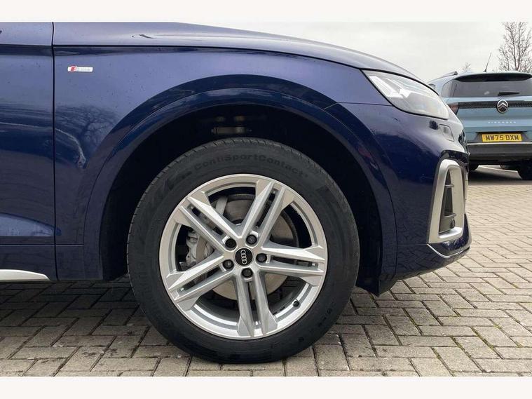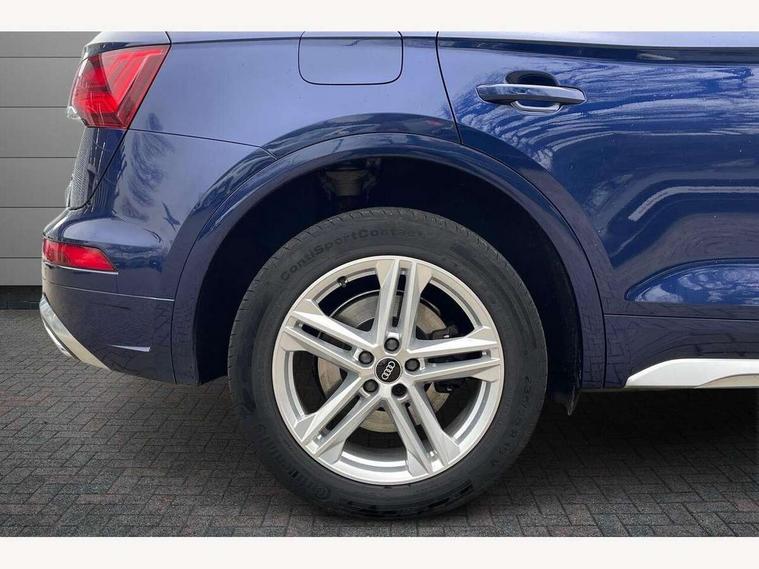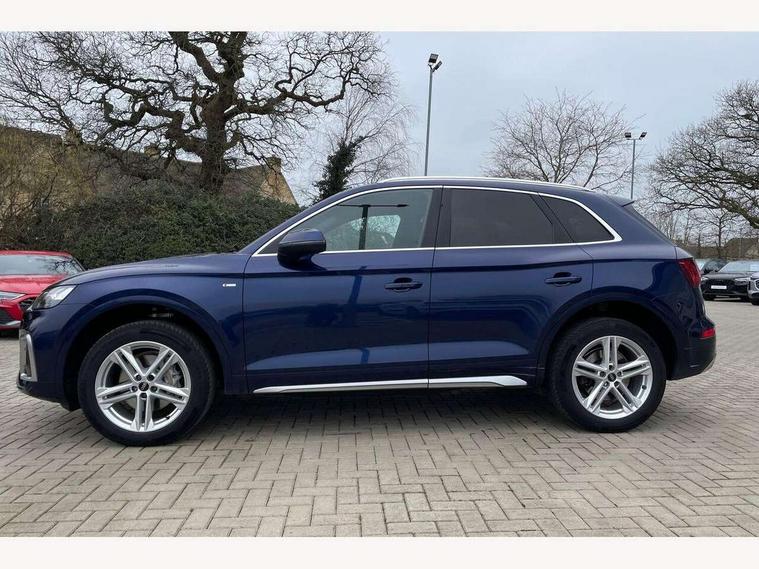 Acoustic front and rear parking sensor, Audi connect safety and service (e-call), Audi connect with Amazon Alexa Integration, Audi drive select, Audi virtual cockpit plus with 12.3" screen and three different layout designs, Audi wireless smartphone interface, Automatic start-stop system with coasting functionality and efficiency programme, Bluetooth interface, Electro - mechanical power assisted steering, MMI navigation plus with 10.1" touch screen, Power tailgate, Reversing camera, Service interval indicator, Voice control system with Audi hotword activation "Hey Audi", Diesel particulate filter, Quattro on demand, S line sports suspension, 2 x USB charging port with aux input socket, 8 loudspeakers, DAB Digital radio, Acoustic windscreen, Aluminium roof rails, Audi matrix LED headlights with dynamic front and rear indicators, Auto dimming door mirrors, Auto dimming frameless rear view mirror, Automatic headlight adjustment, Automatic headlights and windscreen wipers, Body colour bumpers, Body colour door mirrors, Body colour rear diffuser with matt aluminium silver surrounds, Body colour underbody protection, Chrome plated exhaust trims, Daytime running lights, Door sills in Selenite silver, Electric adjustable/heated/folding door mirrors, Front air inlet surrounds in aluminium, Front and rear electric windows, Front radiator grille in honeycomb design, Headlight washers, High level LED brake light, Lower bumpers painted in contrast Manhattan grey, Rear chrome trim strip below lights, Rear privacy glass and rear side windows, Rear side wing doors, Rear wiper, Roof bars, S Line badges on the front wings, S Line front and rear bumpers, S Line rear spoiler, S Line side skirts, 3 rear headrests, 3 spoke leather multifunction steering wheel with S badging perforated leather grips, 40:20:40 split folding 3 rear bench seat in 2nd row with rear centre armrest, Black cloth headlining, Comfort front centre armrest, Contrast stitching on seats, steering wheel and gear lever gaiter, Deluxe 3 zone electronic climate control, Front/rear floor mats, Gear lever in black leather, Heated front seats, Height adjustable front head restraints, Height/reach adjustable steering column, Illuminated door sill trims with S logo, Luggage compartment cover, Manual seat adjustment with 4-way electric lumbar support, Removable luggage compartment floor, Single front passenger seat, Stainless steel pedals, Sunvisors with vanity mirrors, High gloss pack - Q5, LED interior light pack - Q5, 3 point seatbelts on all seats, 6 airbags - Driver, front passenger, curtain and side airbags, Electrically operated child locks on rear doors, Electromechanical parking brake, Electronic stabilisation control including ABS, ASR and EDL, First aid kit with warning triangle and vests, Front passenger airbag deactivation, Hill descent control, Hill hold assist, ISOFIX child seat mounting for front passenger seat and ISOFIX child seat mounting with Top Tether for outer rear seats, Multi collision brake assist, Pop-up bonnet for pedestrian protection, Pre sense city, Seat belt force limiter, Seatbelt monitoring, Tyre pressure warning, Anti theft alarm, Anti-theft wheel bolts, Keyless Go access/ignition system, Remote central locking, Air vents inserts and centre console in gloss black, Matt brushed aluminium inlays,