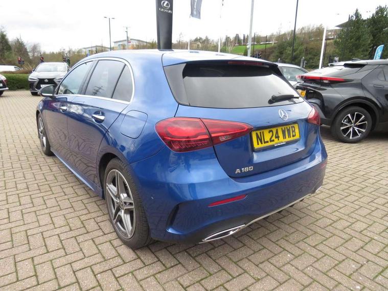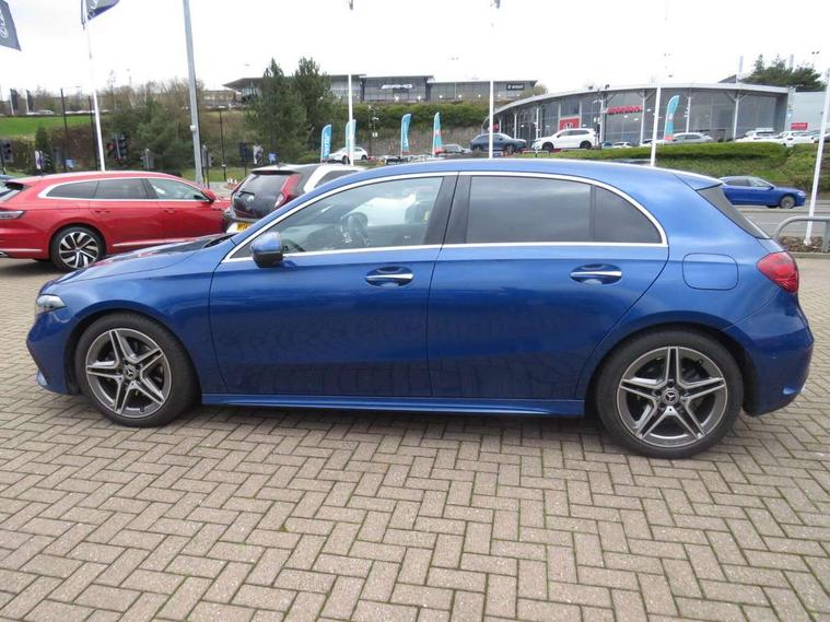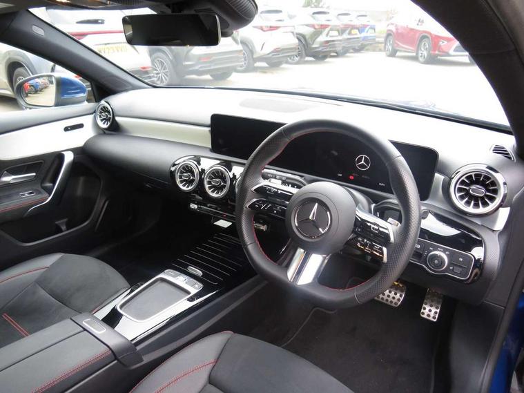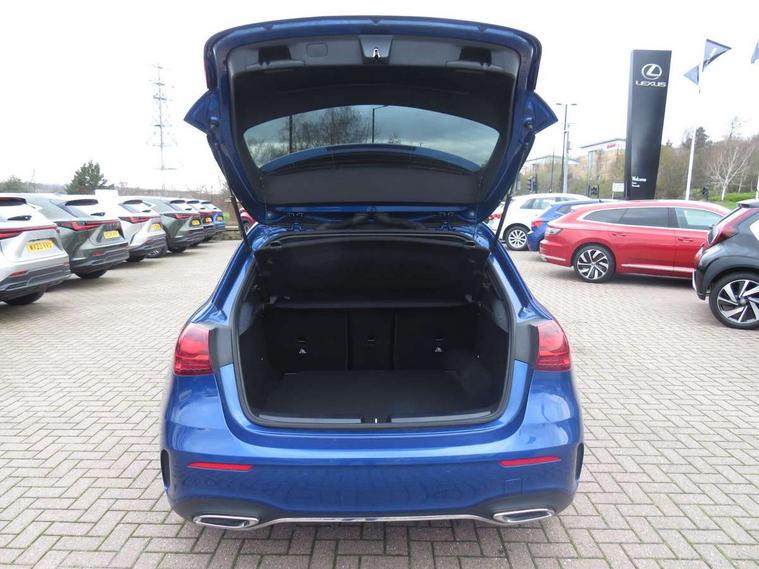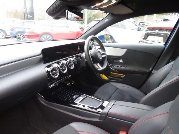 10.25 inch touchscreen central media display, 10.25" Digital instrument cluster display screen, Attention assist, Brake pad wear indicator warning light, Car wash mode, Cruise control + speed limiter, Direct steering, Direction indicators with lane change function, Dual bluetooth interfaces, DYNAMIC SELECT with a choice of driving modes (ECO, Comfort, Sport and Individual), Easy pack tailgate hands-free access, ECO start/stop function, Engine start/stop button, Fluid level warning indicator for fuel, oil, coolant and washer fluid, Fluorescent jacket for driver, Hard-disk navigation, Hey Mercedes Voice activation, Lamp failure indicator, Lane keeping system, Mercedes me connect including emergency call system, accident recovery, breakdown and maintenance management, Mercedes me remote services, Outside temperature gauge, Owners manual in English, Pre-installation of private car share, Preinstallation for Mercedes Benz link, Remote boot closing, Service indicator (ASSYST), Smartphone integration with Apple CarPlay and Android auto, Speed limit assist, Speed sensitive power steering, Tailgate, Trip computer in multifunction display with current consumption indicator, Wireless charging, Lowered comfort suspension, DAB Digital radio, MBUX multimedia system, Mercedes Benz sound system (100 W) with 6 speakers, 4 Electric Front and Rear windows, Adaptive brake lights, AMG body styling - AMG front apron with front splitter and AMG rear apron and visible exhaust tailpipe trim elements, Body colour bumpers, Body colour door handles with chrome inserts, Body colour side skirt, Body coloured door mirrors, Chrome beltline strips, Diamond radiator grille with pins in fine star pattern, Electric adjustable and heated door mirrors with integrated LED side indicators, Exhaust system with 2 visible tailpipe trim elements and rear apron, Headlamp assist automatic headlamp activation, Heat insulating dark tinted rear and rear side windows, Heated glass rear windscreen + timer control, LED High level third brake light, LED High Performance headlamps including integral LED daytime running lamps and adaptive highbeam assist, LED tail lamp, Privacy glass, Radio aerial, Rain sensing windscreen wipers with two sensitivity settings, Rear fog lights, Rear side wing doors, Rear windscreen wiper, Window line trim strip in chrome, 3 seat bench in 2nd row, 3 Spoke flat bottom leather multi function steering wheel with perforated leather in grip area, 4 way lumbar support, 40:20:40 split folding rear seats, Air conditioning - One zone THERMATIC automatic climate control with automatically controlled air distribution, AMG floor mats, Automatic child seat recognition sensor, Black air vents with surround in silver chrome, Black roof lining, Brushed stainless steel sports pedals with rubber studs, Front centre armrest with stowage, Front door sills with Mercedes Benz lettering, Front seat backs luggage nets, Galvanished gear shift paddles on steering wheel, Heated front seats, Height/reach adjustable steering column, Interior lighting - 64 colour Ambient lighting, Interior mirror with reading lamps in black and frameless, Rear armrest with 2 cupholders, Seat occupancy sensor for front passenger seat, Single front passenger seat, Sports seats with integrated headrests, Stowage compartment in centre console with retractable cover, Sunvisors with illuminated vanity mirrors, Twin front cupholders, Light and sight pack - A Class, Mirror package - A Class, Parking pack - A Class, Seat comfort pack - A Class, USB pack plus - A Class, 3 rear 3 point seatbelts, ABS with Brake Assist, Active bonnet, Active brake assist includes forward collision warning system with autonomous braking, Adaptive brake assist with hold function and hill start assist, Black seatbelts, Bonnet with power domes, Childproof locks manually operated for rear doors and electrically operated for rear power windows, Crash responsive emergency lighting, Driver and passenger head and side airbags, Drivers knee airbag, Dual stage driver/passenger airbags, Electronic parking brake, ESP curve dynamic assist, ESP with ASR, Front and rear seatbelt reminder, ISOFIX and top tether child seat fixing points in two outer rear seats, Tyre pressure monitoring system, Warning triangle and first aid kit, Window airbags, Alarm system/interior protection/immobiliser, Guard 360 degree vehicle protection, Keyless entry lock/unlock, Keyless Go, Remote central locking and crash sensor with emergency opening function, Light longitudinal grain aluminium trim, 18" AMG 5 twin spoke light alloy wheels, aerodynamically optimised, painted in termolite grey with high sheen finish, Summer tyres, Tirefit sealant kit,