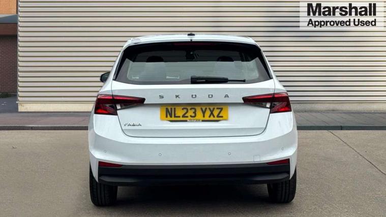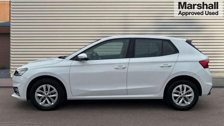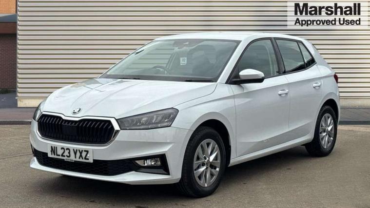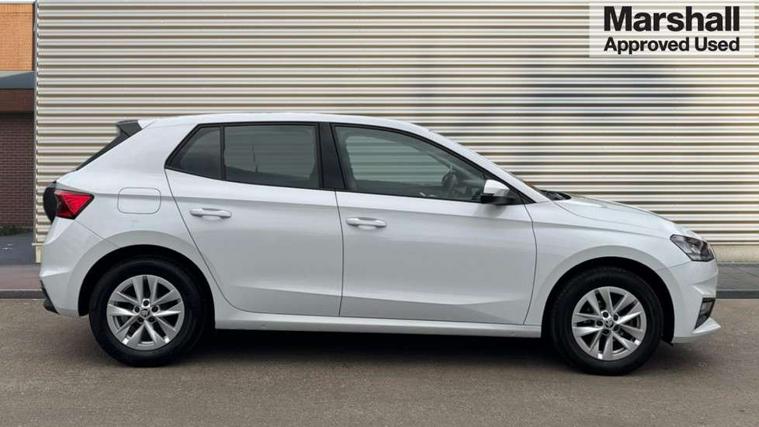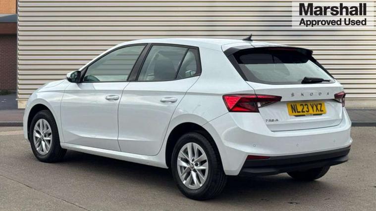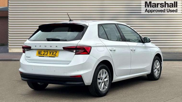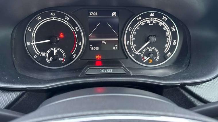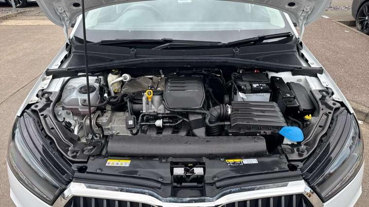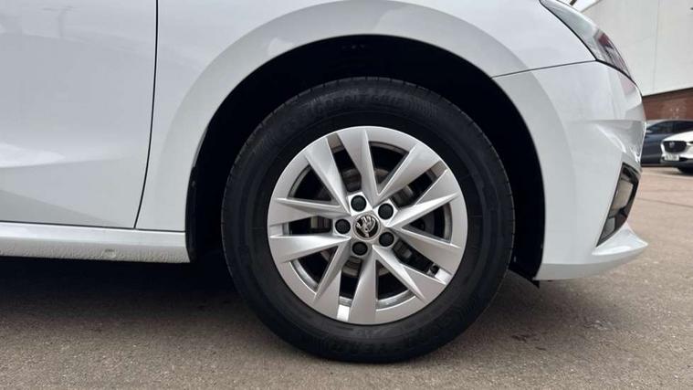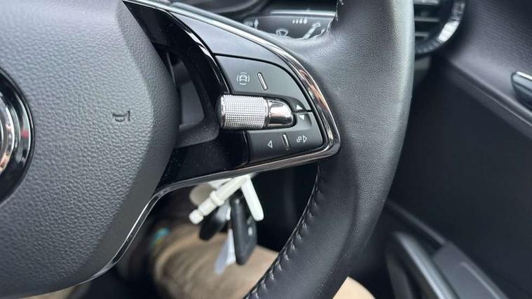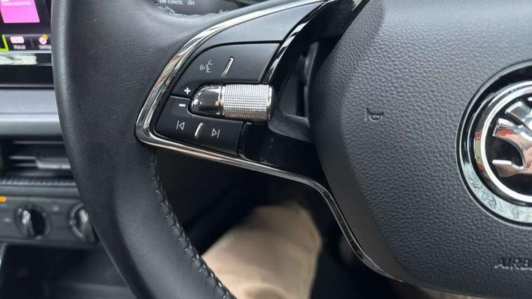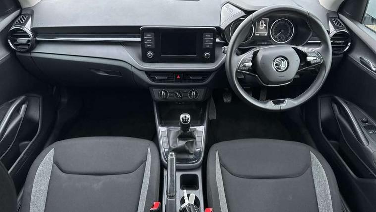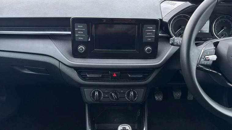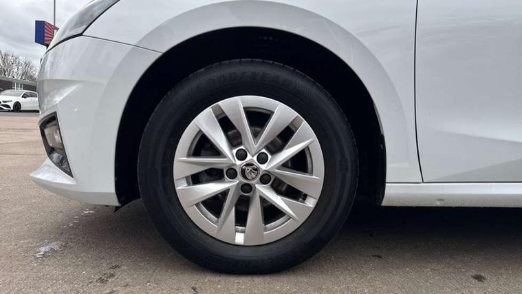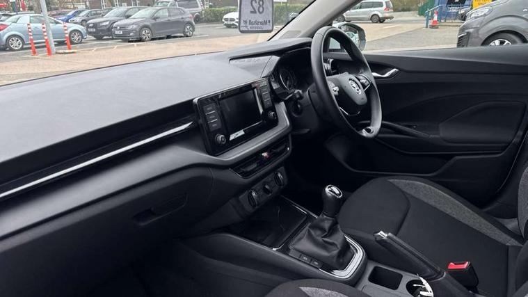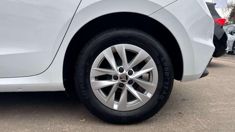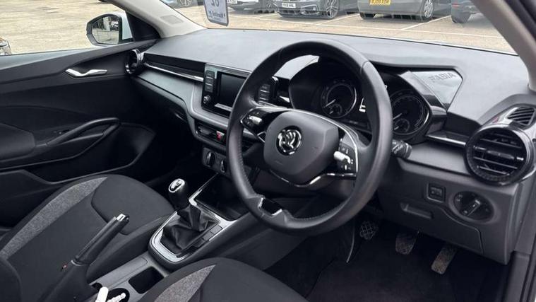 Bluetooth connection, Driver alert system - DAS, Electromechanical power steering, Exterior temperature gauge, Lane assist including road edge detection, Multifunction trip computer in black and white, Service interval indicator, Speed limiter, 2x USB-C in the front (for data transmission and charging), 4 speakers in front, Auxiliary socket for external MP3 player, DAB digital radio reception, Radio Swing with 6.5" colour display, Basic LED Headlights, Basic rear lights, Body colour door mirrors, Body coloured bumpers, Dimming rear view mirror with black frame, Door mirror integrated indicators, Electrically adjustable and heated door mirrors, Electrically adjustable front windows with function auto up/down, Front fog lights, Front window wiper intermittent control, Headlight range control - Automatic, Ice scraper in fuel cap, LED daytime running lights with coming and leaving home feature, Mechanical adjustable rear windows, Rain sensor, Rear LED fog light, Rear side wing doors, Rear window wiper with washing nozzles, Roof mounted spoiler, SKODA tailgate lettering in chrome, Third brake light, 2 reading lights in front and 2 reading lights in rear, 2 spoke leather multifunction steering wheel, 3 rear headrests, Backrest split and folding, Central console with fixed cup holder and storage box, Chrome handbrake release button, Fabric upholstery, Gearshift knob/handle in leather, Grain satin black interior door handles, Hand brake lever handle in leather, Height adjustable front headrests, Height adjustable front seats, Height adjustable steering wheel, ISOFIX and TopTether anchorage points to the outer rear seats, ISOFIX and TopTether on the front passenger seat, Luggage compartment lighting, Manual air conditioning, Manually adjustable lumbar support in front seats, Pollen filter, Rear seat bench unsplit, Single front passenger seat, Storm grey headlining, Sun visors with mirror and airbag label on passenger side, Ticket holder, 3-point height adjustable front seats belts with pretensioner and force limiter, Automatic warning lights in case of crash, Driver and passengers airbag with switch off function, e-Call+, ESC including ABS, MSR, ASR, EDS, HBA and XDS, Front and rear seat belt warning, FRONT ASSIST (AEB City and AEB Inter Urban), Front side airbags, Head airbags, One tone horn, Pedestrian protection, Three rear 3-points safety seat belts with pretensioner and force limiter including stop function for outer rear seat belts, Tyre pressure monitoring system, Anti-theft alarm system including immobiliser, interior monitoring, backup horn, and towing protection, Central locking with radio remote control, interior controls, SAFE function and 2 foldable keys, Black painted air vents, Glossy black decorative trim, Grain satin black central console cover, Grain satin black lower decorative trim, Satin black door and side trim panel in front, Anti-theft wheel bolts protection, Super-low rolling resistance tyres,
