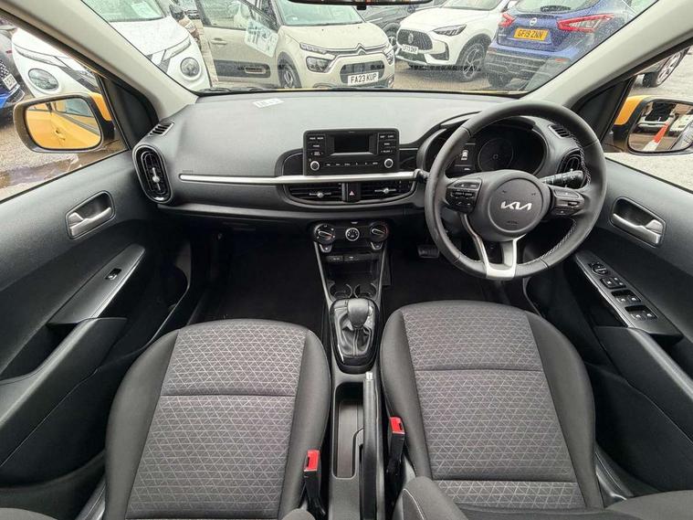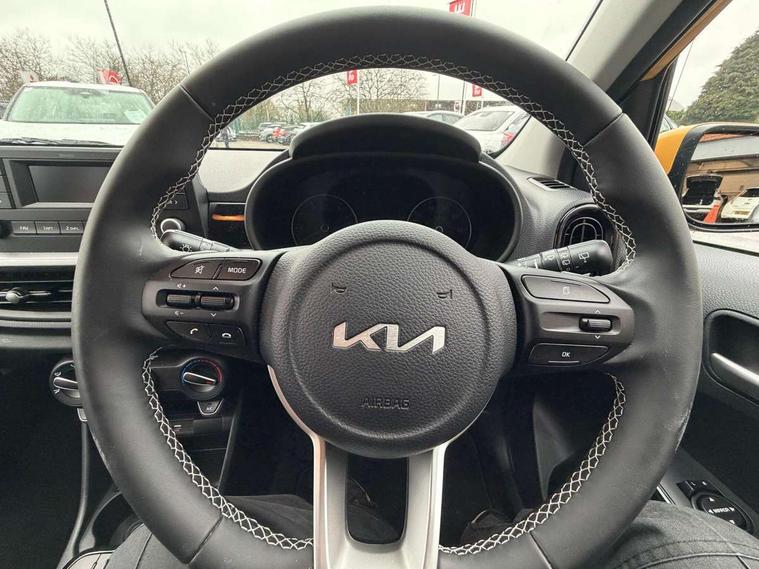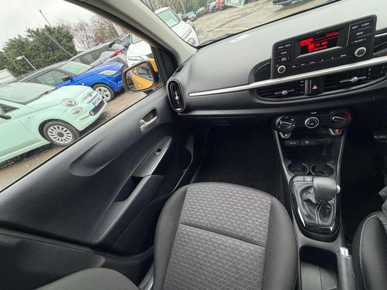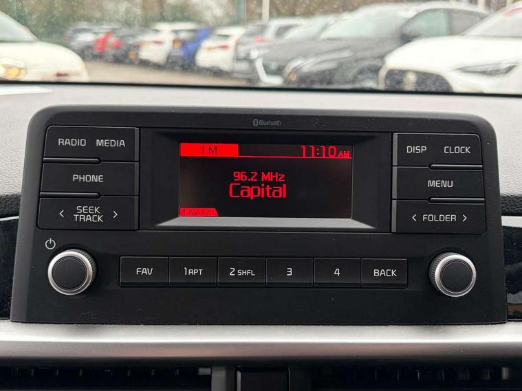 3.8" monochrome audio display with RDS and DAB, 4.2" supervision monochrome cluster display, Emergency call service, Emergency stop signalling system, External temperature gauge, Forward Collision-Avoidance Assist (FCA) - City, Motor driven power steering, Tachometer, Tailgate, Trip computer, 4 speaker audio system, Bluetooth with music streaming, Steering wheel mounted controls, USB ports for connection of a media device, Automatic headlight control system, Black radiator grille with chrome surround, Body colour bumpers, Body colour mirrors and door handles, Day/night rear view mirror, Daytime running lights, Electric adjustable heated door mirrors, Front and rear electric windows with drivers's auto up/down function, Headlamp levelling, Heated rear window, High mount brake light, MFR - Multi Focus Reflector halogen headlights with black bezel, Rain sensor, Rear fog lights, Rear side wing doors, Rear wash/wipe, Speed variable front wipers, Tinted glass, Visible VIN plate, Welcome and follow-me home light functionality, 1 x rear coat hook, 12V power point front, 2 seat bench in 2nd row, 3 x passenger assist grips, 60/40 split/folding 2nd row of seats, All round height adjustable headrests, Cupholders in centre console, Driver and front passenger sunvisor with vanity mirror, Driver seat height adjust, Front cabin lights, Glovebox, High gloss lower centre fascia trim, door armrest and air vents, ISOFIX Child seat top tethers and anchor fixings, Leather trimmed steering wheel and gearshift, Luggage area light, Luggage area parcel shelf, Manual air conditioning, Passenger front seatback pockets, Premium cloth upholstery, Silver paint finished interior door handles, Single front passenger seat, Slide/reclining front seats, Tilt adjustable steering wheel, Advanced Driver Assistance Pack - Picanto, 2 x 3-point rear seatbelts, ABS/EBD, Automatic unlocking of doors in case of impact, ESC + BAS + VSM + HAC, Front passenger airbag cut-off switch, Front seatbelt height adjusters, Front seatbelt pretensioners, Hill hold control, Hill start assist control (HAC), Knee airbags, Rear child proof door locks, Seatbelt warning, Side impact protection, Torque vectoring brake based and straight line stability (SLS), Traction control, Twin curtain airbags, Twin front airbags, Twin front side airbags, Tyre pressure monitoring system, Anti theft alarm, Engine immobiliser, Folding key, Locking wheel nuts, Remote central door locking, 14" alloy wheels, Tyre mobility kit,