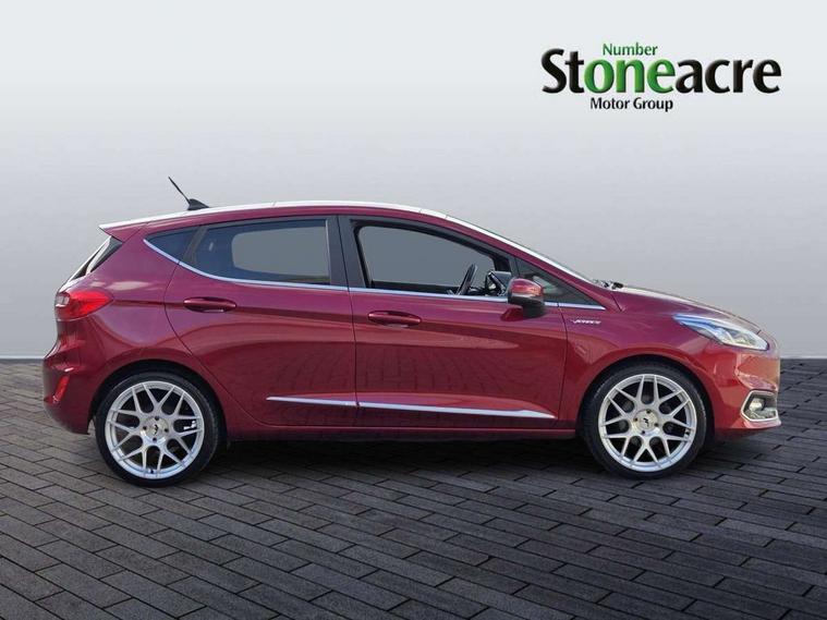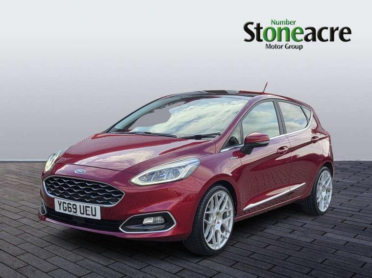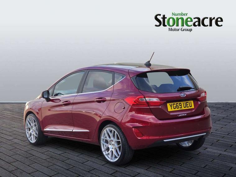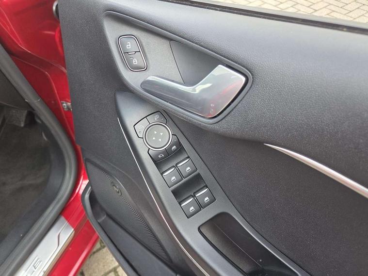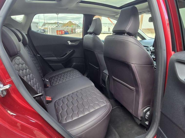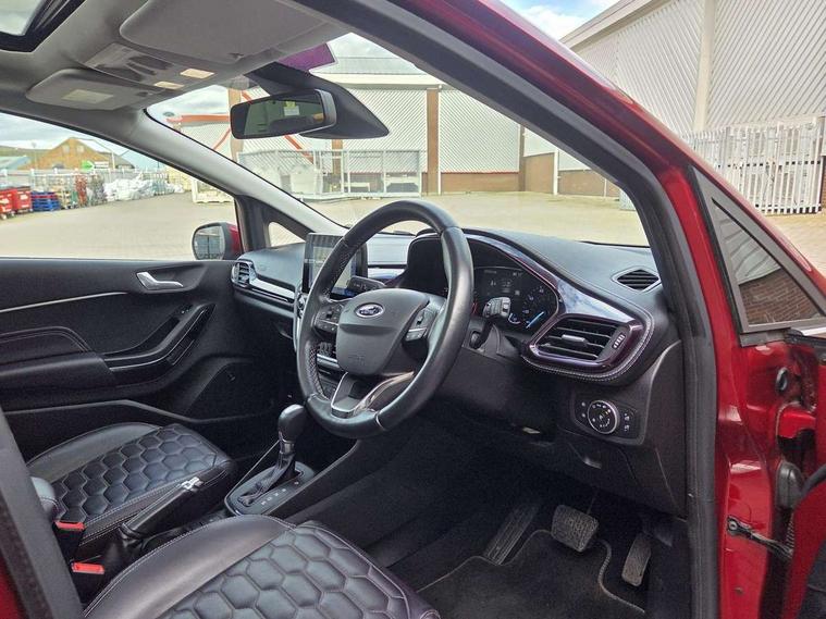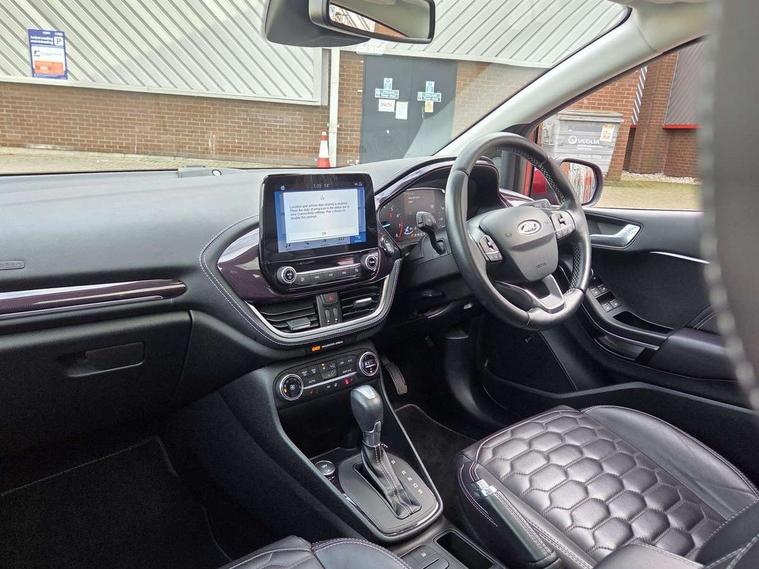 Bluetooth system, Electric power steering, Ford easy fuel, Trip computer, 2 USB ports, Auxiliary input socket, B&O Premium audio system with 8" touchscreen, 10 speakers, 360 degree sound system, Ford SYNC 3 navigation system and Ford pass connect, DAB Digital radio, Steering wheel mounted controls, Auto dimming rear view mirror, Body colour bumpers, Body colour door handles, Body colour electric adjustable heated door mirrors with integral indicators, Body colour rear spoiler, Chrome beltline trim, Chrome door handles, Chrome lower window surround, Cornering front fog lights, Electric front windows/one touch facility, Electric rear windows, LED Night signature to rear lights, LED rear lights, Openable panorama roof, Power foldable door mirrors with puddle lights, Privacy glass, Quickclear heated windscreen, Rain sensing wipers and auto dimming rear view mirror, Rear privacy glass, Rear wiper, Tinted glass, Unique Vignale front grille & bodystyling, Vignale front door threshold plates, Vignale rear & wing badges, 12V Accessory socket in centre console, 3 spoke leather trimmed steering wheel with audio control, 60/40 split folding rear seat, Adjustable head restraints, Air conditioning + Electric Auto Temperature Control (EATC), Ambient lighting, Boot carpet, Centre console with armrest and illuminated cupholders, Chrome inner door handles, Drivers and Passenger lumbar support, Footwell illumination, Front map reading lights, Front seat and rear pockets, Front/rear floor mats, Illuminated glovebox, Leather gear knob, Leather trimmed handbrake handle, Leather upholstery, Load area light, Luxury woven headliner, Overhead console with sunglasses holder, Pollen filter, Rake/reach adjustable steering wheel, Rear centre head restraint, Comfort Pack - Fiesta, NCAP Pack - Fiesta, Rear view camera pack - Fiesta, 3 point seatbelts on all rear seats, ABS+EBA, Curtain airbags, Driver and passenger airbags, Drivers knee airbag, Electronic stability control with hill start assist, Front passenger airbag deactivation, Front side airbags, Seatbelt warning, Tyre pressure monitoring system, Ford keyfree system with Keyless entry and keyless start with two remote keys, MyKey system, Remote central locking & engine immobiliser, Thatcham Cat.1 alarm, Tyre repair kit,