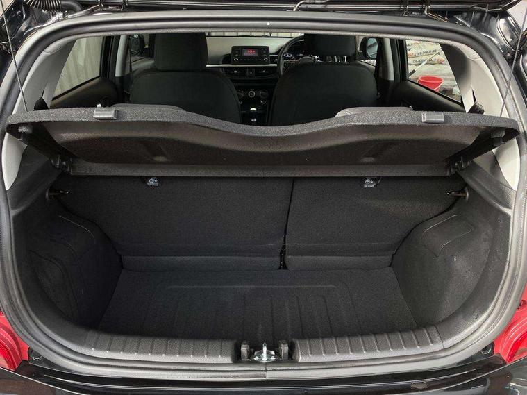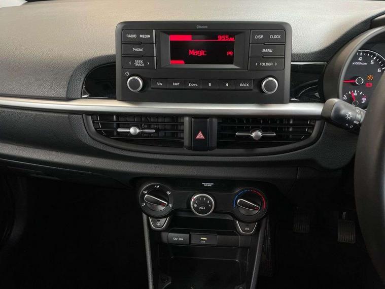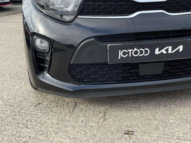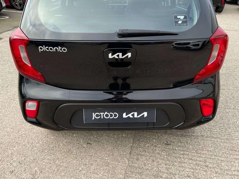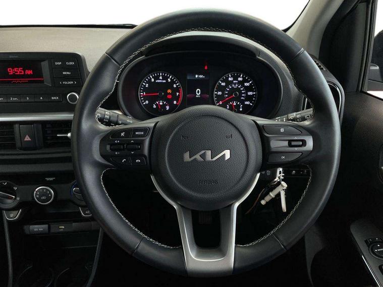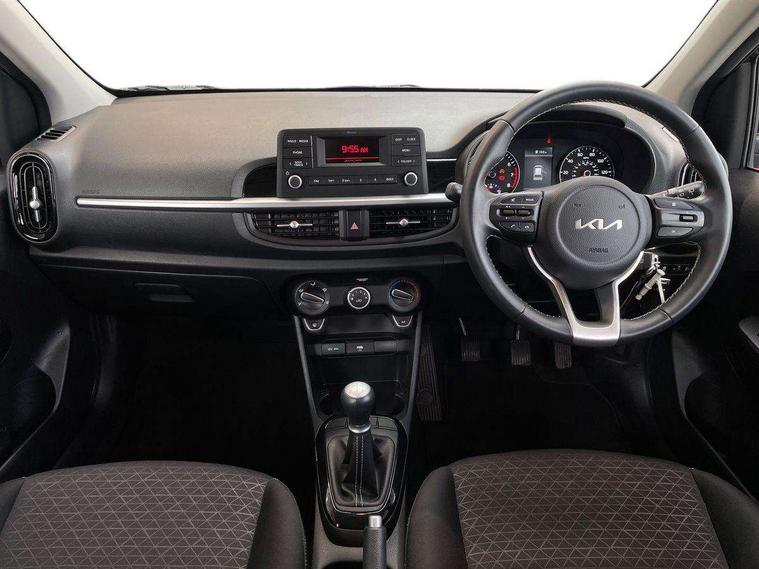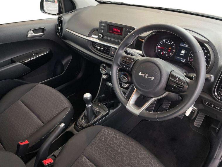 3.8" monochrome audio display with RDS and DAB, Emergency call service, Emergency stop signalling system, External temperature gauge, Motor driven power steering, Tachometer, Tailgate, Trip computer, 4 speaker audio system, Bluetooth with music streaming, Steering wheel mounted controls, USB ports for connection of a media device, Automatic headlight control system, Black radiator grille with chrome surround, Body colour bumpers, Body colour mirrors and door handles, Day/night rear view mirror, Daytime running lights, Electric adjustable heated door mirrors, Front and rear electric windows with drivers's auto up/down function, Headlamp levelling, Heated rear window, High mount brake light, MFR - Multi Focus Reflector halogen headlights with black bezel, Rain sensor, Rear fog lights, Rear side wing doors, Rear wash/wipe, Speed variable front wipers, Tinted glass, Visible VIN plate, Welcome and follow-me home light functionality, 1 x rear coat hook, 12V power point front, 2 seat bench in 2nd row, 3 x passenger assist grips, 60/40 split/folding 2nd row of seats, All round height adjustable headrests, Cupholders in centre console, Driver and front passenger sunvisor with vanity mirror, Driver seat height adjust, Front cabin lights, Glovebox, High gloss lower centre fascia trim, door armrest and air vents, ISOFIX Child seat top tethers and anchor fixings, Leather trimmed steering wheel and gearshift, Luggage area light, Luggage area parcel shelf, Manual air conditioning, Passenger front seatback pockets, Premium cloth upholstery, Silver paint finished interior door handles, Single front passenger seat, Slide/reclining front seats, Tilt adjustable steering wheel, Advanced Driver Assistance Pack - Picanto, 2 x 3-point rear seatbelts, ABS/EBD, Automatic unlocking of doors in case of impact, Dual front airbags, ESC + BAS + VSM + HAC, Front passenger airbag cut-off switch, Front seatbelt height adjusters, Front seatbelt pretensioners + load limiters, Hill hold control, Knee airbags, Rear child proof door locks, Seatbelt warning, Side impact protection, Torque vectoring brake based and straight line stability (SLS), Traction control, Twin curtain airbags, Twin front side airbags, Tyre pressure monitoring system, Anti theft alarm, Engine immobiliser, Folding key, Locking wheel nuts, Remote central door locking, 14" alloy wheels, Tyre mobility kit,