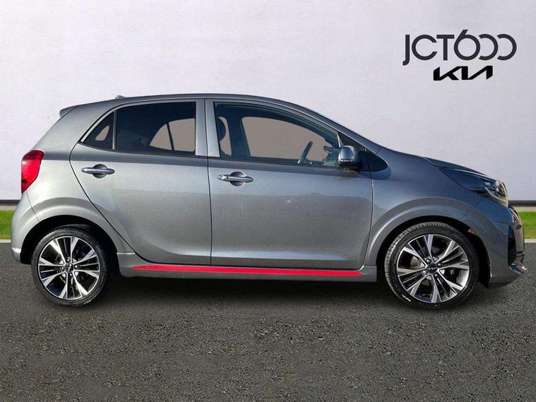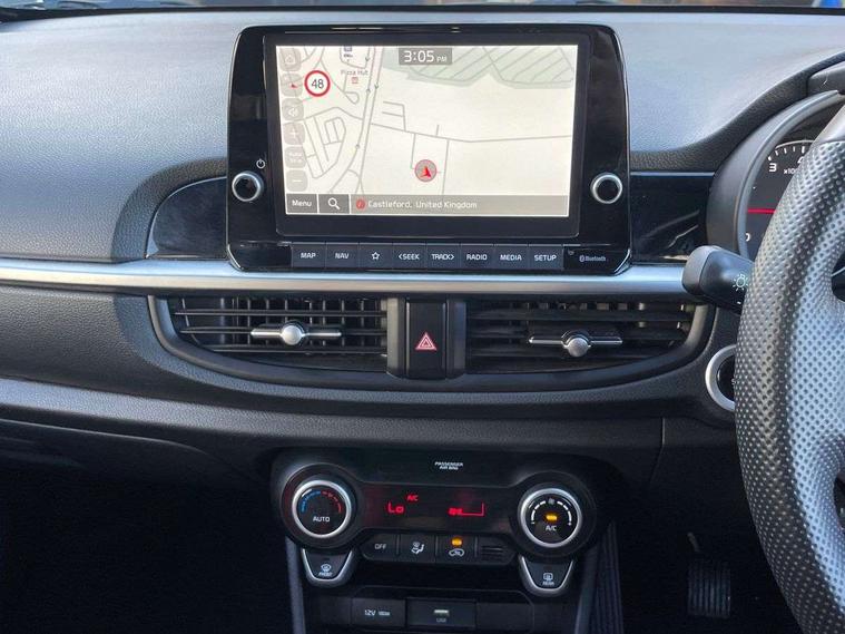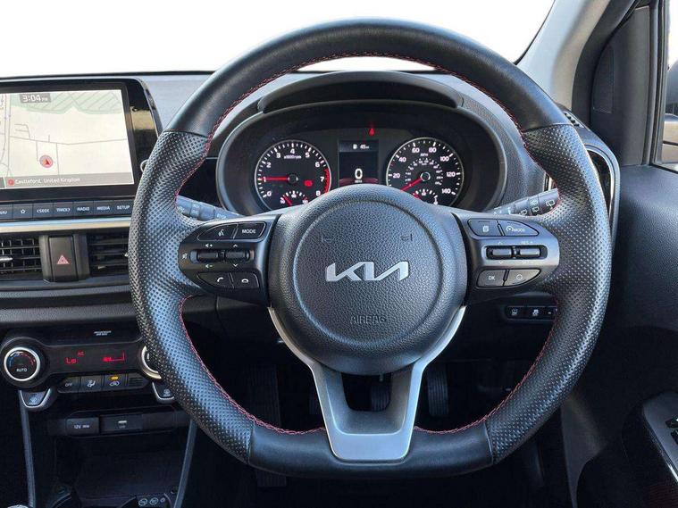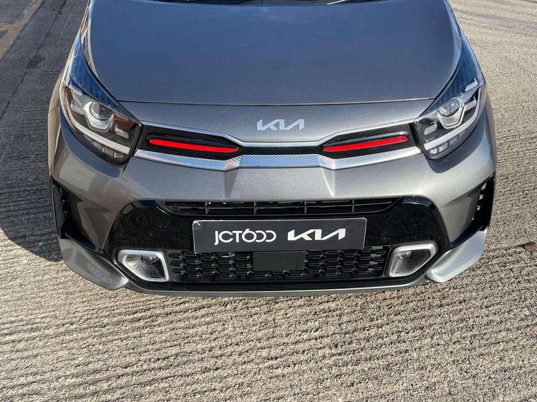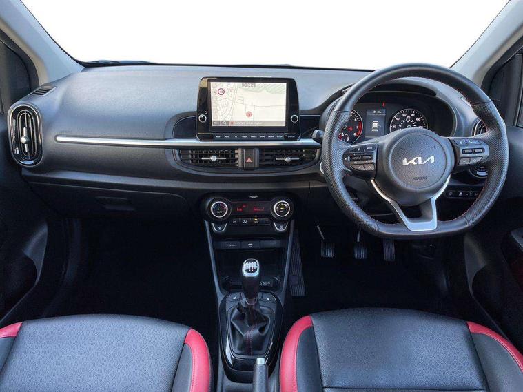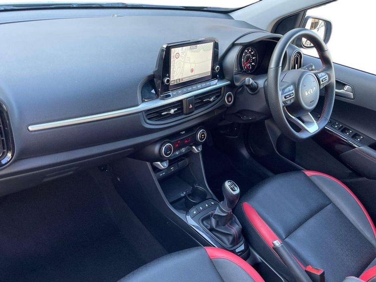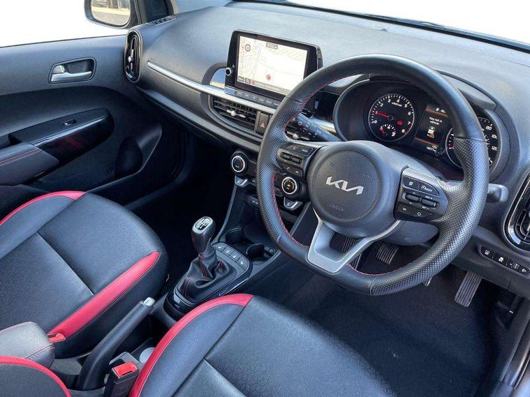 8" touch screen satellite naviagtion with RDS and DAB with telematics, Apple car play/Android Auto with voice control, Cruise control + speed limiter, Emergency call service, Emergency stop signalling system, External temperature gauge, Kia Connect (UVO), Motor driven power steering, Rear parking sensors, Reversing camera system with dynamic guidelines (Integrated into centre fascia screen), Tachometer, Trip computer, Wireless Smartphone charger, 6 speaker audio system, Bluetooth with music streaming, Steering wheel mounted controls, USB ports for connection of a media device, Automatic headlight control system, Bi-function projection headlights, Black beltline mouldings, Black grille with silver surround, Body colour B pillars, Body colour bumpers, Body colour side sill mouldings, Body coloured mirrors and chrome exterior handles, Day/night rear view mirror, Electric adjustable/heated/folding door mirrors with LED indicators lights, Front and rear electric windows with drivers's auto up/down function, Front fog lights, Headlamp levelling, Heated rear window, High mount brake light, LED daytime running lights, LED rear fog lights, Privacy glass - Rear windows and tailgate, Rain sensor, Rear side wing doors, Rear wash/wipe, Speed variable front wipers, Sports front and rear bumpers with gloss black skid plates twin exhaust, Tinted glass, Visible VIN plate, Welcome and follow-me home light functionality, 1 x rear coat hook, 12V power point front, 2 seat bench in 2nd row, 3 x passenger assist grips, 60/40 split/folding 2nd row of seats, All round height adjustable headrests, Automatic air conditioning, Black and red accents front door armrest, Centre Console with Storage Box and Sliding Armrest, Cupholders in centre console, D-cut steering wheel with red stitching, Driver and front passenger sunvisors with driver's side illuminated vanity mirrors, Driver seat height adjust, Faux leather upholstery, Front cabin lights, Glovebox, Heated front seats, Heated steering wheel, High gloss lower centre fascia trim, door armrest and air vents, ISOFIX Child seat top tethers and anchor fixings, Leather trimmed steering wheel and gearshift, Luggage area light, Luggage area parcel shelf, Passenger front seatback pockets, Satin chrome interior door handles, Single front passenger seat, Slide/reclining front seats, Tilt adjustable steering wheel, Advanced Driver Assistance Pack - Picanto, 2 x 3-point rear seatbelts, ABS/EBD, Automatic unlocking of doors in case of impact, Dual front airbags, ESC + BAS + VSM + HAC, Front passenger airbag cut-off switch, Front seatbelt height adjusters, Front seatbelt pretensioners + load limiters, Hill hold control, Knee airbags, Rear child proof door locks, Seatbelt warning, Side impact protection, Torque vectoring brake based and straight line stability (SLS), Traction control, Twin curtain airbags, Twin front side airbags, Tyre pressure monitoring system, Anti theft alarm, Engine immobiliser, Locking wheel nuts, Smart key with engine start/stop button, 16" alloy GT-Line wheels, Tyre mobility kit,
