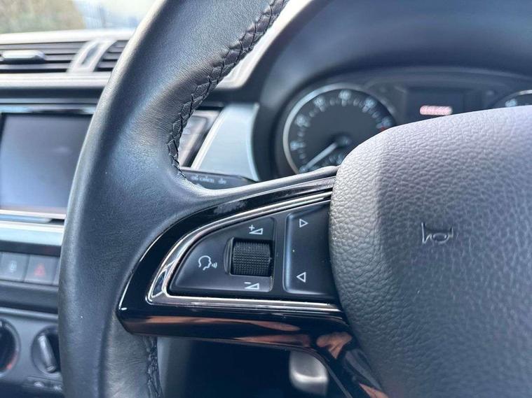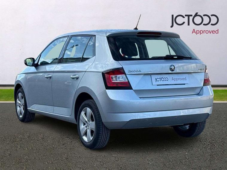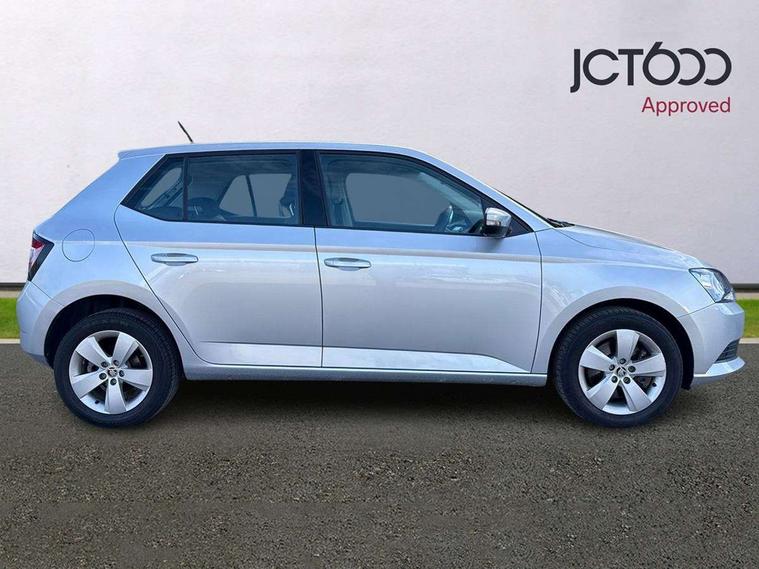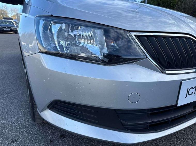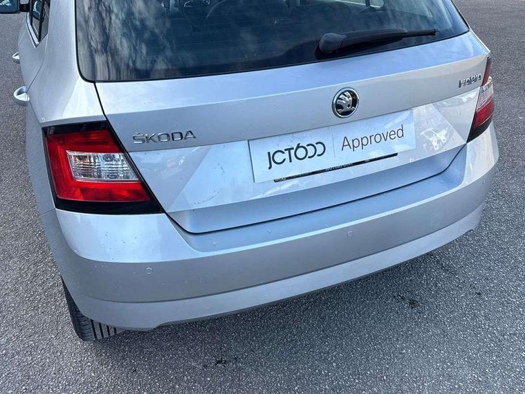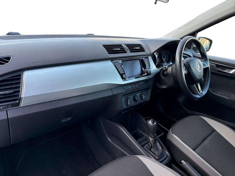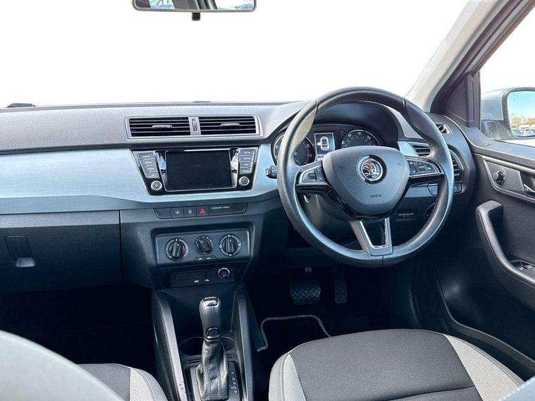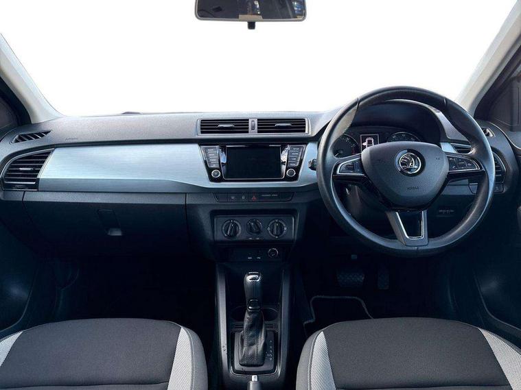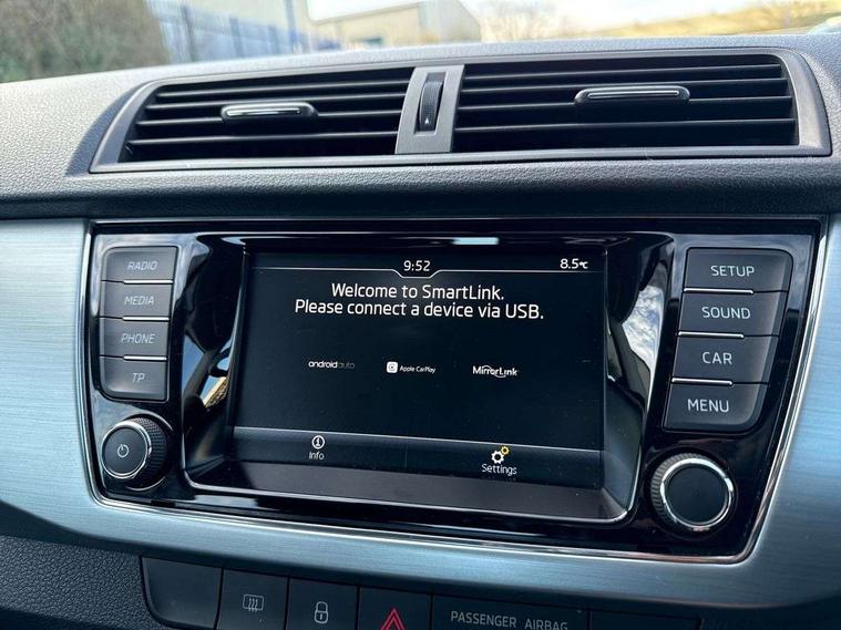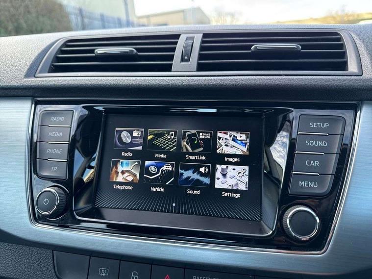 Bluetooth system, Exterior temperature gauge, Front assistant collision mitigation, Multi function trip computer, PAS, Service interval indicator, SmartLink, 6.5" touchscreen, Auxiliary socket for external MP3 player, Bolero Radio, DAB Digital radio, SD card slot, USB interface, Body colour bumpers, Body colour door handles, Chrome grille surround, Electric front windows, Electrically adjustable and heated door mirrors, Heated rear window, Height adjustable headlamps, Intermittent rear wash/wipe, Tinted rear windows, Tinted windscreen, 1.5L bottle holder in front door panels, 2 height adjustable rear headrests, 60/40 split folding rear seat, Boot stowage box, Cargo area storage tray, Driver + passenger vanity mirrors, Folding grab handles, Front reading lights, Height adjustable driver's seat, Height adjustable front headrests, Height adjustable passenger seat, Height/reach adjust steering wheel, Interior light with delay, Leather gearshift, Leather handbrake, Lower glovebox cover, Luggage load hooks, Parcel shelf, Pollen filter, Rear courtesy light, Rear storage trays, Ticket holder, Two rear outer seat isofix location points, Umbrella under front passenger seat, Arkamys surround sound pack - Fabia, Chrome Pack - Fabia, 3x3 point rear seatbelts, ABS, Curtain airbags, Driver and passenger airbags, Driver and passenger side airbags, EDS, ESC with ASR, Front seatbelt pretensioners, Hill hold control, Hydraulic Brake Assist (HBA), Motor Slip Regulation (MSR) - Engine Drag Torque Control, Passenger airbag deactivate switch, Seatbelt warning, Tyre pressure monitor, Alarm with interior monitoring, Immobiliser, Locking wheel bolts, Remote central locking,