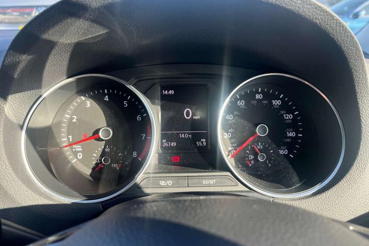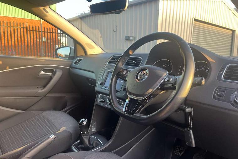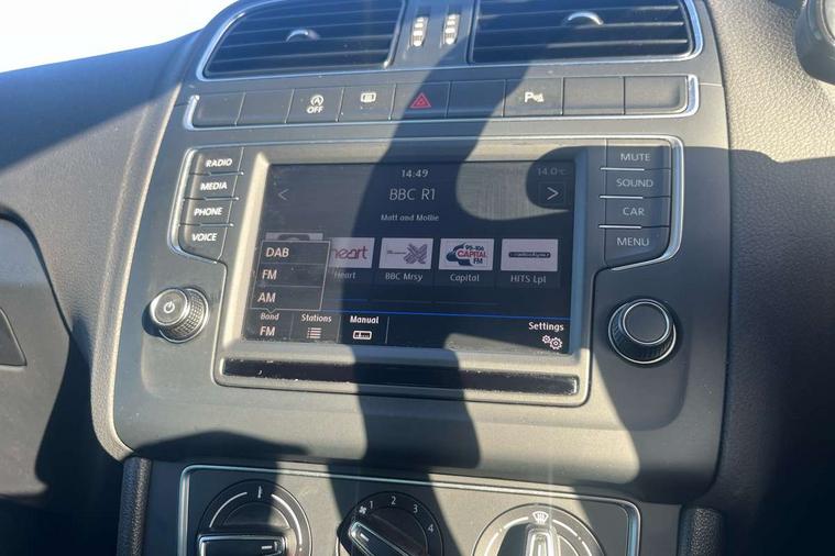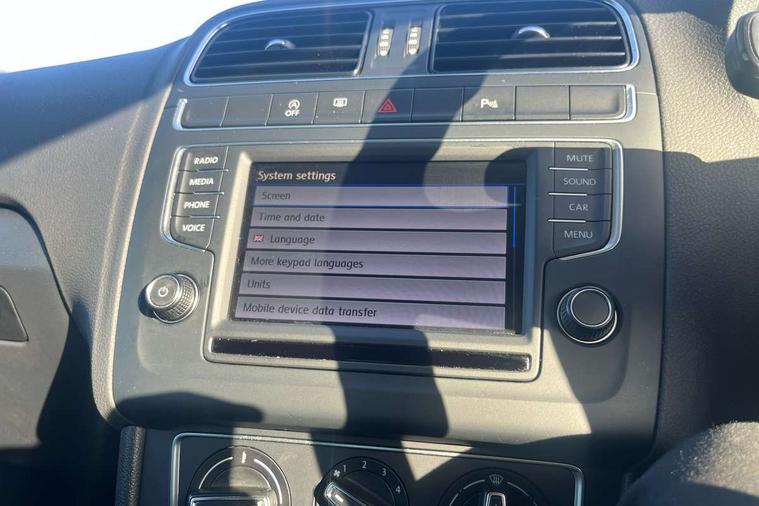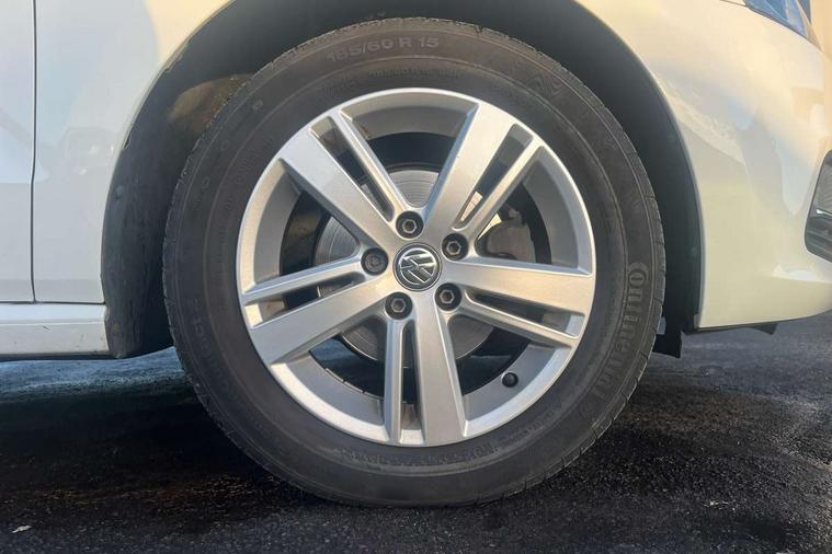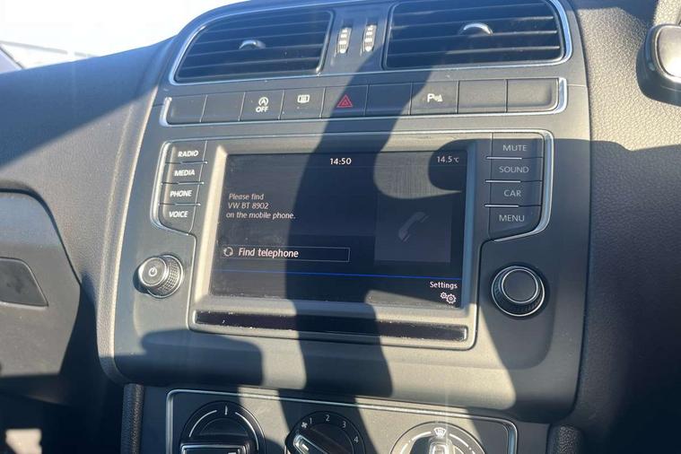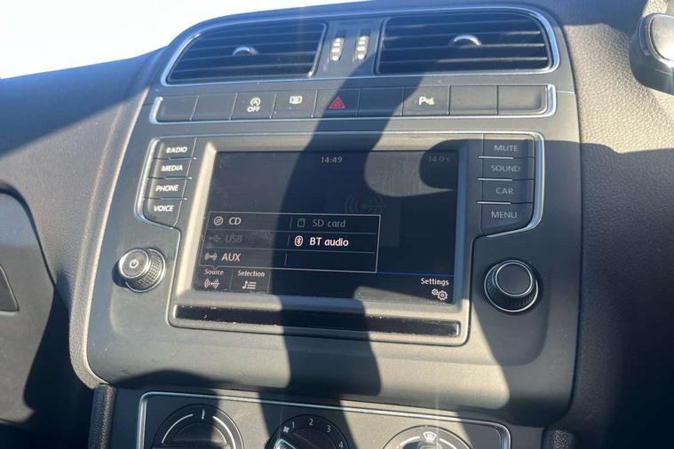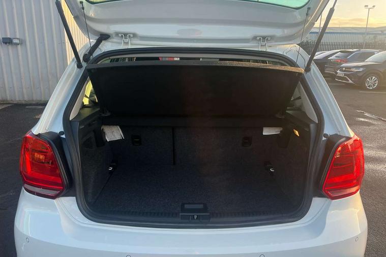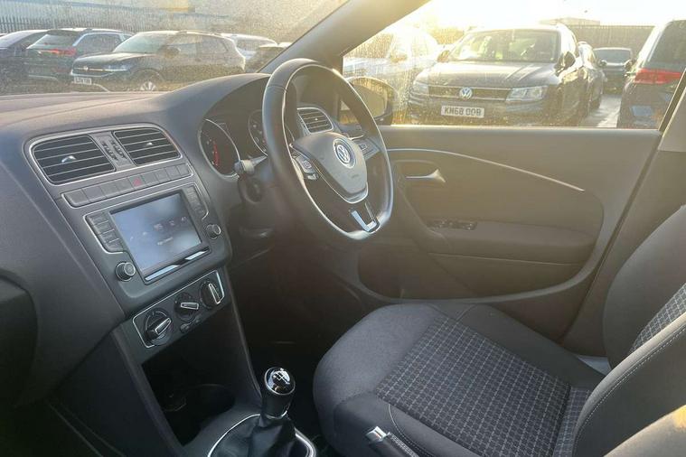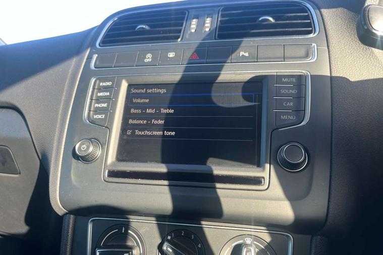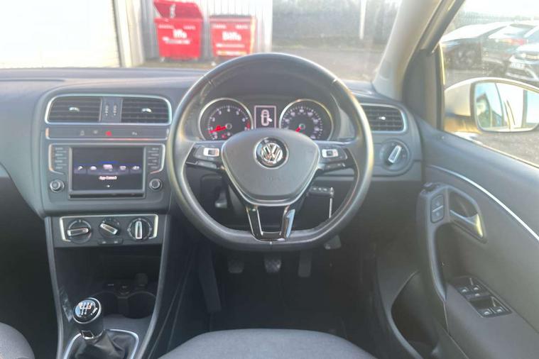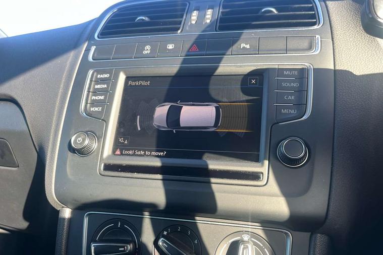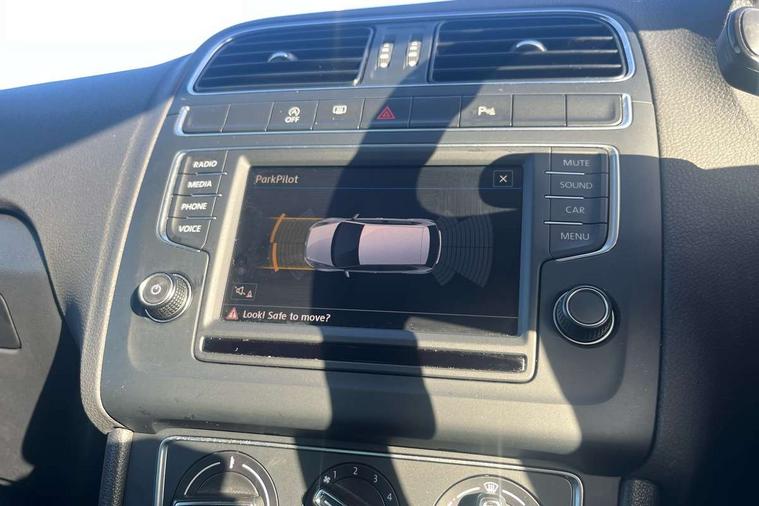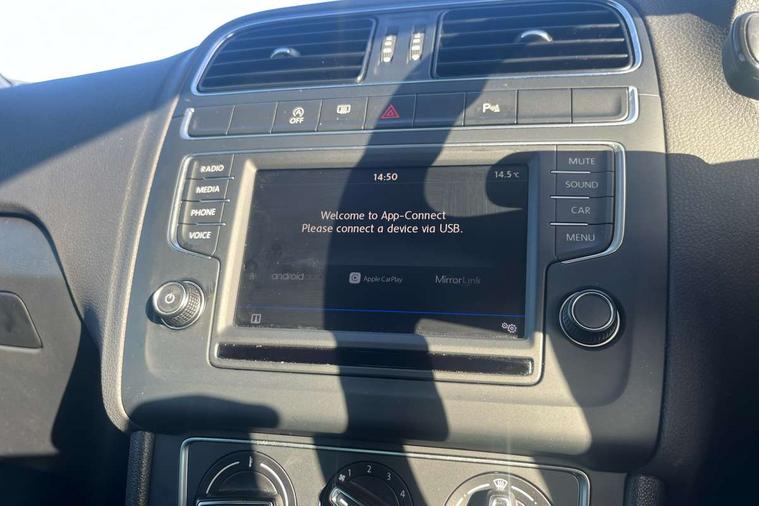 App-Connect, Bluetooth Telephone preparation, Driver alert system, Multi function display, Multifunction computer, PAS - speed related, Service interval indicator, Ultrasonic front and rear optical and audible parking sensors, Warning buzzer and light for front seatbelts unfastened, 6 speakers, Composition media system with radio, glovebox mounted CD, colour touch screen, SD card, aux-in, USB, multimedia interface, DAB Digital radio, Black grille with chrome surround, Body colour bumpers, Body colour door handles, Body colour door mirrors, Body coloured side sills, Chrome trimmed front air intake surrounds, Electric folding door mirrors, Electric front windows, Electric operated/heated door mirrors, Front fog lights with static cornering function, Front wash/wipe with interval delay, Heat insulated tinted glass 65% light absorbing from B pillar back, Heated rear window with auto timer, Rear electric windows, Rear windscreen washer and wiper with interval delay, 12V power socket in centre console, 2 bag hooks in luggage compartment, 2 cupholders, 3 rear head restraints, 3 spoke steering wheel, 4 grab handles, 60/40 split folding rear seat, Centre console storage, Chrome interior door handles, Driver and passenger sunvisors, Driver seat height adjust, Dust/pollen filter, Front door pockets, Front passenger seat height adjust, Front seat backrest storage nets, Front/rear reading lights, Glovebox, Height/reach adjustable steering column, Illuminated vanity mirror, Interior light with delay, Isofix Preparation 2 Rear child seats, Luggage compartment cover, removable, Luggage compartment lighting, Matt chrome gear lever gaiter surround, Multifunction leather steering wheel with leather gear knob/handbrake grip, Storage compartment in front doors, Storage compartment in rear doors, Sunglasses holder, Variable boot floor, Light and sight pack - Polo, 3 point height adj front seatbelts + pretensioners, 3x3 point rear seatbelts, ABS, Automatic post collision braking, Driver/front passenger airbag, Driver/Passenger whiplash optimised head restraints, ESC - Electronic Stability Control + traction control, ESP with EDL + ASR, Hill hold control, Hydraulic Brake Assist (HBA), Tyre pressure monitoring system, Alarm with remote central locking and interior protection, Electronic engine immobiliser, Air vents in Matt chrome, Matt chrome interior trim, 15" steel spare wheel,