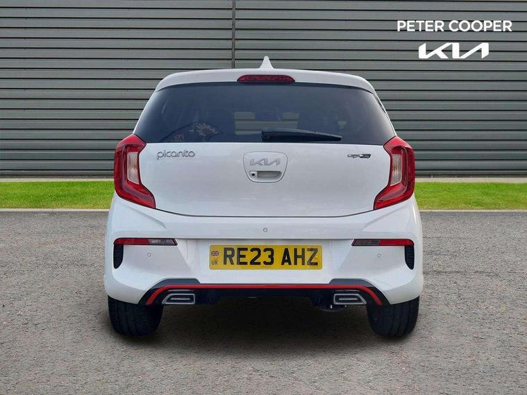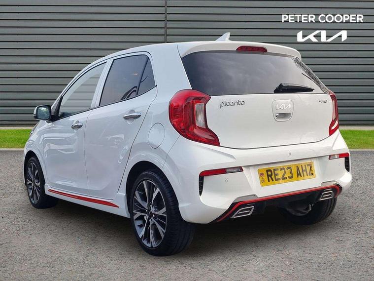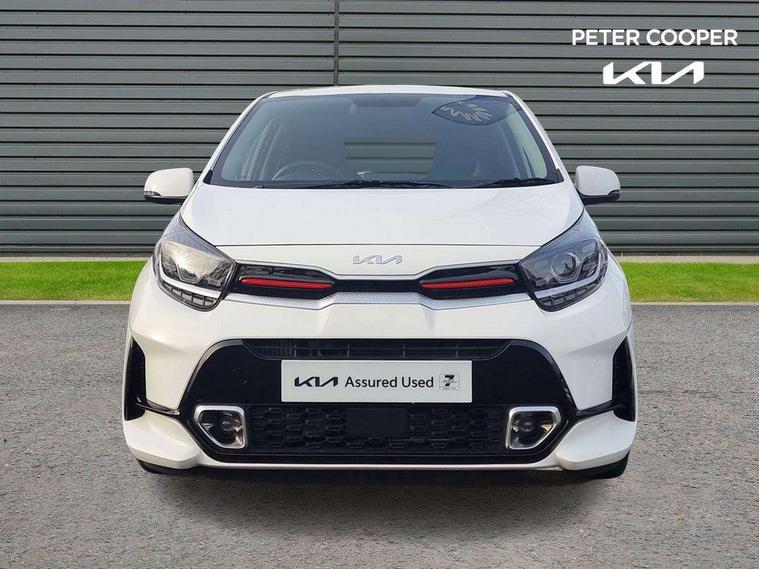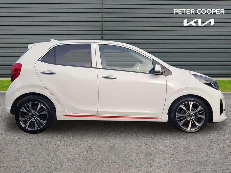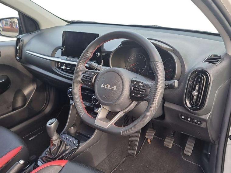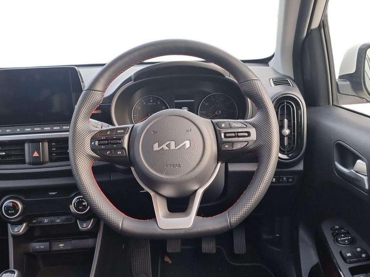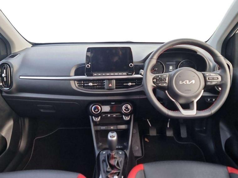 8" touch screen satellite naviagtion with RDS and DAB with telematics, Apple car play/Android Auto with voice control, Cruise control + speed limiter, Emergency call service, Emergency stop signalling system, External temperature gauge, Kia Connect (UVO), Motor driven power steering, Rear parking sensors, Reversing camera system with dynamic guidelines (Integrated into centre fascia screen), Tachometer, Trip computer, Wireless Smartphone charger, 6 speaker audio system, Bluetooth with music streaming, Steering wheel mounted controls, USB ports for connection of a media device, Automatic headlight control system, Bi-function projection headlights, Black beltline mouldings, Black grille with silver surround, Body colour B pillars, Body colour bumpers, Body colour side sill mouldings, Body coloured mirrors and chrome exterior handles, Day/night rear view mirror, Electric adjustable/heated/folding door mirrors with LED indicators lights, Front and rear electric windows with drivers's auto up/down function, Front fog lights, Headlamp levelling, Heated rear window, High mount brake light, LED daytime running lights, LED rear fog lights, Privacy glass - Rear windows and tailgate, Rain sensor, Rear side wing doors, Rear wash/wipe, Speed variable front wipers, Sports front and rear bumpers with gloss black skid plates twin exhaust, Tinted glass, Visible VIN plate, Welcome and follow-me home light functionality, 1 x rear coat hook, 12V power point front, 2 seat bench in 2nd row, 3 x passenger assist grips, 60/40 split/folding 2nd row of seats, All round height adjustable headrests, Automatic air conditioning, Black and red accents front door armrest, Centre Console with Storage Box and Sliding Armrest, Cupholders in centre console, D-cut steering wheel with red stitching, Driver and front passenger sunvisors with driver's side illuminated vanity mirrors, Driver seat height adjust, Faux leather upholstery, Front cabin lights, Glovebox, Heated front seats, Heated steering wheel, High gloss lower centre fascia trim, door armrest and air vents, ISOFIX Child seat top tethers and anchor fixings, Leather trimmed steering wheel and gearshift, Luggage area light, Luggage area parcel shelf, Passenger front seatback pockets, Satin chrome interior door handles, Single front passenger seat, Slide/reclining front seats, Tilt adjustable steering wheel, Advanced Driver Assistance Pack - Picanto, 2 x 3-point rear seatbelts, ABS/EBD, Automatic unlocking of doors in case of impact, Dual front airbags, ESC + BAS + VSM + HAC, Front passenger airbag cut-off switch, Front seatbelt height adjusters, Front seatbelt pretensioners + load limiters, Hill hold control, Knee airbags, Rear child proof door locks, Seatbelt warning, Side impact protection, Torque vectoring brake based and straight line stability (SLS), Traction control, Twin curtain airbags, Twin front side airbags, Tyre pressure monitoring system, Anti theft alarm, Engine immobiliser, Locking wheel nuts, Smart key with engine start/stop button, 16" alloy GT-Line wheels, Tyre mobility kit,