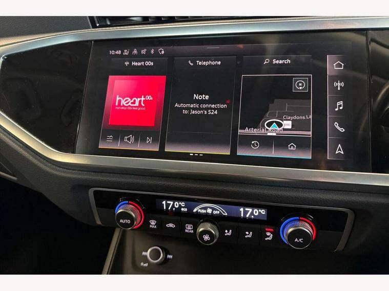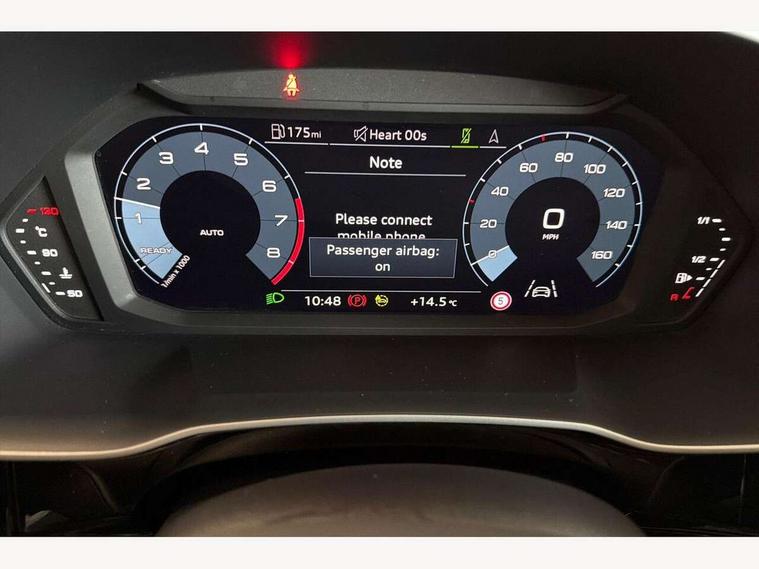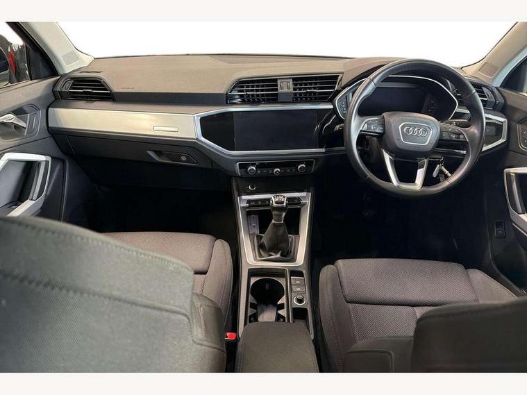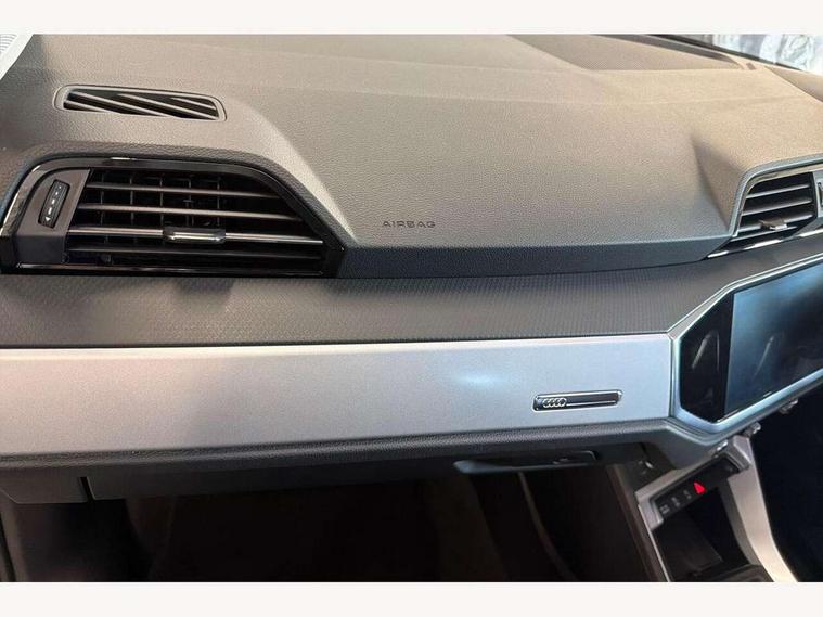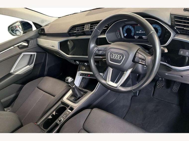 Amazon alexa Integration, Audi drive select, Audi lane departure warning, Audi Virtual Cockpit - 10.25" display, Bluetooth interface, Camera based traffic sign recognition, Cruise control + speed limiter, Legal emergency call, MMI Navigation Plus with high resolution 10.1 inch touchscreen colour display, Power operated tailgate, Progressive steering, Rear parking sensors, Service interval indicator, Smartphone interface includes wireless Apple carplay/Android Auto, Start stop system with recuperation, Voice control system with natural language interaction, Standard suspension, 2 USB-C ports with charge and data functions, 6 passive loudspeakers, DAB digital radio module, Acoustic windscreen, Aluminium roof rails, Aluminium window trim, Auto dimming frameless rear view mirror, Body coloured bumpers, Electrically folding, adjustable and heated door mirrors with integrated LED side indicators and kerb view function for passenger side, Front and rear electric windows, Front fog lights, Front side air inlets in matt selenite silver, Front spoiler in matt selenite silver, Grille vertical bars in aluminium silver/Matt, High gloss black finish B and C pillars, LED headlights with LED daytime running lights, LED rear lights, LED third brake light, Rain and light sensors, Rear diffuser strip in matt selenite silver, Rear side wing doors, Rear wiper, Titanium black radiator grille, Variable front intermittent wipers, 12V socket in rear centre console, 3 seat bench in 2nd row, 3 spoke multi-function leather steering wheel, 40:20:40 folding with manual adjustment for 60:40 forwards/backwards position and backrest angle, Door sill trims with aluminium inlay, Dual zone electronic climate control, Front and rear floor mats, Front and rear headrests, Front and rear roof module including reading lights, Front centre armrest, Glove compartment lighting, Height and reach adjustable steering wheel, ISOFIX child seat mounting for front passenger with airbag deactivation and outer rear seat including top tether attachment point for outer rear seats, Luggage compartment light, Lunar silver cloth headlining, Manual front seats with height adjustment, Single front passenger seat, Stainless steel luggage compartment sill finisher, Non smoking pack - Q3, 3x3 point rear seatbelts, 6 airbags - Driver, front passenger, curtain and side windows, Audi pre-sense front with pedestrain and cyclist recognition, Electromechanical parking brake, Electronic stabilisation control including ABS, ASR and EDL, Front seatbelt reminder, Hill descent control, Hill hold assist, Manual child lock in rear doors, Pre sense basic, Seatbelt monitoring, Tyre pressure warning, Warning triangle and first aid kit, Anti theft alarm, Anti theft wheel bolts, Immobiliser, Remote central locking, Detail dashboard around MMI touch colour display in glass look, black with surround in aluminium look, Micrometallic silver inlay,