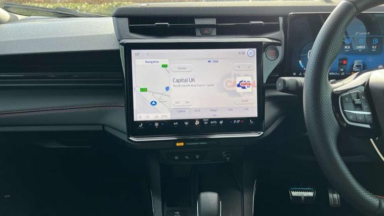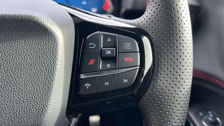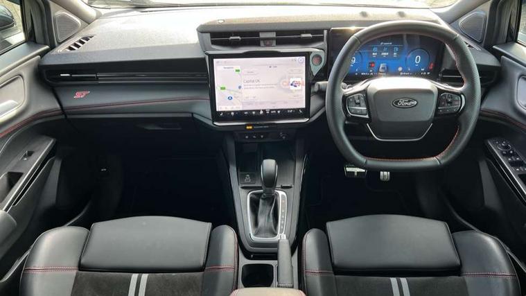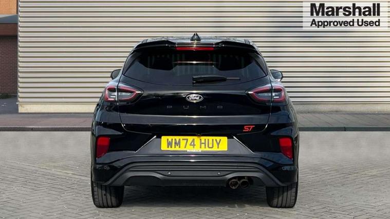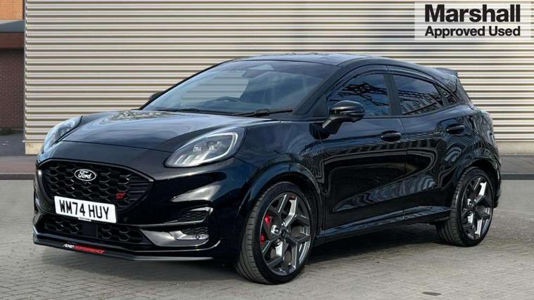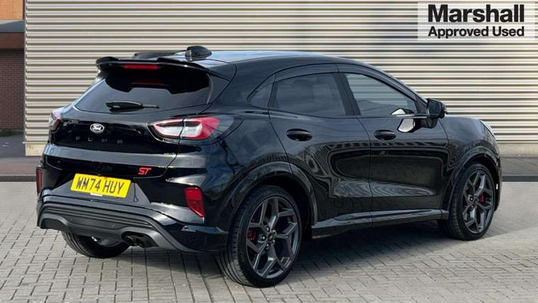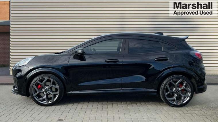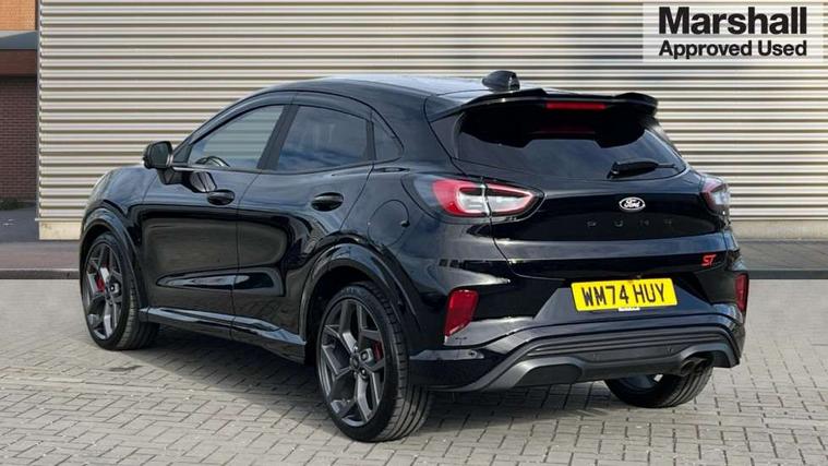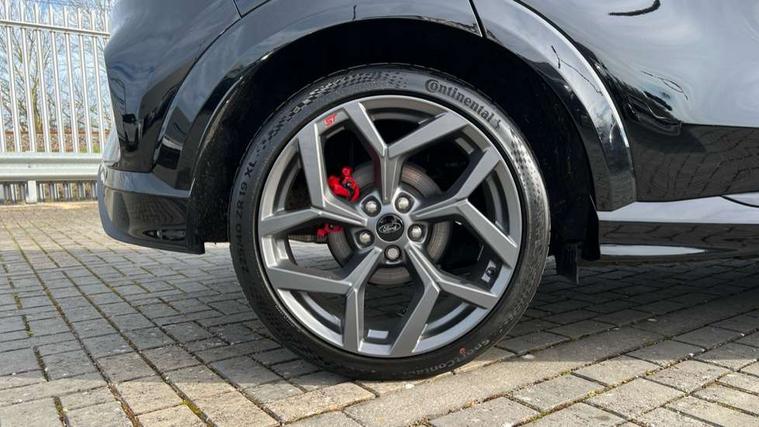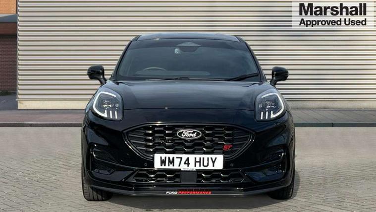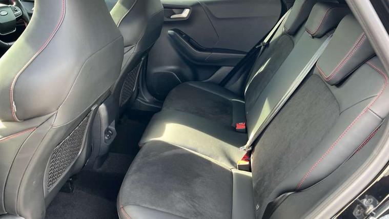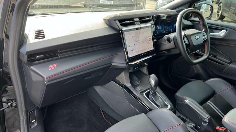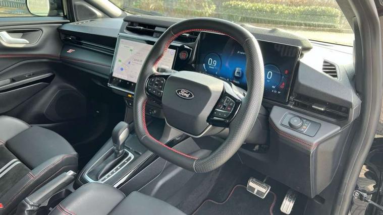 Driver impairment monitor, Emergency call service, Ford easy fuel, Full digital 12.8" instrument cluster, Lane keeping aid with lane departure warning, Power assist steering, Power lift tailgate, Selectable drive modes (normal, sport, eco, track), Speed sign recognition, ST suspension, 12" landscape touchscreen display with wireless apple car play and android auto premium B&O audio system with 10 speakers, Ford pass connect and emergency assistance, Ford SYNC4 with connected navigation, Automatic headlights with rain sensing wipers and auto high beam, Front fog lamps, Glare-free matrix LED headlamps, LED daytime running lights, LED rear lamps, LED third brake light, Power foldable heated door mirrors with puddle lamps and puma logo protection, Quickclear heated windscreen, Rear privacy glass, Rear side wing doors, Rear wiper, Unique ST body styling kit including wing mirrors and Ford Performance embossed splitter, 3 seat bench in 2nd row, Centre console with armrest and stowage, Electronic automatic temperature control (EATC), Ford megabox extended bootspace, Ford Performance seats premium synthetic leather upholstery, Front and rear head restraints, Front floor mats, Manual 6 way driver seat adjust with lumbar adjustment, Manual 6 way passenger seat with lumbar seat adjustment, Single front passenger seat, ST flat bottomed steering wheel with metal grey stitching, Driver assistance pack with blind spot information system - Puma for automatic transmission, Winter pack - Puma, 3 rear seatbelts, Child safety lock, Electronic stability control (ESC) and hill start assist, Pre-collision assist with autonomous emergency braking, pedestrian/cyclist detection & post-collision braking, Red brake calipers, Tyre pressure monitoring system (TPMS), Keyless entry and power start button, Keyless start and wireless charger, Thatcham alarm, 19" alloy wheels with magnetite dark finish, Tyre inflation kit,