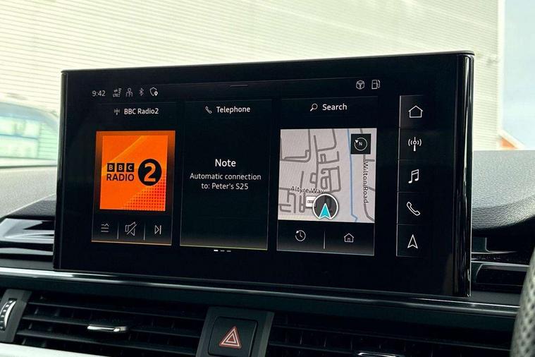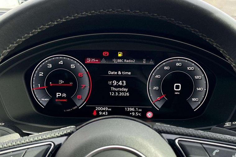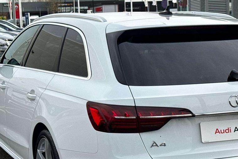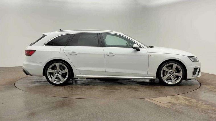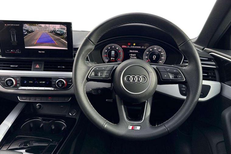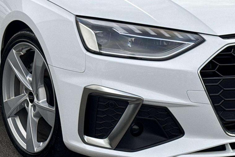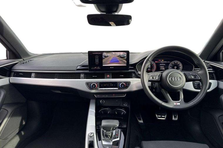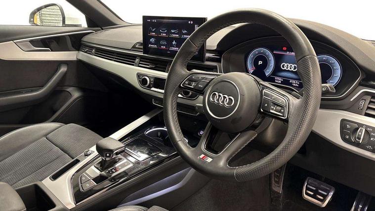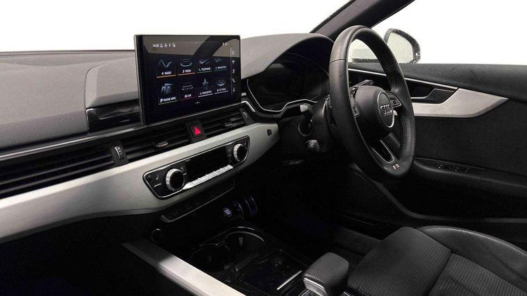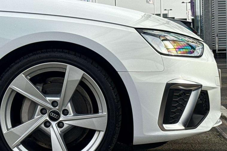 Audi connect safety and service (e-call), Audi connect with Amazon Alexa Integration, Audi drive select, Audi smartphone interface, Audi virtual cockpit, Automatic start-stop system with coasting functionality and efficiency programme, Bluetooth interface, Electromechanical power steering, Email, calendar and text messages displayed via MMI, MMI Navigation plus with MMI touch includes 10.1" high resolution colour MMI display, 3D map, Power operated tailgate, Voice control system, 54 litre fuel tank, Sports suspension lowered by 23mm, 2 USB charging ports, 8 passive loudspeakers, DAB digital radio reception, Aluminium roof rails, Auto dimming rear view mirror, Body colour door handles, Body colour front spoiler lip, Body colour side sill trim, Body coloured door mirrors, Electrically folding auto dimming/adjustable/heated door mirrors with LED side indicators and kerb view function for passenger side, Grained matt black side air inlets with matt aluminium silver inlay, High beam assistant, Honeycomb structure radiator grille in grained matt black, LED headlights with LED rear lights + dynamic rear indicators + headlight adjustment and high beam, turning light + LED daytime running lights, LED third brake light, Matt aluminium silver tailpipe trim, Privacy glass, Rain and light sensors, Rear side wing doors, Rear wiper, S Line badges on the front wings, S line front and rear bumpers with side skirts, S Line rear diffuser in matt anthracite black with trim strip in matt aluminium silver, S Line roof edge spoiler, Variable intermittent front wash/wipe, Windscreen with acoustic glazing, 3 spoke high multi-function sports leather steering wheel grips in perforated leather with S badging including paddle shift, 4 way electric lumbar support for driver and front passenger, 40/20/40 split folding 3 rear seat bench in 3 parts with rear centre armrest, Black cloth headlining, Black perforated leather gearknob, Contrast stitching on seats, steering wheel and gear lever gaiter, Deluxe 3 zone electronic climate control, Door sill trims with aluminium inlay, Electric load area cover, Front and rear head restraints, Front centre armrest, Heated front seats, Illuminated door sill trims with S logo, ISOFIX child seat mounting and top tether, Manual seat adjustment, Single front passenger seat, Stainless steel pedals and foot rest, High gloss package - A4, LED Interior light pack - A4/S4, 3 rear seatbelts, 6 airbags - Driver, front passenger, curtain and side windows, Electronic Stabilisation Control (ESC) including ABS, ASR and EDL, Hill hold assist, Multi collision brake assist, Pop-up bonnet for pedestrian protection, Pre sense city, Rear door child safety locks, Seatbelt monitoring, Warning triangle and first aid kit, Anti theft alarm, Anti theft wheel bolts, Central locking, Keyless Go, Matt brushed aluminium inlays, Tool kit, Tyre repair kit,