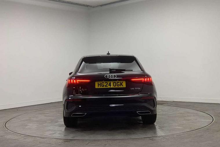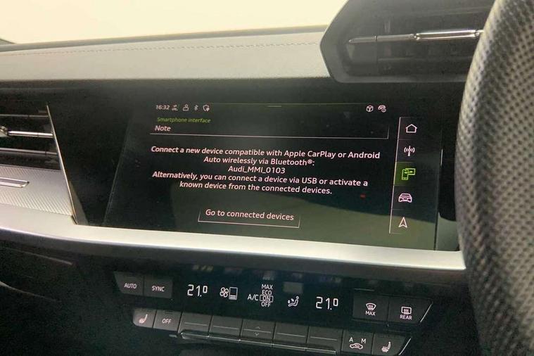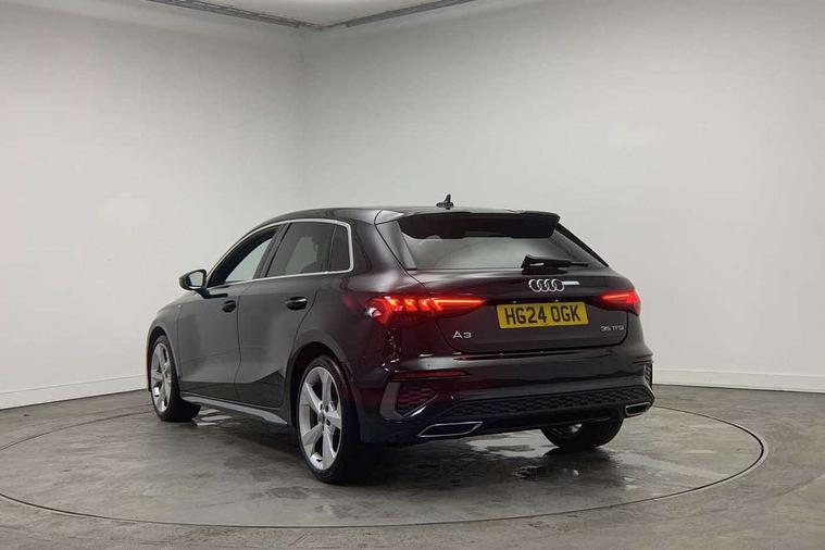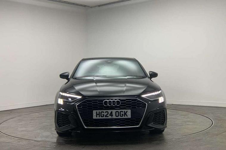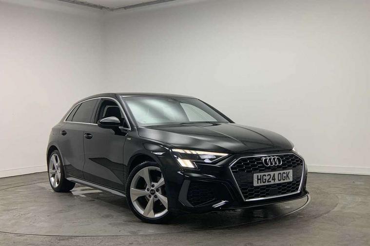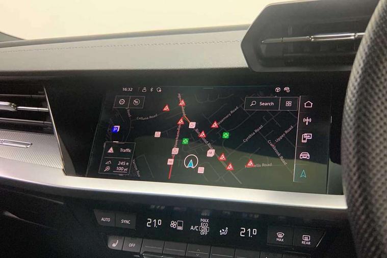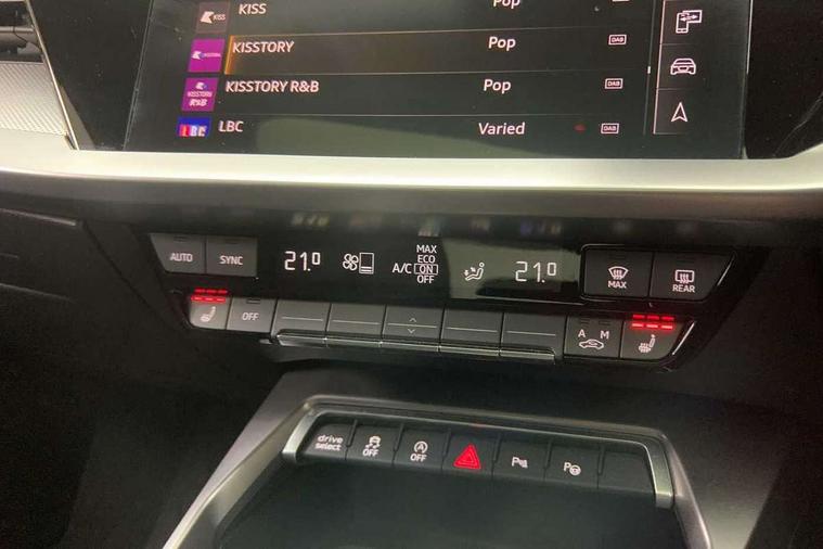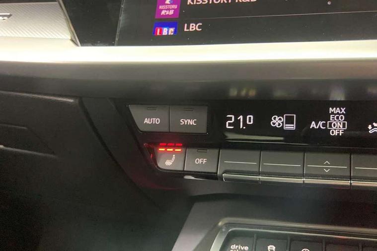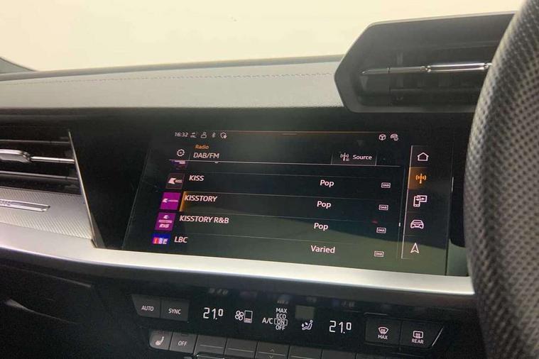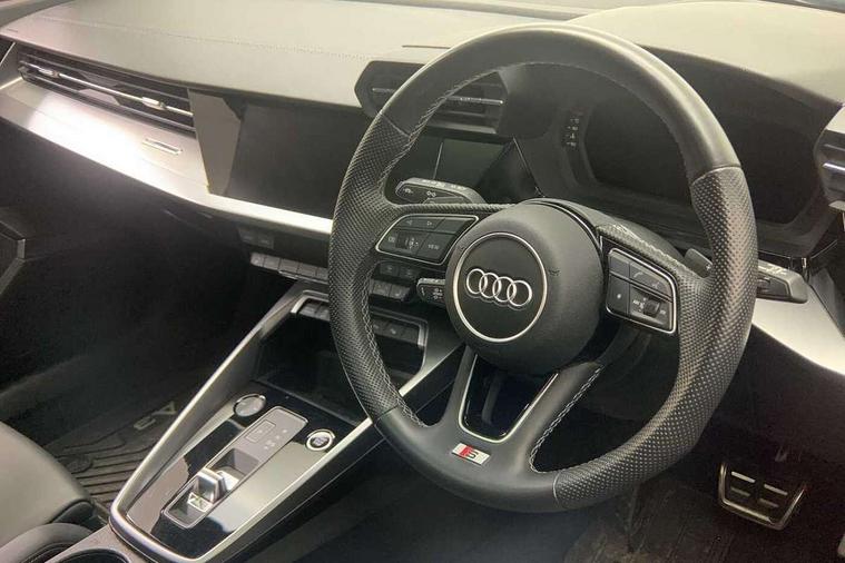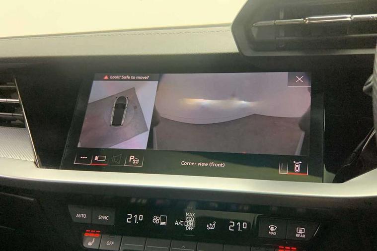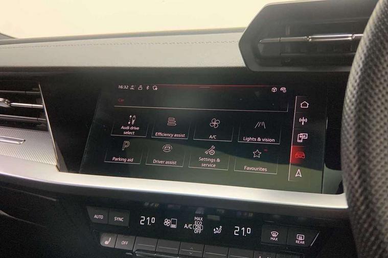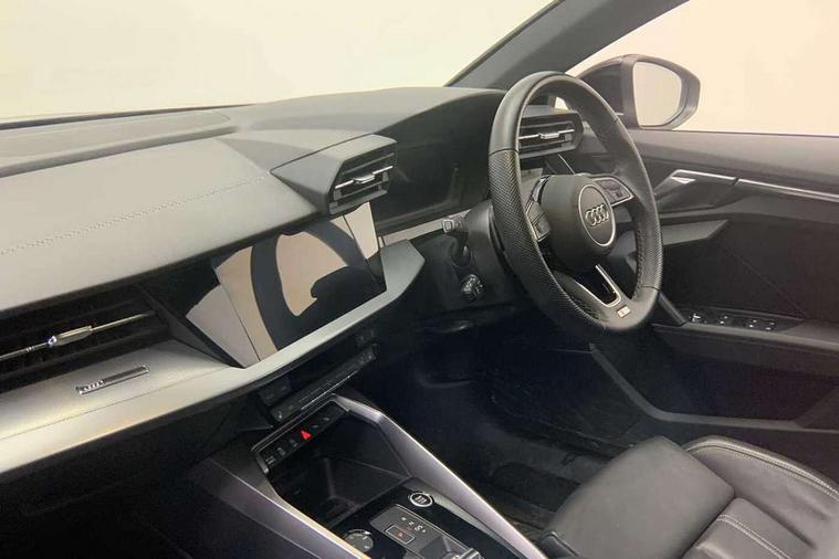 Audi drive select (Auto, Comfort, Dynamic, Efficiency and Individual), Audi smartphone interface, Audi Virtual Cockpit - 10.25" digital and colour instrument cluster, Automatic start/stop system with recuperation, Bluetooth interface, Camera based traffic sign recognition, Collision avoidance assistant, e-Call (emergency call), Electromechanical power speed sensitive steering, Lane departure warning system, MMI Navigation Plus with high resolution 10.1" colour touch screen display, Service indicator, Trip computer, Voice control system with natural language interaction, Sports suspension, 2xUSB-C connection with data and charging functions, 6 passive loudspeakers, DAB Digital radio, 3rd brake light, Acoustic glass windscreen, Aluminium window trim, Auto dimming frameless rear view mirror, Body colour exterior mirrors, Electrically adjustable/heated/folding/dimming door mirrors with kerb view includes integrated LED indications + kerb view function for passenger side, Front electric windows, Illuminated door sills with aluminium inserts at the front with S logo, LED daytime running lights, LED headlights with LED rear lights and dynamic rear indicators, Light and rain sensors, Privacy glass - dark tinted rear window, rear door and side windows, Rear electric windows, Rear side air outlets in grained matt black, Rear side wing doors, Rear wiper, S line bumpers, S roof spoiler, 12V socket and storage compartment in front centre console, 3 seat bench in 2nd row, 3 spoke leather multifunction steering wheel with paddle shift, 4 way electrically adjustable lumbar support for driver and front passenger, 60/40 split folding rear seat bench, Black cloth headlining, Dual zone electronic climate control, Front and rear centre armrest in artificial leather, Front and rear headrests, Front/rear floor mats, Height and reach adjustable steering wheel, Interior lighting - glove compartment light and right hand side, Luggage compartment floor covering, Manual boot compartment lid, Manually adjustable front seats, Seat side bolsters, Single front passenger seat, Stainless steel pedals and front footrest in black, Twin leather upholstery with front sports seats S embossed logo, Aluminium interior elements pack - A3 Sportback, LED interior lighting pack - A3 Sportback, S line styling pack - A3 Sportback, 3x3 point rear seat belts, Driver and front passenger airbag with passenger airbag deactivation, Electronic Stabilisation Control (ESC) including ABS, ASR and EDL, First aid kit with warning triangle and 2 safety vests, Front side airbags with head airbags and interaction airbag, Pre-sense front with pedestrian and cyclist detection, Seatbelt monitoring, Tyre pressure loss indicator, Anti theft alarm, Anti-theft wheel bolts, Electronically operated child locks, Immobiliser, Remote control central locking, Dark spectrum aluminium inlays, accent surfaces in the dashboard and centre console in platinum grey silk effect paint finish,