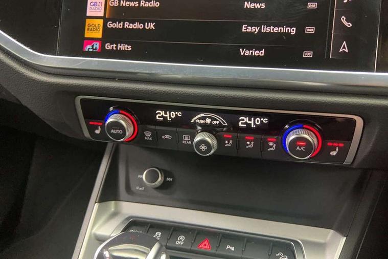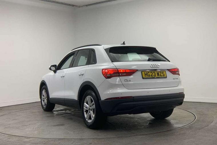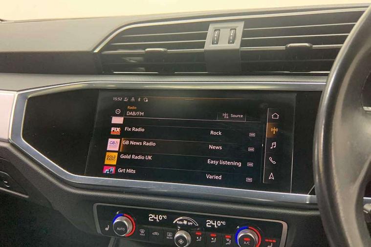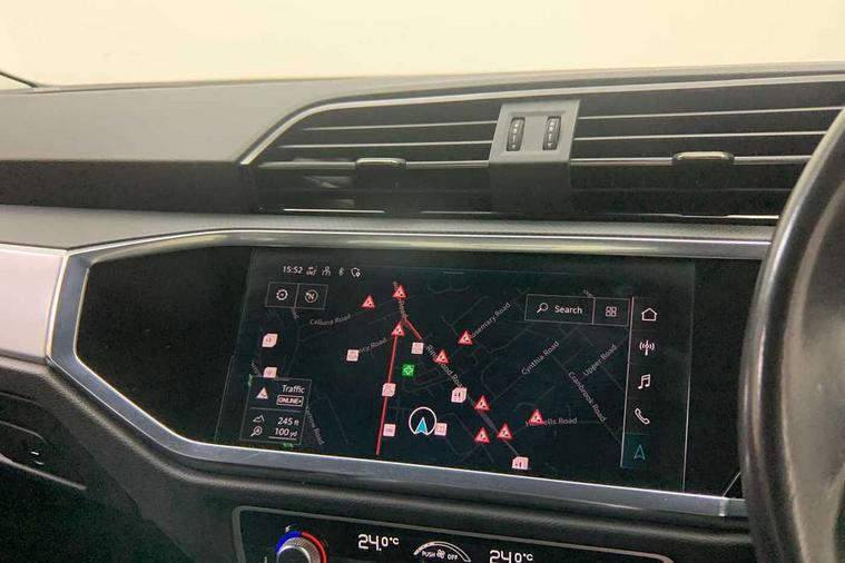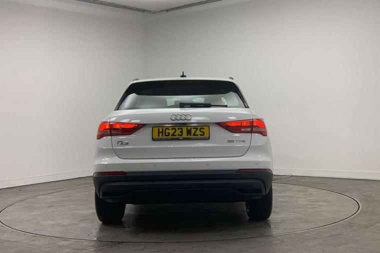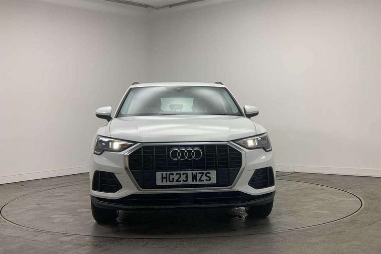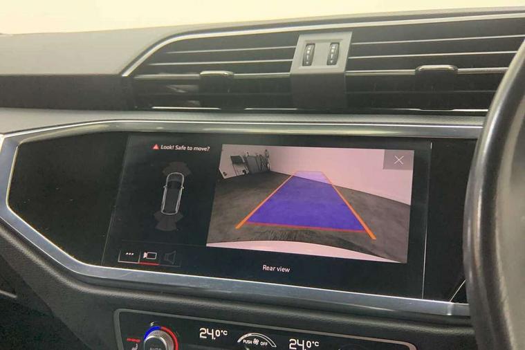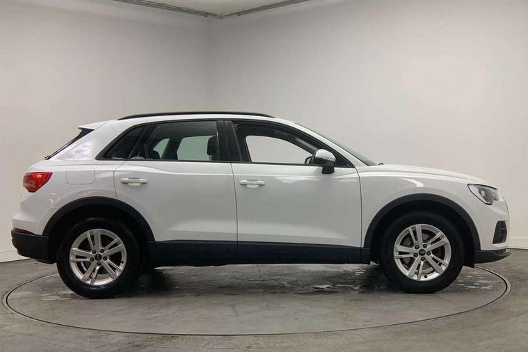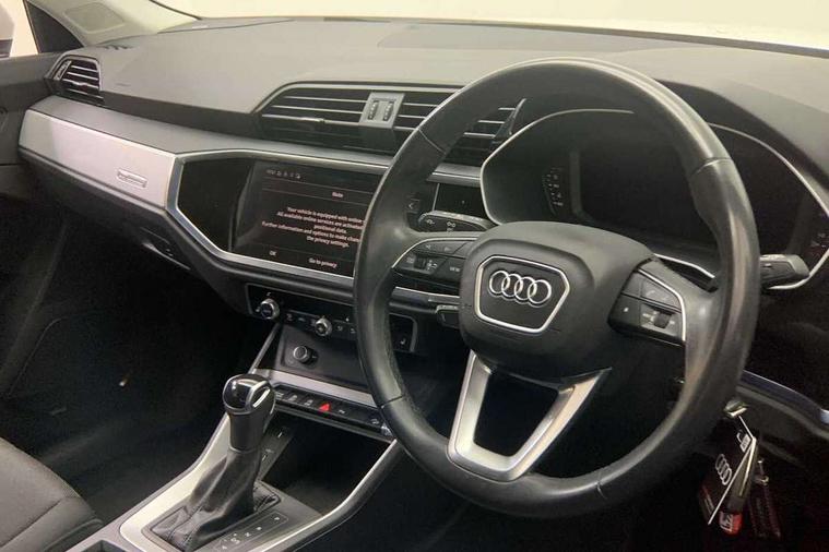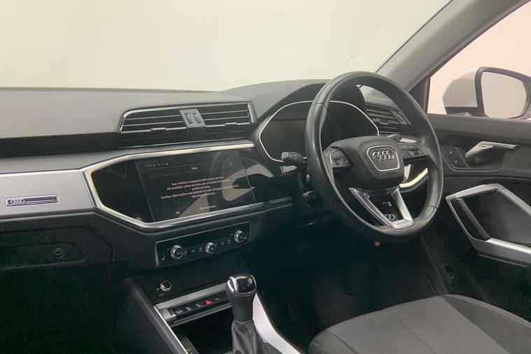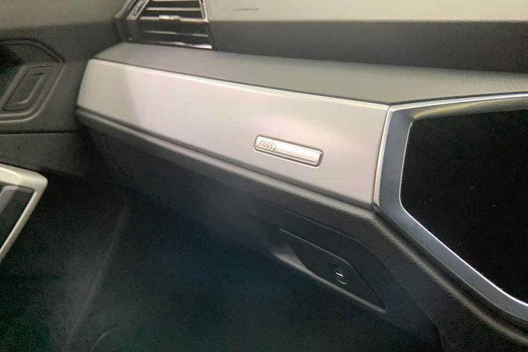 Amazon alexa Integration, Audi drive select, Audi lane departure warning, Audi Virtual Cockpit - 10.25" display, Bluetooth interface, Camera based traffic sign recognition, Legal emergency call, MMI Navigation Plus with high resolution 10.1 inch touchscreen colour display, Power operated tailgate, Progressive steering, Service interval indicator, Smartphone interface includes wireless Apple carplay/Android Auto, Start stop system with recuperation, Voice control system with natural language interaction, Standard suspension, 2 USB-C ports with charge and data functions, 6 passive loudspeakers, DAB digital radio module, Acoustic windscreen, Auto dimming frameless rear view mirror, Black roof rails, Body colour door mirrors, Diffuser in grained anthracite, Electrically folding, adjustable and heated door mirrors with integrated LED side indicators and kerb view function for passenger side, Exterior bumper with wheel arch trims and side sill trims in grained black matt, Front and rear electric windows, Grained radiator protective grille, Halogen rear lights, LED headlights with LED daytime running lights, Rain and light sensors, Rear side wing doors, Rear wiper, Third brake light, Variable front intermittent wipers, 12V socket in rear centre console, 3 seat bench in 2nd row, 3 spoke multi-function leather steering wheel, 40:20:40 folding with manual adjustment for 60:40 forwards/backwards position and backrest angle, Dual zone electronic climate control, Front and rear floor mats, Front and rear headrests, Front and rear roof module including reading lights, Front centre armrest, Glove compartment lighting, Height and reach adjustable steering wheel, ISOFIX child seat mounting for front passenger with airbag deactivation and outer rear seat including top tether attachment point for outer rear seats, Luggage compartment light, Lunar silver cloth headlining, Manual front seats with height adjustment, Single front passenger seat, Stainless steel luggage compartment sill finisher, Non smoking pack - Q3, 3x3 point rear seatbelts, 6 airbags - Driver, front passenger, curtain and side windows, Audi pre-sense front with pedestrain and cyclist recognition, Electrically operated child locks on rear doors, Electromechanical parking brake, Electronic stabilisation control including ABS, ASR and EDL, Front seatbelt reminder, Hill descent control, Hill hold assist, Pre sense basic, Seatbelt monitoring, Tyre pressure warning, Warning triangle and first aid kit, Anti theft alarm, Anti theft wheel bolts, Immobiliser, Remote central locking, Detail dashboard around MMI touch colour display in glass look, black with surround in aluminium look, Micrometallic silver inlay, 17" 5 twin spoke design alloy wheels,