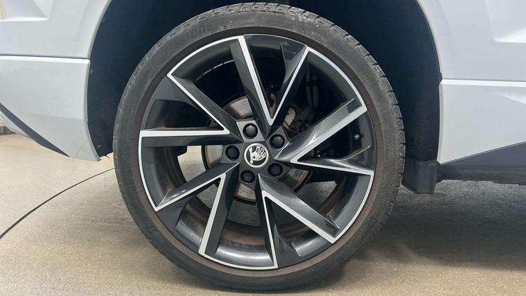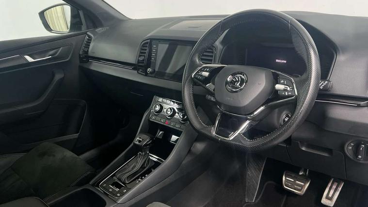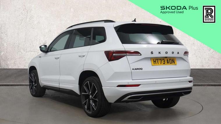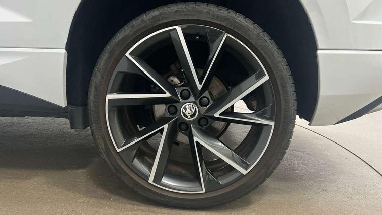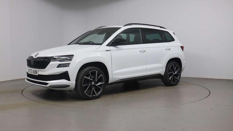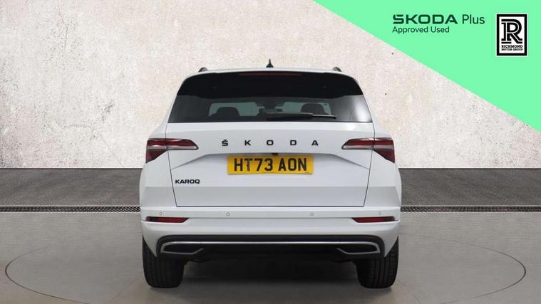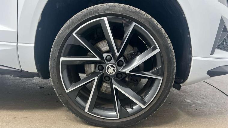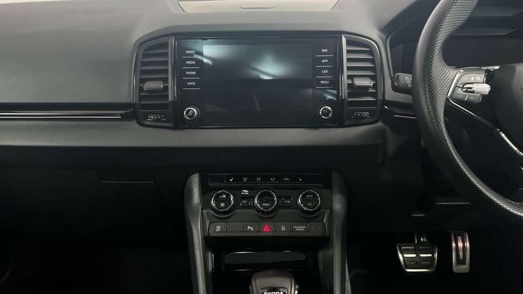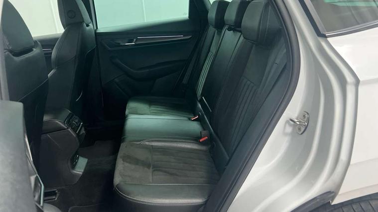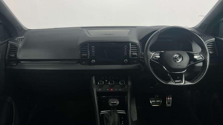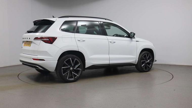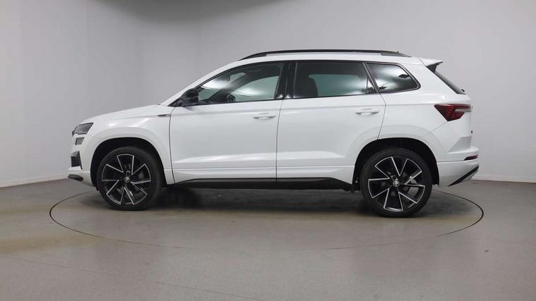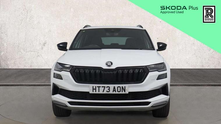 8" Digital display, Care connect, Driver fatigue sensor, Emergency services call system, Outside temperature gauge, Service interval indicator, SmartLink wireless for Apple and wired for Android, Start/stop system with regenerative braking, USB C Port x 2 in front centre console, Virtual cockpit, Virtual pedal with electrically operated boot door, 8 Speakers, DAB radio with Bluetooth, USB connection, Wireless charging without wireless aerial connection, Acoustic glass, Aero front windscreen wipers with intermittent function, Auto dimming rear view mirror with light and rain sensors, Black door mirrors, Black electric window control buttons, Black radiator grille, Black roof rails, Body colour door handles, Electric front and rear windows with child proof lock, Front door steps with SportLine logo, Heated rear windscreen, LED daytime running lights, LED rear lights with high functionality welcome effect and dynamic indicators, Light assistant (coming/leaving home/tunnel light), Panoramic sliding sunroof, Plastic scuff plates, Privacy glass, Protective door side sills in body colour, Rear diffuser, Rear side wing doors, Rear spoiler, Rear window wiper with washer system and intermittent control, Safety reflectors on front doors, Skoda lettering on tailgate in black, Sportline badge on front fender, Sportline decorative inserts with badging, Sports front and rear bumpers, 1.5 litre bottle holders in driver and front passenger door panels, 12V socket in boot, 12v socket in front centre armrest with storage compartment and rear air vents, 3 rear height adjustable headrests, 3 seat bench in 2nd row, 3 spoke leather sports multifunction steering wheel and silver stitching with gear shift paddles, 4 foldable roof handles with rear coat hooks, Black floor carpet, Black roof headlining, Chrome inner door handles, Double sided boot floor, Foldable hooks in the boot, Front head restraints, Height adjustable front three point seats belts with tensioners, Height/reach adjust steering wheel, Ice scraper, Illuminated glovebox, Illuminated luggage compartment, Isofix child seat preparation outer rear, Manual lumbar support for front seats, Pen holder, Pollen filter, Rear boot cover, Rear reading lights, Rear seats fixed folding and divided 60:40, Rubbish bin door, Safety vest holder, Single front passenger seat, Storage box in upper central dashboard closed, Sunvisors with illuminated vanity mirrors, Textile floor mats, Ticket holder, Titan black interior ceiling, Welcome animation with sportline logo, Boot pack - Karoq, Light Pack - Karoq, Parking pack - Karoq, Automatic door unlocking in case of crash, Automatic fuel cut off in case of crash, Child locks on rear doors, Driver airbag, Electronic parking brake with auto hold function, Emergency rear braking signal, ESC including ABS, MSR, ASR, EDS, HBA, DSR, RBS, MKB and traction control, Front side airbags, Hill hold control, Knee airbags, Passenger airbag with switch-off function, Pedestrian monitor, Seatbelt reminder signalisation and pretensioner for all seats, Three point seatbelts rear, Two tone horn, Tyre pressure display, Tyre pressure monitor, Alarm with interior monitoring, back up horn and tilt sensor with safe function, Electronic engine immobiliser, Keyless entry and start/stop, Remote central locking with 2 remote folding keys, Black air vent surround, Black centre console, Satin black dashboard, Satin black door trim, 19" Sagitarius anthracite alloy wheels with matt black aero inserts, Anti-theft wheel bolts protection, Matt black aero hub caps, Tool kit,