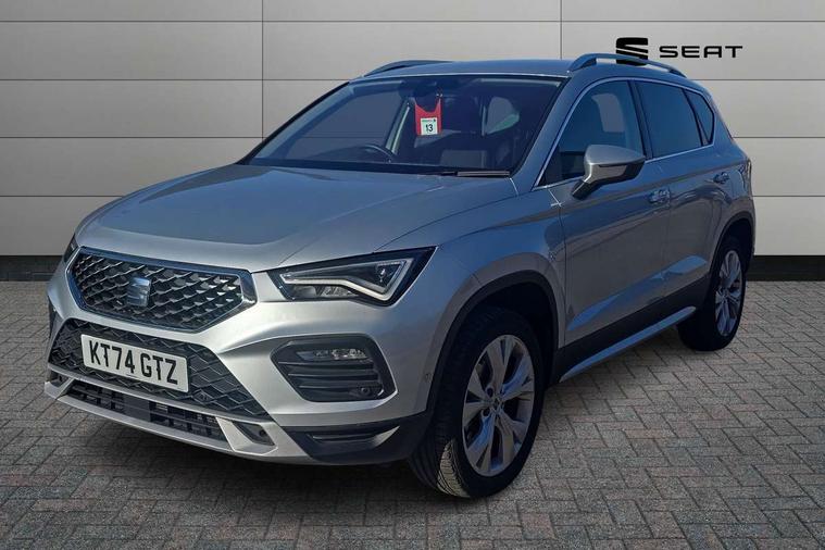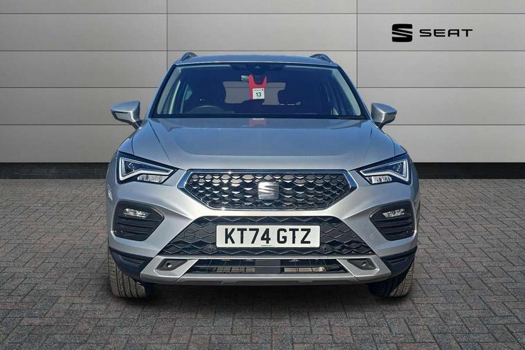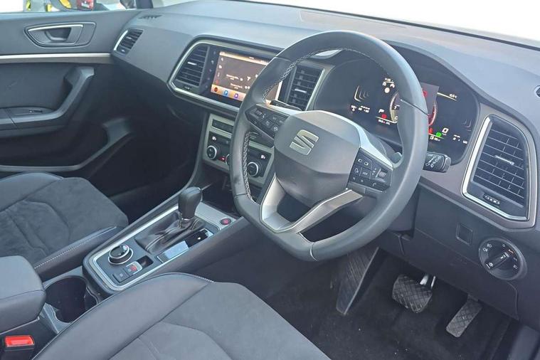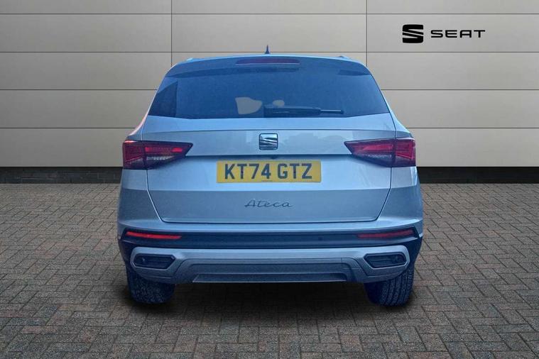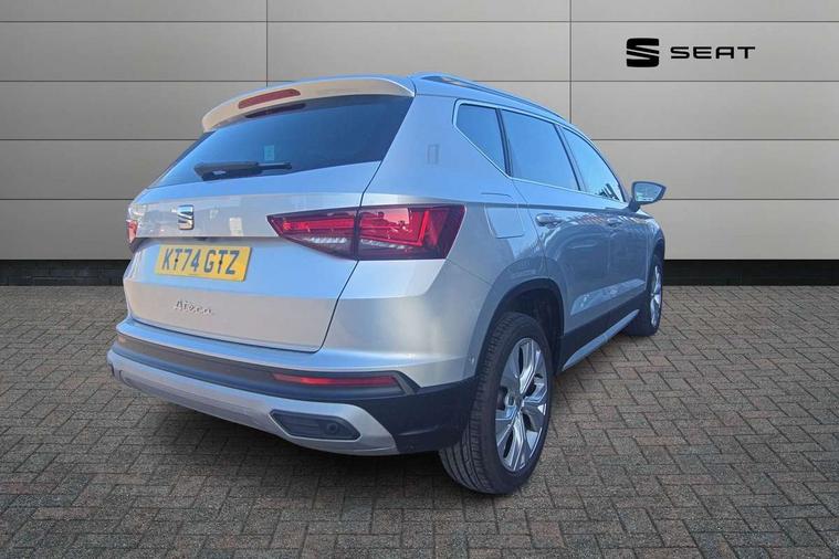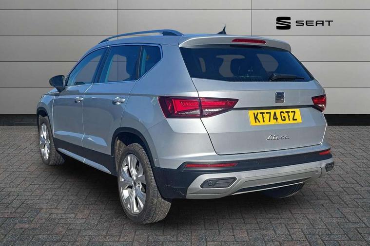 8" Digital cockpit, Colour multi-function on board computer display, E-call, Electric tailgate, Outside temperature gauge, Progressive power assisted steering, Rear view camera, SEAT drive profile with driving experience button - Normal, Sport, Eco and Individual mode, gearshift, steering and throttle response, Self parking functionality (includes front and rear parking sensors), Start/stop system, Trip computer, wired and wireless full link smartphone integration, Wireless phone charger, Steering wheel mounted audio/phone controls, Black wheel arch surrounds, Body colour bumpers, Chrome front grille frame, Chrome roof rails, Chrome side window trim, Dark tinted rear windows, Daytime running lights, Door mirrors with welcome light silhouette, Dynamic headlight range control with self adjusting whilst driving, Electric adjustable/heated/folding door mirrors, Front and rear electric windows, Front grille hot stamping, Full LED headlamps with lens and LED front fog lamps with cornering function, Heat reflecting windscreen, Illuminated aluminium front door sill, LED 3rd brake light, LED rear tail lights with dynamic indicators, Rear exhaust tailpipe, Rear fog lights, Rear side wing doors, Rear wash/wipe, Reflex silver side mouldings, Variable front intermittent wipers, 12V socket in front, 3 seat bench in 2nd row, 60/40 split folding rear seat, Dinamica upholstery with front comfort seats, Drawer under right front seat, Dual zone climate control, Front and rear head restraints, Front centre armrest, Front seat back storage pockets, Height adjustable driver and passenger seat with lumbar adjustment, ISOFIX points in outer rear seats with top tether anchorage points, Leather sports steering wheel and gear knob, Rear armrest and easy back seat release mechanism from boot, Single front passenger seat, Steering wheel mounted gearshift paddles, Convenience pack - Ateca, Interior lighting pack - Ateca, Navigation system pack with DAB - Ateca, Safety and driving pack (M) - Ateca, Safety and driving pack with attention and drowsiness assist - Ateca, 3x3 point rear seatbelts, ABS, Traction control system (TCS), Electronic stability control (ESC) and Electronic differential lock system (XDS), Airbags - Driver and front passenger airbag with deactivation, front side, two curtain and driver's knee airbags, Electric parking brake with auto hold function, Front and rear seatbelt reminder, Hill hold control, Manual rear child locks, Single tone horn, Tiredness recognition system, Tyre pressure monitoring system, Alarm, Keyless entry, Locking wheel bolts, Remote central locking, Chrome interior detailing, 18" Brillaint silver alloy wheels,