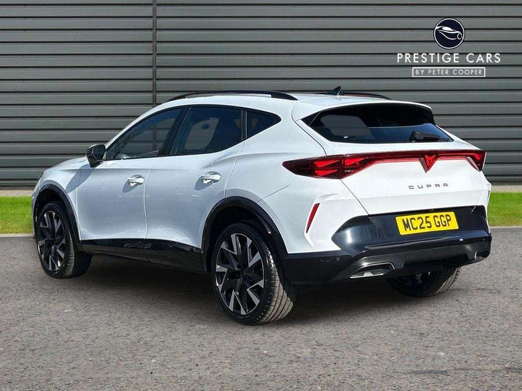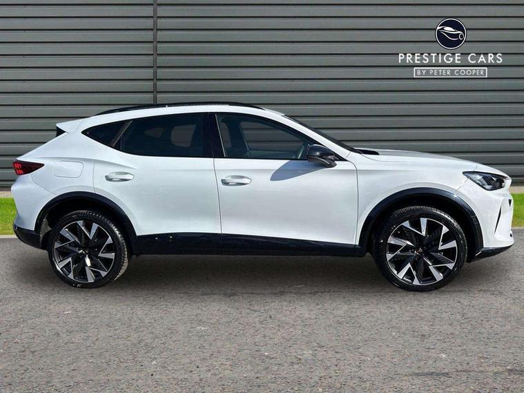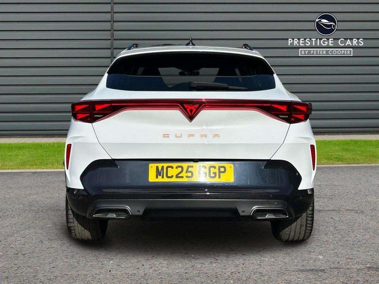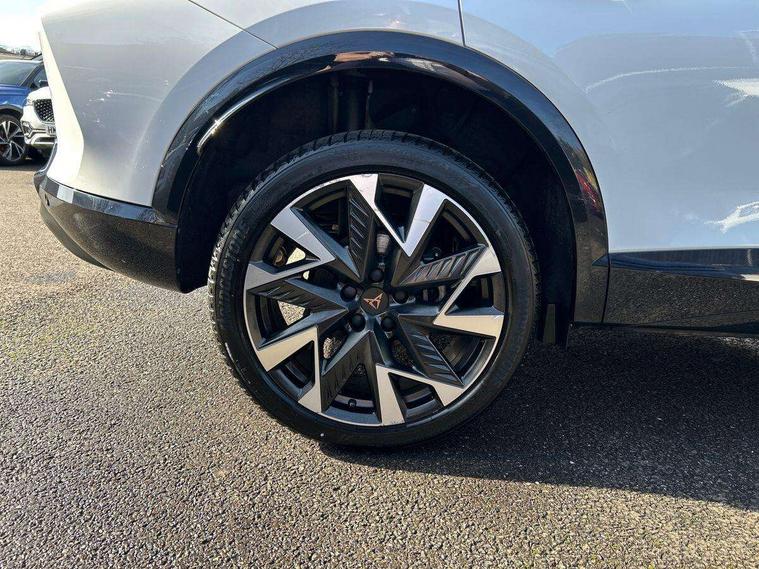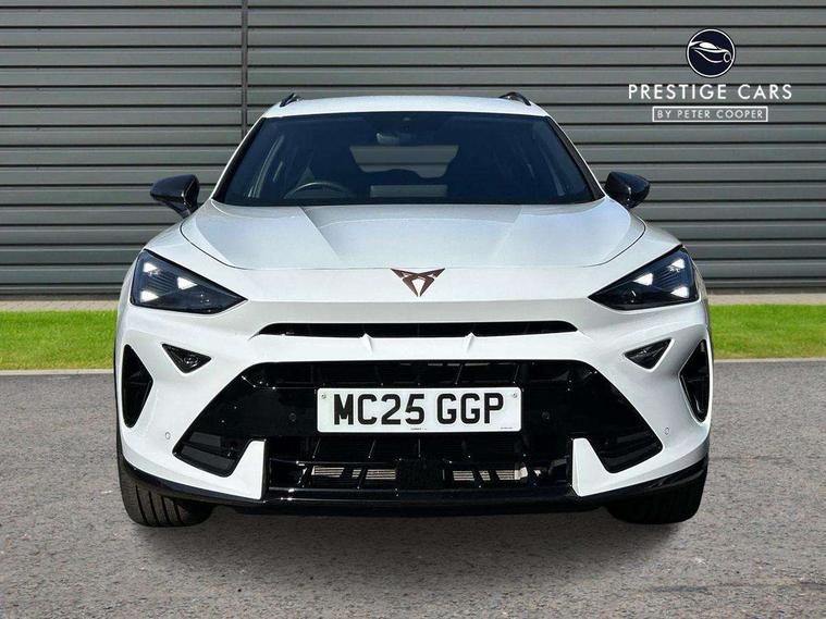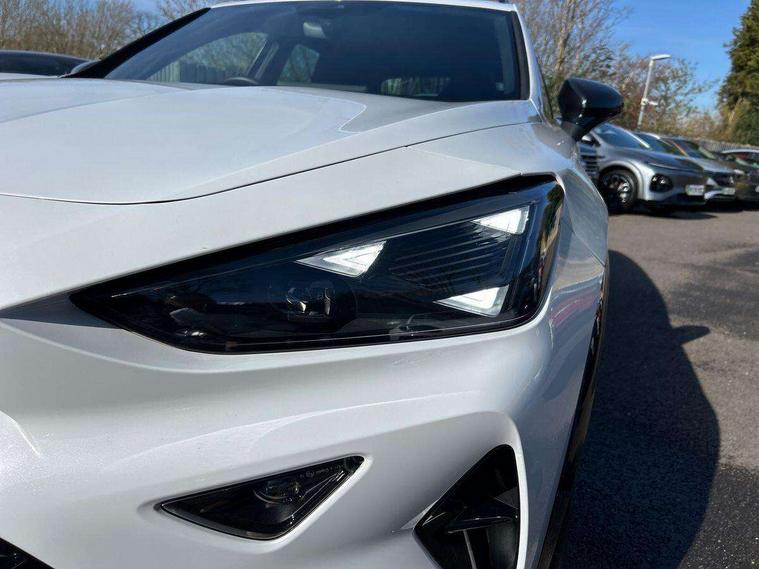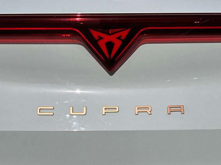 10.25" digital cockpit and configurable dashboard, Adaptive cruise control with follow-to-stop and speed limiter, Advanced driver alert system, Driving profile selection, Dynamic road sign display, Emergency steering support with turn assist, Forward collision warning with automatic braking, Front and rear parking sensors, Full link phone integration, Lane assist, Progressive steering, Rear view camera, RPM, trip computer, outside temp gauge, instrument light brightness, low fuel warning light, lights on reminder, gearshift indicator, Service interval indicator, Start/stop system with regenerative braking, Virtual pedal and electric tailgate, Voice control system, Wired Android Auto, Wireless apple carplay, Wireless phone charger, CUPRA sport suspension, Electronic locking differential and dynamic traction support, 2 front and 2 rear USB type C sockets, Media system with navigation, 12.9" touchscreen display, voice control, DAB, steering wheel mounted controls, Auto dimming rear view mirror, Body colour door handles, Body coloured bumpers, Dark grey wing mirror, Daytime running light with automatic headlight control and coming home feature, Door panel ambient lighting, Dynamic headlight range control, Electric front/rear windows, Electrically adjustable heated and folding door mirrors with memory function, Gloss black roof rails and window surrounds, High beam assist, LED 3rd brake light, LED front fog lamps with cornering function, LED Headlights, LED Taillights with dynamic indicator, Rain sensing wipers, Rear diffuser with black simulated exhaust pipes, Rear fog lights, Rear side wing doors, Rear wash/wipe, Tinted rear windows, Welcome lights (within exterior mirror housing), 12V socket, 2 front and 2 rear reading lights, 3 seat bench in 2nd row, 60/40 split rear bench seat with armrest and mechanical seat release, Black headlining, Black interior roof lining, Cupra sports pedals, Dust/pollen filter, Electrically adjustable driver's seat with memory and lumbar support, Front and rear head restraints, Front centre armrest, Heated front seats, Heated supersports multifunction leather steering wheel with satellite buttons and gear shift paddles, Height/reach adjust steering wheel, Illuminated aluminium doorsteps, Illuminated interior front door sills, Illuminated sunvisor with mirror, Isofix, Leather dashboard, door insert and side trim panel, LED smart wraparound lighting, PVC/Dinamica microfiber upholstery + bucket seats, Satellite steering wheel, Single front passenger seat, Storage pockets on rear of front seats, Three zone climate control with control panel in rear, Variable luggage/load compartment floor, 3 point seatbelts on all rear seats, ABS, Brake control system - ESC and brake booster, Child proof door locks, Driver and front passenger airbags with front passenger airbag de-activation, Electronic parking brake, Front and rear disc brakes, Front side curtain airbags, Hill hold control, Public e-call, Seat belt reminder for front and rear seats, Tyre pressure monitoring system, Anti theft alarm system, KESSY Advanced - Keyless start, keyless entry with SAFELOCK, Locking wheel bolts, Copper and aluminium interior detailing, 19" Sandstorm machined sport black and silver alloy wheels,