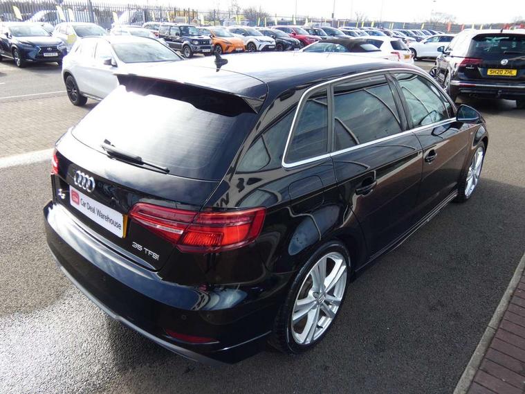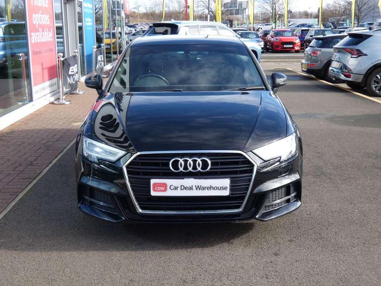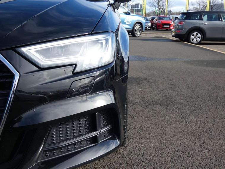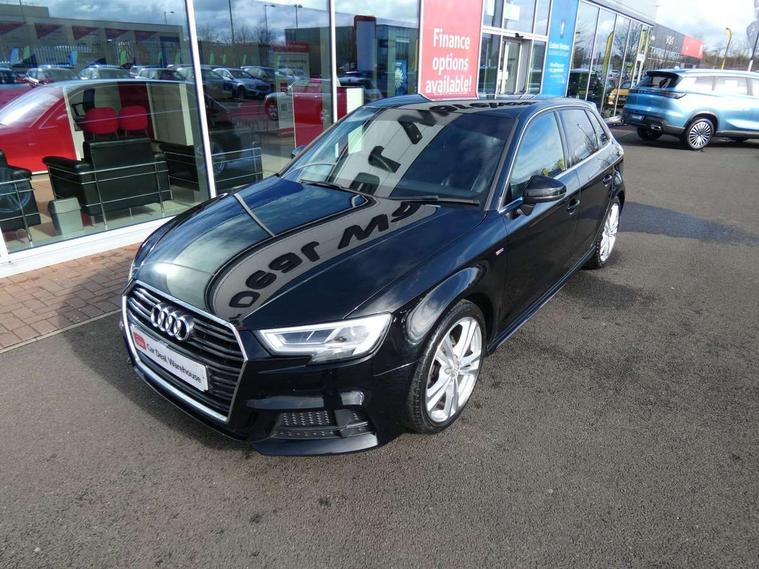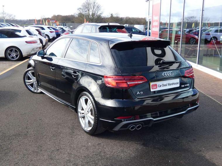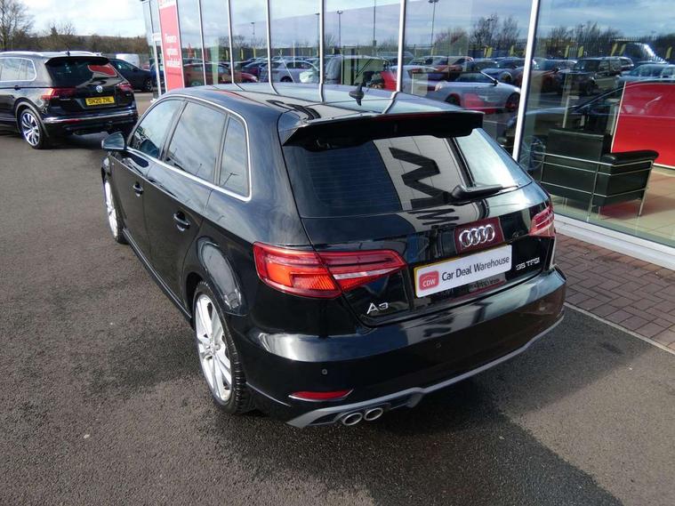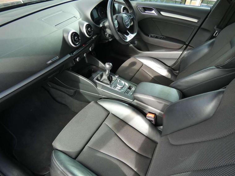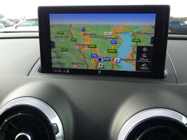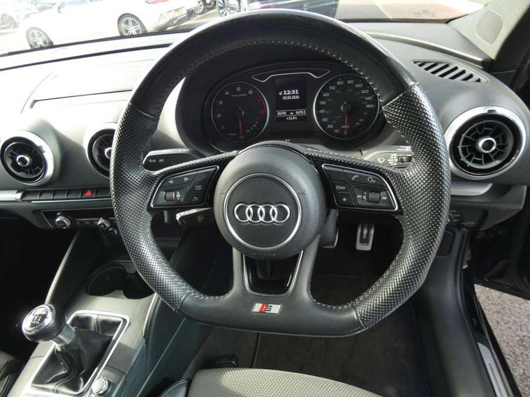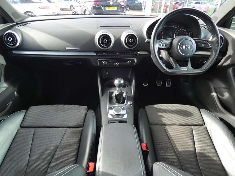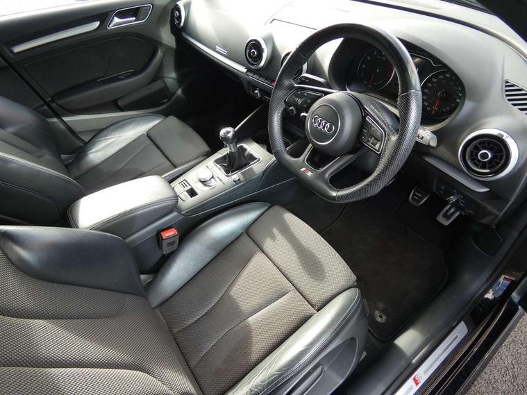 Audi connect, Audi drive select, Audi smartphone interface, Automatic start/stop system, Colour driver's information system display, Electro - mechanical power assisted steering, Mobile telephone preparation - bluetooth interface, SD card based satellite navigation system, Service interval indicator, Speed limit display, Voice control system, Voice recognition for navigation system, 2 USB interfaces and Aux-In jack, Audi music interface, CD player, DAB Digital radio, MMI radio plus with 7" colour MMI screen and MMI controller, Aluminium window trim, Auto dimming rear view mirror with light and rain sensors, Body colour door mirrors, Chrome exhaust tailpipes, Electric front windows, Electric rear windows, Electrically adjustable and heated door mirrors with integrated LED side indicators, Heated windscreen washer jets, LED daytime running lights, Matt black radiator grille, Rear wiper, S line badges on front wings, S Line body styling with front & rear bumpers and side skirts, radiator grille and rear diffuser insert, roof spoiler, Sport specific side air inlet grille and diffuser insert, 3 adjustable rear headrests, 3 spoke flat bottomed multi-function leather sport steering wheel, 4 lashing points to secure luggage, Adjustable front centre armrest, Black cloth headlining, Dual zone electronic climate control, Front and rear interior lights with delay, Front/rear floor mats, Glovebox light, Height and reach adjustable steering wheel, Illuminated door sill trims with S logo, Isofix child seat preparation for front passenger/outer rear seats inc passenger airbag deactivation, Stainless steel pedals, Storage compartments in doors side trims, centre console and under front drivers seat, Tool kit, LED interior light pack - A3/RS3, Non smoking pack - A3, Storage and luggage pack - A3/RS3, 3 point seatbelts on all seats, ABS/EBD, Active bonnet, Active front headrests, Airbags - front driver/passenger, front & rear side, curtain, drivers knee, ASR, EDL, Electromechanical parking brake, ESC - Electronic Stability Control + traction control, Front passenger airbag deactivation, Hill hold assist, Manual rear child locks, Multi-Collision braking, Seatbelt warning, Tyre pressure warning, Warning triangle and first aid kit, Anti theft alarm, Anti-theft wheel bolts, Remote control central locking, Thatcham category 1 alarm + immobiliser, Aluminium air vent surrounds, Aluminium trim elements, Matt brushed aluminium inlays, Tyre repair kit,