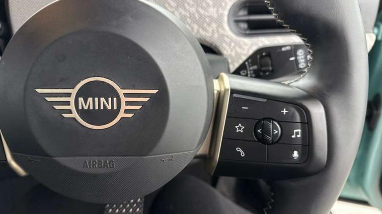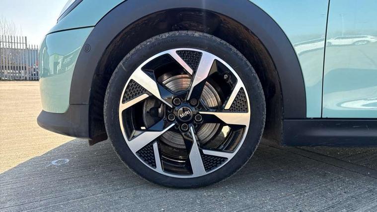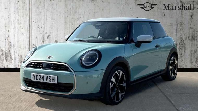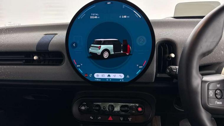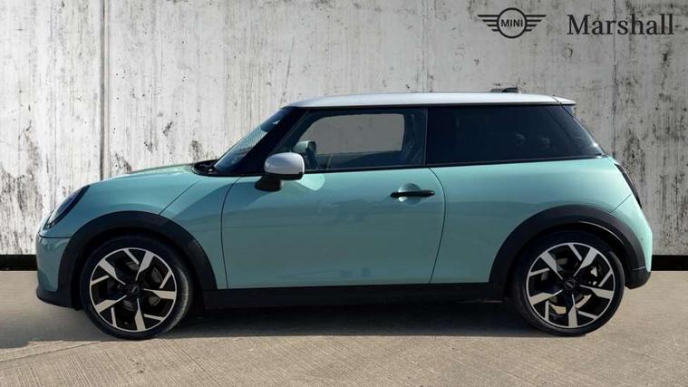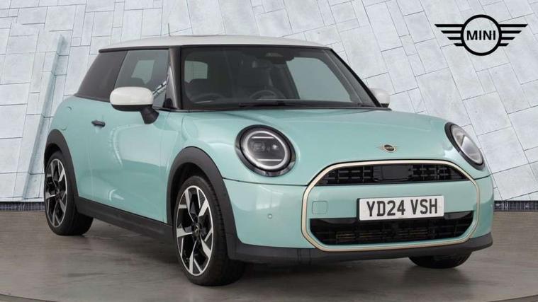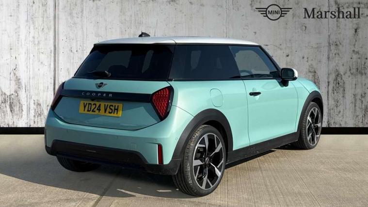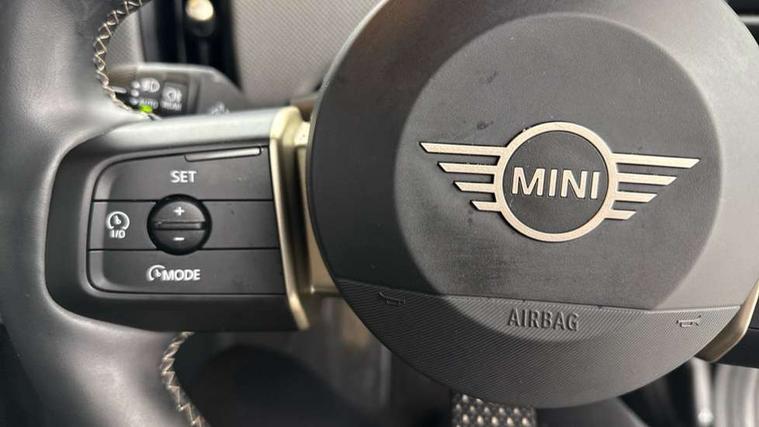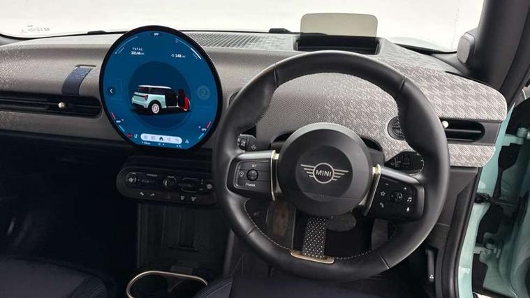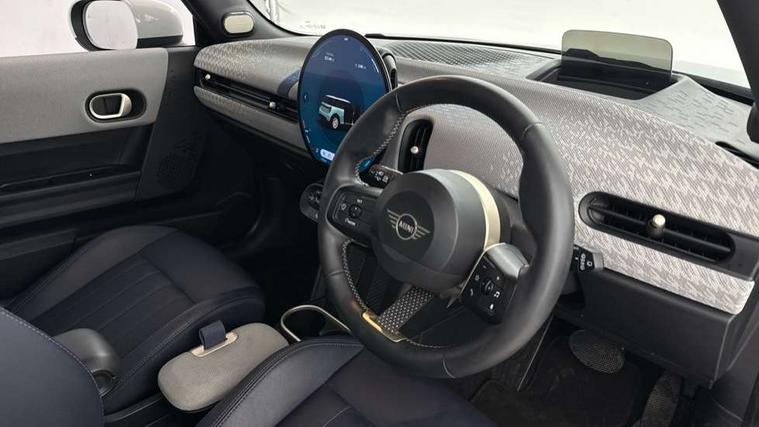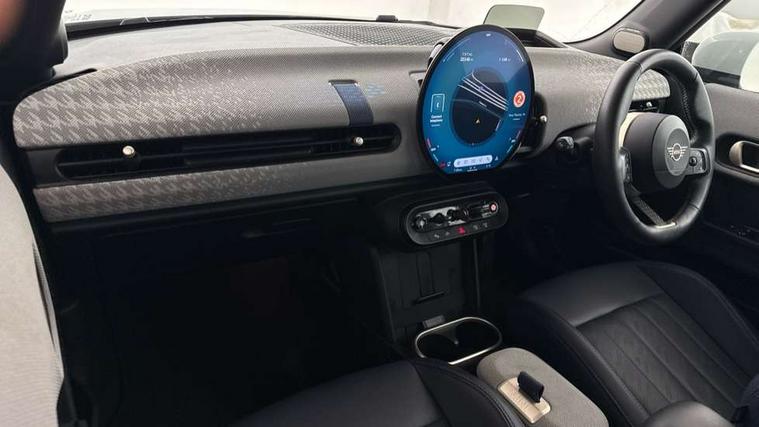Central toggle bar, Circular OLED Screen, Compatible mobile phone bluetooth with audio streaming, Cruise control, Digital instrument cluster, Electro-mechanical speed dependant steering assistance, Emergency call service, MINI Experience Modes, Mini navigation system, On board computer, Service interval indicator, 7 speed steptronic transmission with double clutch, DAB Digital radio, Personal eSim, Auto headlights, Electric adjustable heated door mirrors, Electric front windows, Heated rear window, Heated windscreen washer jets, LED daytime running lights, LED Headlights, LED indicator lights, LED rear lights, Logos in Vibrant Silver, Rain sensor window wipers, Rear fog lights, Rear window wiper, Vibrant silver grille surround, 2 seat bench in second row, 2 zone automatic air conditioning, 60/40 rear seat bench, Ambient lighting, Cupholders, Dark headliner, Floor mats, Front and rear head restraints, Front compact armrest, Heated steering wheel, Height adjustable passenger seat, Lidded storage box in grey knit, Luggage compartment lighting, Single front passenger seat, Sport Vescin Steering Wheel, Sunvisors with vanity mirrors, Vescin synthetic leather upholstery, Driving assistant pack - Cooper Hatchback, Park assistant pack - Cooper Hatchback, 3 point seatbelts on all four seats, 6 Airbags - front, side, head and seat belt tensioners, Acoustic pedestrian protection, Anti-lock braking system (ABS), DSC - Dynamic Stability Control, Electronic parking brake, Front and rear disc brakes, Front ISOFIX (iSize), Front passenger airbag deactivation, Traction control, Tyre pressure monitoring system, Alarm, Immobiliser, Remote central locking, Blue decorative dash strap, Light Beige/Grey dash knit, Tyre repair kit,