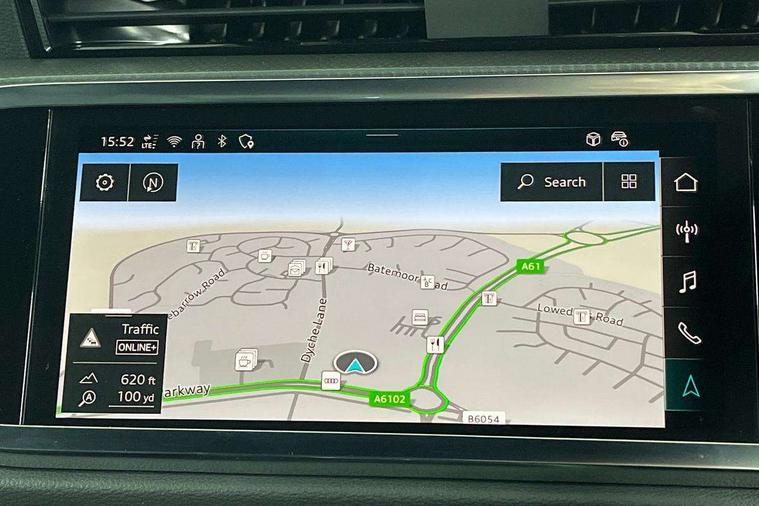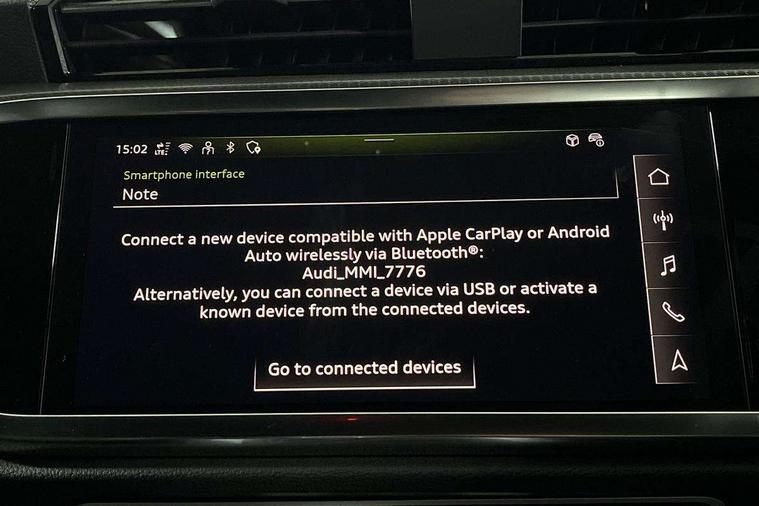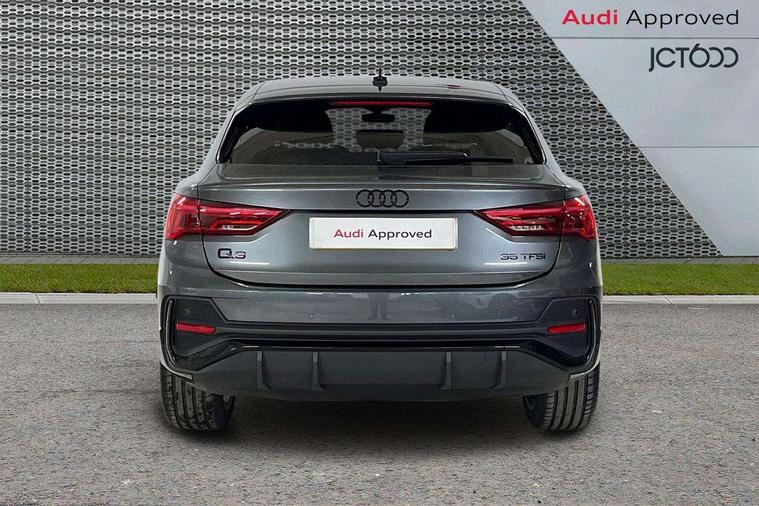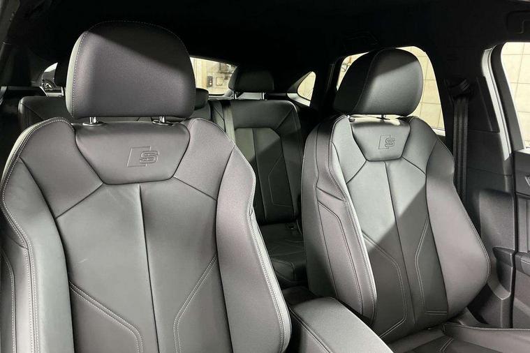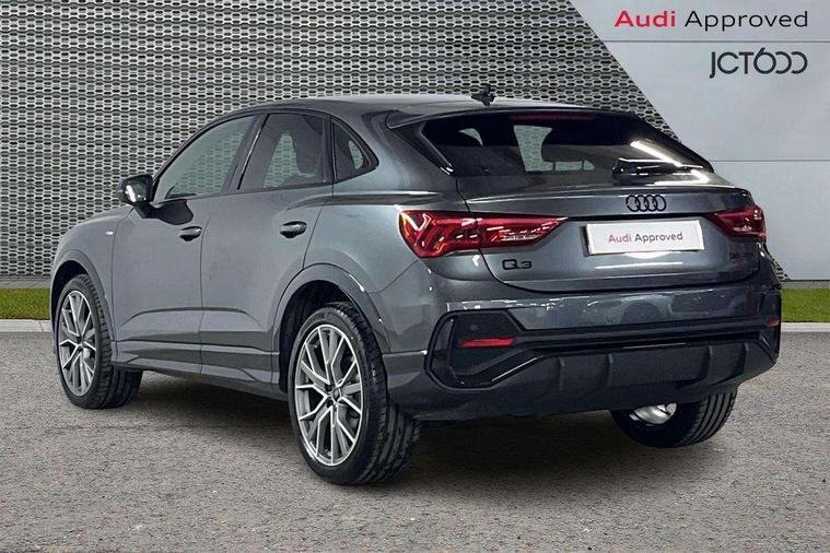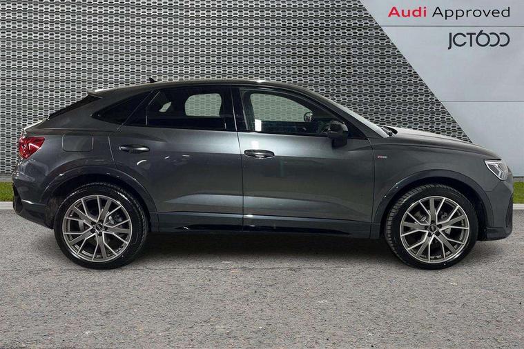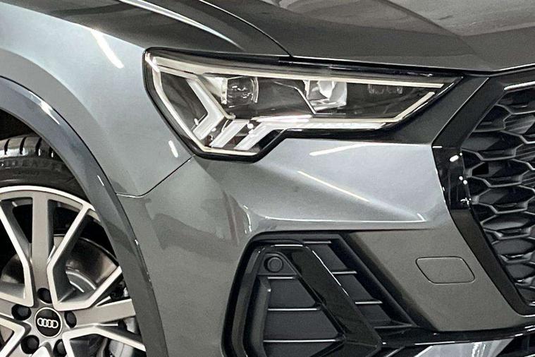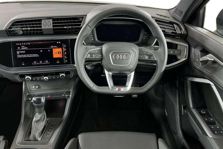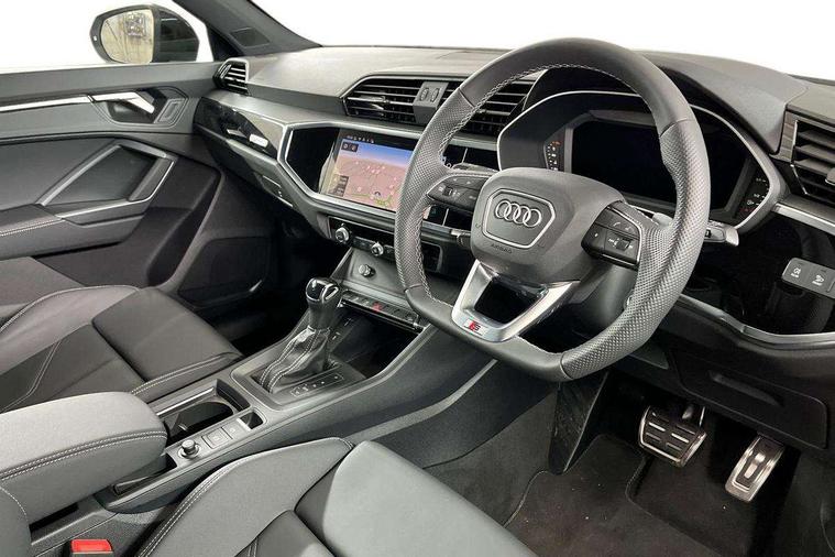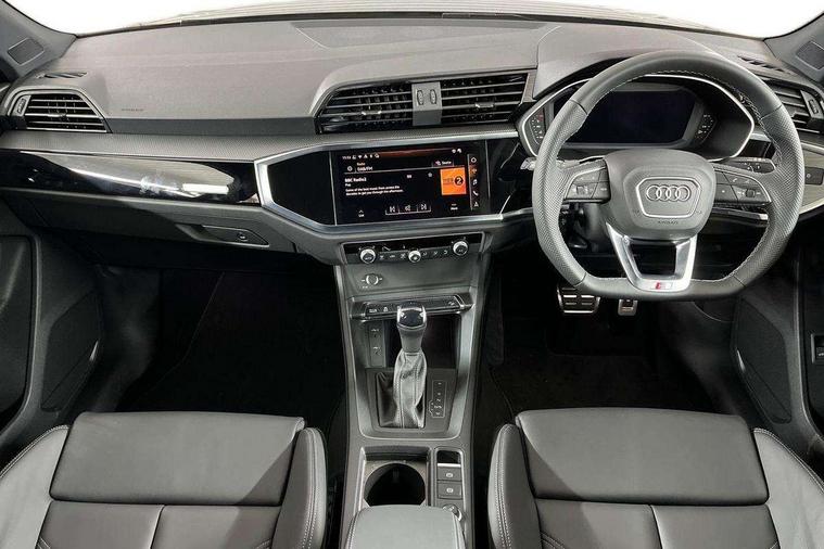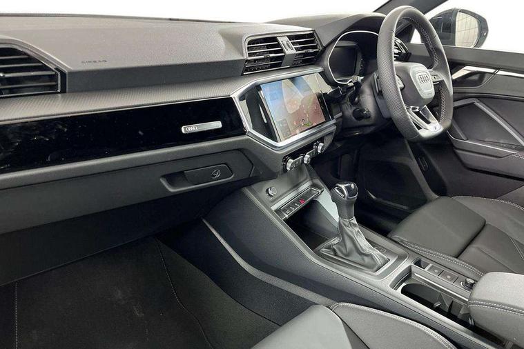 Audi connect safety and service, Audi drive select, Audi lane departure warning, Audi Virtual Cockpit - 10.25" display, Bluetooth interface, Camera based traffic sign recognition, Distraction and Fatigue warning, Legal emergency call, MMI Navigation Plus with high resolution 10.1 inch touchscreen colour display, Power operated tailgate, Progressive steering, Service interval indicator, Smartphone interface includes wireless Apple carplay/Android Auto, Start stop system with recuperation, Voice control system with natural language interaction, Sports suspension, 2 USB-C ports with charge and data functions, 6 passive loudspeakers, DAB digital radio module, Acoustic windscreen, Audi Beam uses LEDs to project the Audi logo onto the ground as you exit your Q3, Auto dimming door mirrors, Auto dimming frameless rear view mirror, Electrically folding, adjustable and heated door mirrors with integrated LED side indicators and kerb view function for passenger side, Front and rear electric windows, Front fog lights, Front underbody protection in manhattan grey paint finish, High gloss black finish B and C pillars, Honeycomb design radiator grille in matt anthracite black, LED Dynamic rear indicators, LED headlights with LED daytime running lights, LED rear lights, LED third brake light, Privacy glass dark tinted rear and rear-side windows (from B-pillar backwards), Rain and light sensors, Rear diffuser grille in grained matt black, Rear diffuser strip in matt anthracite black, Rear side wing doors, Rear underbody protection in matt black, Rear wiper, S line front and rear bumpers and side skirts in contrasting Manhattan grey paint finish, Variable front intermittent wipers, 12V socket in rear centre console, 3 seat bench in 2nd row, 40:20:40 folding with manual adjustment for 60:40 forwards/backwards position and backrest angle, Adjustable rear seat bench/backrest with centre armrest and cupholder, Black carpet mats, Black cloth headlining, Dual zone electronic climate control, Electric lumbar support, Front and rear black floor mats with contrast stitching in rock grey, Front and rear headrests, Front centre armrest, Height and reach adjustable steering wheel, Illuminated door sill trims with S logo, ISOFIX child seat mounting for front passenger with airbag deactivation and outer rear seat including top tether attachment point for outer rear seats, Luggage compartment sill protection in stainless steel, Manual front seats with height adjustment, Perforated leather gearknob, Single front passenger seat, Stainless steel pedals, Twin leather upholstery with front sport seats + S embossing, Black styling pack - Q3, Non smoking pack - Q3, 3x3 point rear seatbelts, 6 airbags - Driver, front passenger, curtain and side windows, Audi pre-sense front with pedestrain and cyclist recognition, Electrically operated child locks on rear doors, Electromechanical parking brake, Electronic stabilisation control including ABS, ASR and EDL, Front seatbelt reminder, Hill descent control, Hill hold assist, Pre sense basic, Seatbelt monitoring, Tyre pressure warning, Warning triangle and first aid kit, Anti theft wheel bolts, Immobiliser, Remote central locking, Thatcham approved category 1 anti theft alarm, Aluminium look interior elements, Detail dashboard around MMI touch colour display in glass look, black with surround in aluminium look, Leatherette door armrest, Piano black inlay,