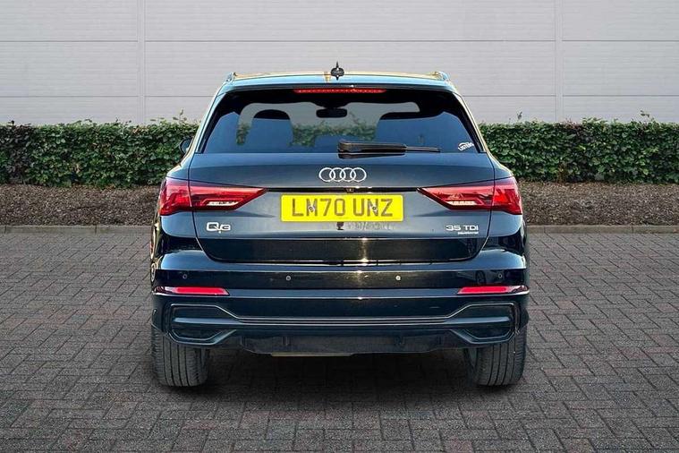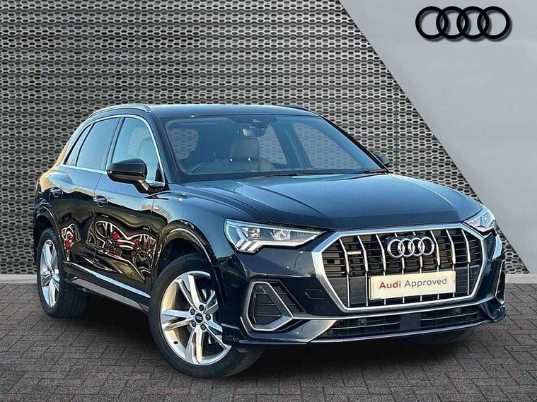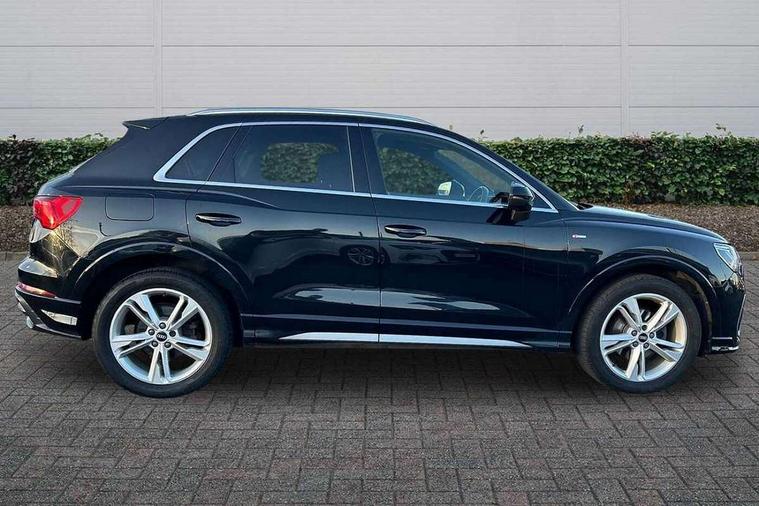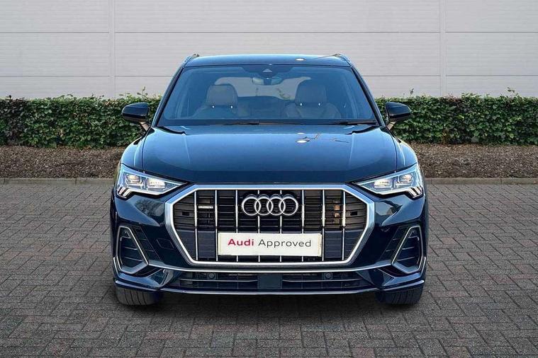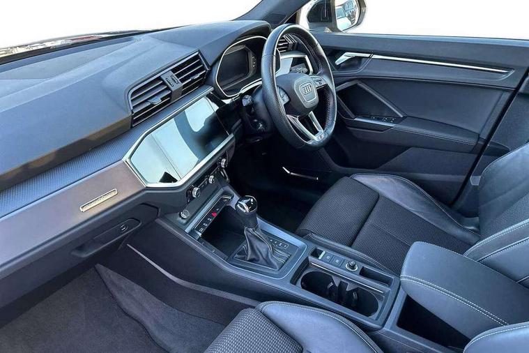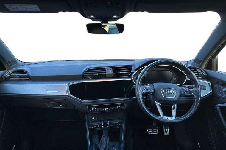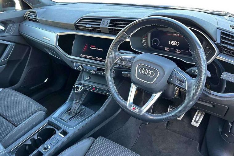 Audi connect safety and service (e-call), Audi drive select, Audi lane departure warning, Audi smartphone interface includes wireless Apple carplay/Android Auto, Audi Virtual Cockpit - 10.25" display, Bluetooth interface, Camera based traffic sign recognition, MMI Navigation Plus with high resolution 10.1 inch touchscreen colour display, Power operated tailgate, Progressive steering, Service interval indicator, Start stop system with recuperation, Voice control system with natural language interaction, Diesel particulate filter, Sports suspension, 2 USB-C ports with charge and data functions, 6 passive loudspeakers, DAB digital radio module, Acoustic windscreen, Aluminium roof rails, Aluminium window trim, Auto dimming frameless rear view mirror, Body coloured bumpers, Electrically folding, adjustable and heated door mirrors with integrated LED side indicators and kerb view function for passenger side, Front and rear electric windows, Front fog lights, Front side air inlets in matt platinum grey, Front spoiler blade in matt platinum grey, Grille vertical bars in aluminium silver/Matt, High gloss black finish B and C pillars, LED headlights with LED daytime running lights and dynamic rear indicator, LED rear lights, Privacy glass dark tinted rear and rear-side windows (from B-pillar backwards), Rain and light sensors, Rear diffuser strip in matt titanium black, S line badges on front wings, S Line front and rear bumpers, Side skirt insert in matt Platinium grey, Silver chrome grille surround, Titanium black radiator grille, 12V socket in rear centre console, 40:20:40 folding with manual adjustment for 60:40 forwards/backwards position and backrest angle, Adjustable rear seat bench/backrest with centre armrest and cupholder, Black cloth headlining, Dual zone electronic climate control, Front and rear black floor mats with contrast stitching in rock grey, Front and rear headrests, Front and rear roof module including reading lights, Front centre armrest, Glove compartment lighting, Height and reach adjustable steering wheel, Illuminated door sill trims with S logo, ISOFIX child seat mounting for front passenger with airbag deactivation and outer rear seat including top tether attachment point for outer rear seats, Luggage compartment light, Manual front seats with height adjustment, Perforated leather gearknob, Stainless steel luggage compartment sill finisher, Stainless steel pedals, Non smoking pack - Q3, 3x3 point rear seatbelts, 6 airbags - Driver, front passenger, curtain and side windows, Electrically operated child locks on rear doors, Electromechanical parking brake, Electronic stabilisation control including ABS, ASR and EDL, Hill descent control, Hill hold assist, Pre sense basic, Seatbelt monitoring, Tyre pressure warning, Warning triangle and first aid kit, Anti theft alarm, Anti theft wheel bolts, Audi pre-sense front with pedestrain and cyclist recognition, Remote central locking, Dark matt brushed aluminium inlay, Leatherette door armrest, MMI touch colour display in glass look, black with surround in aluminium look,