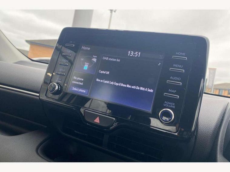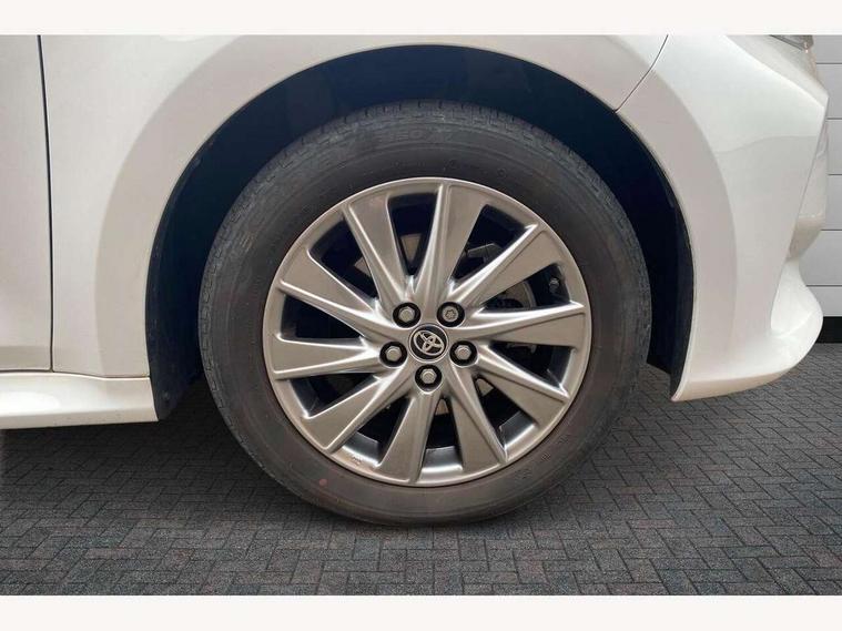 4.2" coloured TFT multi information display with analogue speedometer, Adaptive cruise control, Adjustable speed limit with speed warning, Bluetooth connectivity, E-call, Electric power steering, Hybrid energy display, Multi information display switches on steering wheel, Reversing camera, Smartphone integration with Apple CarPlay and Android auto, Tailgate, Voice recognition, Vehicle Stability Control (VSC), 4 speakers, 7" Multimedia display touch screen, Toyota Touch 2 with DAB, USB connection, Acoustic windscreen glass, Auto windscreen wipers, Automatic headlights, Body coloured door mirrors, Bulb indicators, Chequered front grille, Daytime running lights, Electric adjustable heated door mirrors, Follow me home headlights, Front auto power windows with anti jam protection, Halogen projector headlights, LED High mounted stop lamp, Manual headlight levelling, Rain sensor, Rear side wing doors, Rear spoiler, Rear wiper, Shark fin antenna, Turning signal integrated indicators in door mirrors, Variable front intermittent wipers, 3 adjustable rear headrests, 3 seat bench in 2nd row, 3 spoke leather steering wheel, 60/40 split folding rear seat, Active headrests, Adjustable boot height, Auto air conditioning, Coat hooks in rear grab handles, Cup holders (2 front & door), Data Communication Module (DCM) connected services, Fabric upholstery, Front armrest, Glovebox, Grey roof lining, Height adjustable driver's seat, Isofix seat fixing, Leather gearshift, Pollen filter, Shopping bag hooks, Single front passenger seat, Tilt/telescopic steering column, 3 point seatbelts on all rear seats, ABS+EBD+Brake assist, Electronic parking brake, Emergency brake light system (EBS), Front passenger airbag on/off switch, Front seatbelt reminder, Hill start assist control (HAC), Rear child proof door locks, Rear seat belt reminder, Supplemental Restraint System (SRS) 8 airbags: Driver & passenger's airbags, dual side curtain airbags, side impact airbags, front centre airbag, Toyota Safety Sense 2, Precollison + Night time Pedestrian & Cyclist Detection, Lane Trace Assist, Auto High Beam, Intelligent ACC & Road Sign Assist, Tyre pressure warning system, 2x Master key, Alarm/immobiliser, Remote powered central double locking doors, Soft touch instrument panel, Space saver spare wheel,