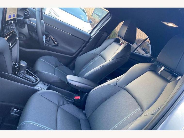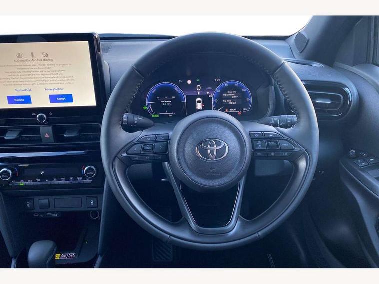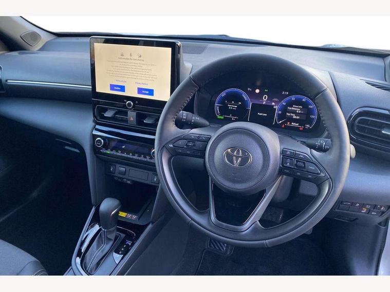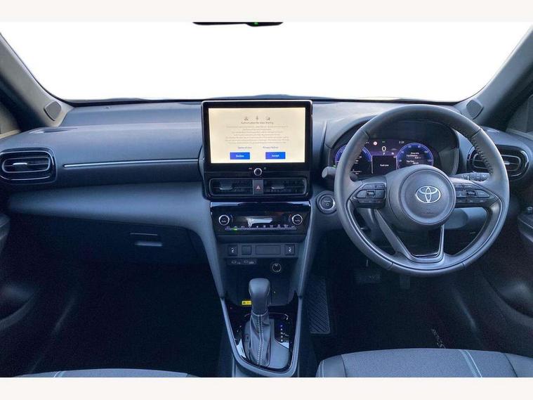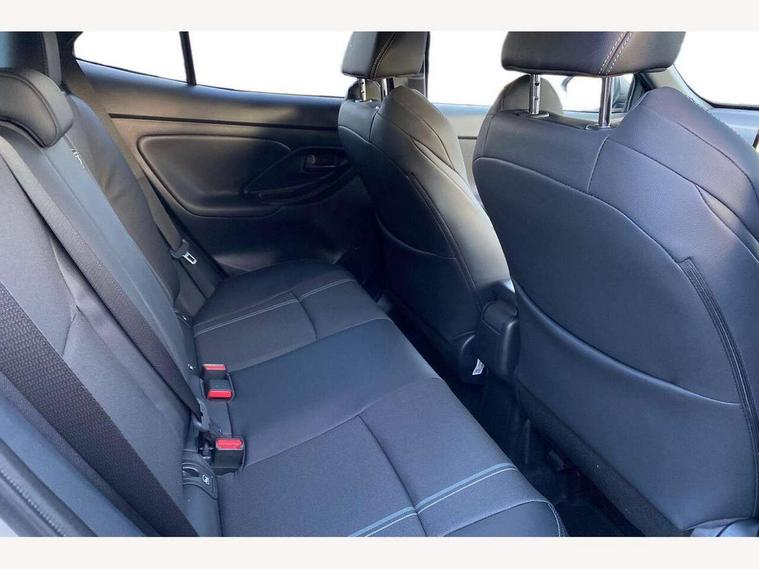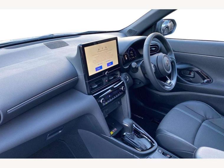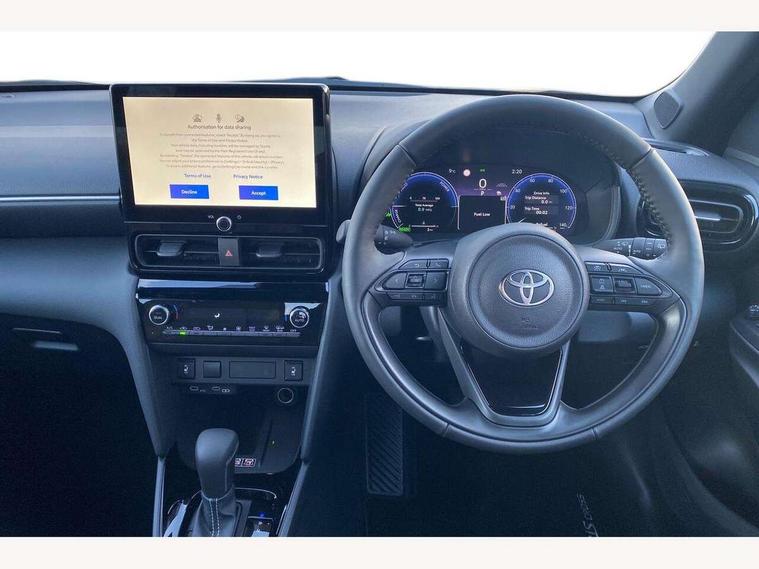10.5" Multimedia display screen, 10.5" Toyota smart connect+ with navi multimedia system with wireless Smartphone integration incl Apple CarPlay, 360 degree panoramic view monitor, 7" Multi information display screen, Adaptive cruise control, multi info switches on steering wheel, Adjustable speed limiter, Advanced parking assist, Blind spot monitoring, Bluetooth connectivity, Color multi-information display, Digital speedometer, Digital tachometer, Drive mode selector, Driver attention alert system, Dynamic guide lines on reversing camera, eCall emergency system, Electric power steering, Emergency driving stop system, Full range intelligent adaptive cruise control, Hybrid system indicator, Intelligent front and rear parking sensors with clearance sonar and automatic braking, Intersection turn assist, Key reminder warning, Lane change assist, Lane trace assist, My T Connected services, Power tailgate, Pre-collision system enhanced with emergency steering assist, Rear cross traffic alert, Remote boot door release in cabin, Road sign assist - RSA, Safe exit assist, Tailgate, Telephone switch on steering wheel, Wireless Mobile Phone Charger, Steering assisted vehicle stability control, 6 speakers, DAB Digital radio, Front USB Type-C connector, Front USB-C device charger, Acoustic windscreen glass, Anti-jam protection on power windows, Auto dimming rear view mirror, Auto high beam [AHB] with on/off switch, Auto intermittent windscreen wipers, Automatic headlights, Automatic headlights cut-off, Automatically retractable door mirrors, Black door moulding, Black lower front grille, Black protection moulding on side doors, Black roof rails, Black wheel arch mouldings, Body colour door handles, Body colour front bumper, Body colour rear bumper, Electric adjustable heated door mirrors, Follow me home headlights, Front and rear electric windows with auto up/down function, Gloss black upper front grille, Headlight cut off reminder, Indicators integrated on door mirrors, Intermittent rear wiper, Kick activated power back door, LED 3rd brake light, LED daytime running lights guide, LED front fog lights, LED front light guide, LED Indicators, LED projector headlights, LED rear lights with sequential indicators, Manual headlight levelling, Meshed shape upper front grille, Noise reduction layer on windscreen, Pre wiring for towing hook, Privacy glass, Rain sensor, Rear roof spoiler, Rear side wing doors, Rear window defogger, Shark fin antenna, 12v power outlet - front, 12V power point in boot, 2x Rear coat hooks, 3 seat bench in 2nd row, 3 spoke leather steering wheel, 40/60 split deckboard, 40:20:40 split folding rear bench seat, Adjustable rear headrests, Adjustable speed limiter switch on steering wheel, Boot light, Central armrest, Driver and front passenger personal lights, Driver and front passenger Whiplash injury Lesseing seats, Driver and passenger seatback pockets, Dual zone automatic air conditioning, Fabric door trim, Front console box, Front cup holders, Front door pockets, Front head restraints, Front sport seats, Front/rear assist grips, Gear shift indicator, Grey roof lining, Heated driver and passenger seats, Heated steering wheel, Height adjustable driver's seat, Height adjustable front passenger seat, Hooks for luggage holding belts, ISOFIX child restraint system, Lane departure alert switch on steering control, Leather gearshift, LED centre room light, Light on driver and passenger sun visor, Manual telescopic and tilting steering wheel, Mirror on driver and passenger sun visor, Nanoe-X air purifier, Partial synthetic leather upholstery, Pollen air filter, Power adjustable lumbar support on driver seat, Rear cup holders, Rear door pockets, Rear head restraints, Remote air-conditioning system, Single compartment glovebox, Single front passenger seat, Soft tonneau cover, Storage box under boot floor, Voice recognition switch on steering wheel, White ambient lighting in centre console, White ambient lighting in footwell, White ambient lighting on front doors, Yaris cross floor mats, 3x3 point rear seat belts, ABS+EBD+Brake assist, Downhill Assist Control (DAC), Driver and passenger central airbags, Driver and passenger front airbags, Driver and passenger side airbags, Electronic parking brake, Emergency brake light system (EBS), Front seat belt reminder, Hill start assist control (HAC), Passenger airbag on/off switch, Pre-collision system with pedestrian and cyclist detection, Rear door child safety locks, Rear passenger side airbags, Rear seat belt reminder, Traction control, Tyre pressure warning system, Immobiliser, Intrusion alarm, Keyless smart entry with push button start, Power door locks, Power passenger window lock, Remote door lock, Gloss black side air vent surrounds, Tyre repair kit,