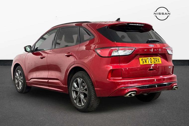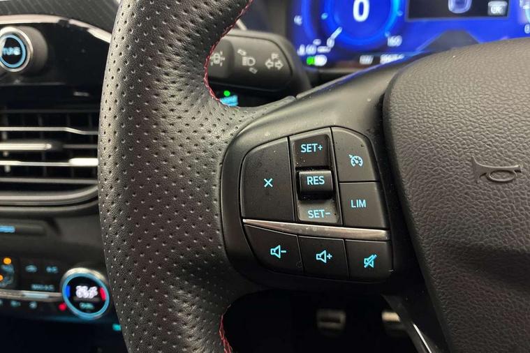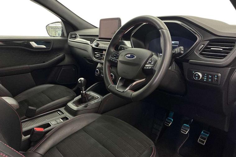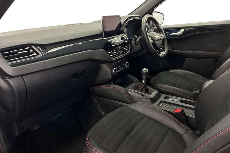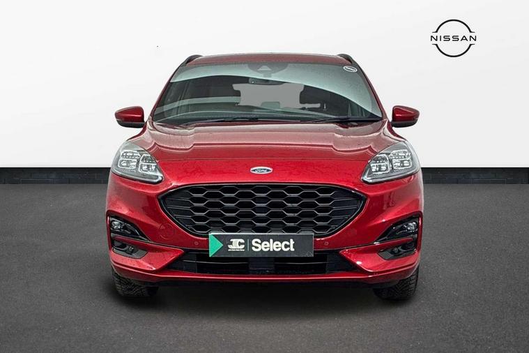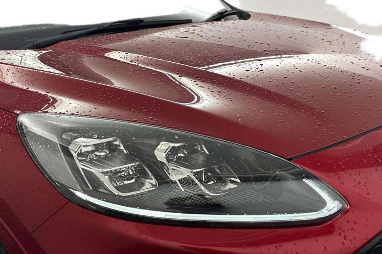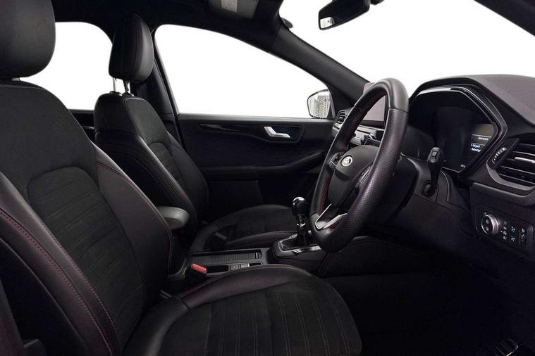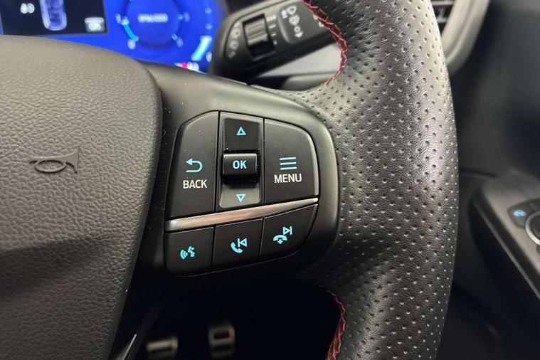 Driver impairment monitor, Ford easy fuel, Ford SYNC 3 with 8" colour touchscreen, App Link, andriod auto/apple carPlay and navigation with Ford pass connect, Front and rear parking sensors, Intelligent speed assist, Lane keeping aid with lane departure warning, Mobile phone wireless charging pad, Power assist steering, Selectable drive modes, Sports suspension, Auto dimming rear view mirror, Auto headlamps with high and low beam, Auto wipers, Black roof rails, Front LED fog lights with cornering function, Full LED headlamps, Large rear spoiler, LED daytime running lights, LED rear lights, Power folding heated door mirrors with puddle lights, Power front/rear windows with global close, Privacy glass, Quickclear heated windscreen, ST Line body styling kit with unique front and rear fascia and bumper, rear painted diffuser, front painted skid plates, dark mesh upper grille, ST Line front scuff plates, Twin exhausts, 2nd row sliding seats, 8 way manual passenger seat including lumbar support and height adjust, Alloy pedals, Ambient lighting, Centre console with electronic parking brake, Dark headlining and pillars, Dual electronic automatic temperature control, Flat bottomed leather steering wheel in sensico with red stitching, Front and rear head restraints, Rear charging point, Sensico partial premium leather upholstery, Sports seats, ST Line front and rear floor mats, Unique ST Line leather gear knob, B&O with large instrument cluster pack - Kuga, 3x3 point rear seatbelts, Airbags - front driver/passenger, front and rear curtain, Drivers knee airbag, Electronic stability control (ESC) and ABS, Ford MyKey Gen 2 safety system, Post collision braking, Powered child proof rear door locks, Pre collision assist with autonomous emergency braking, Red brake calipers, Tyre pressure monitoring system, Engine immobiliser, Keyless entry, Keyless start with 'Ford Power' starter button, Locking wheel nuts, Remote powered central double locking doors, Thatcham category 1 alarm, Tyre inflation kit,