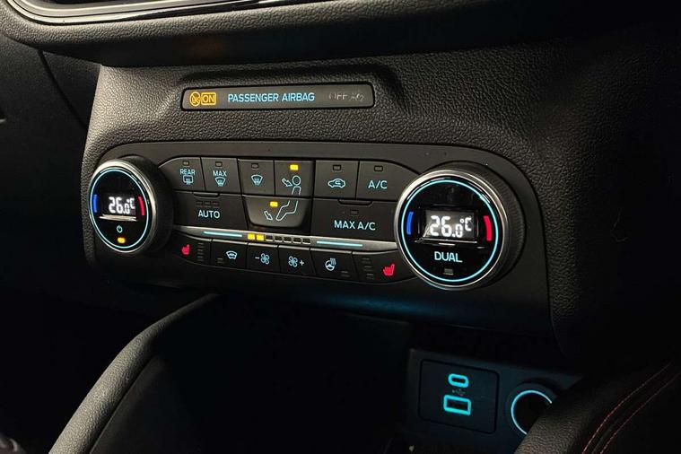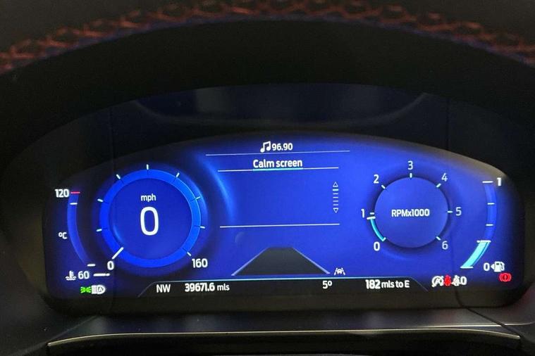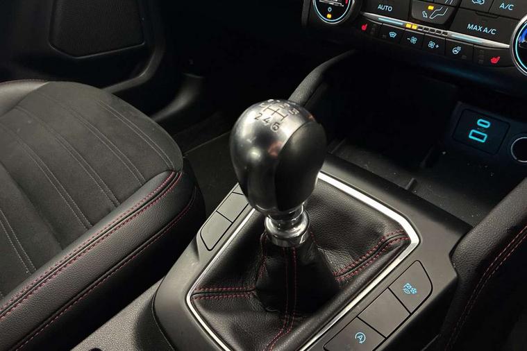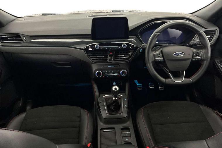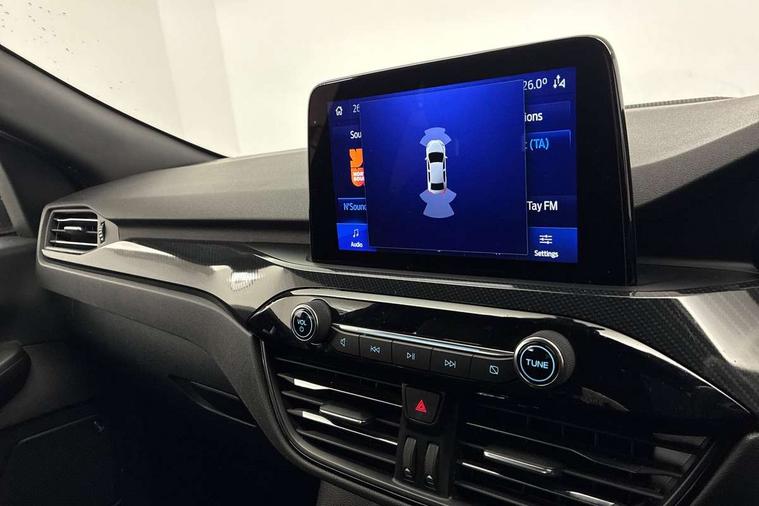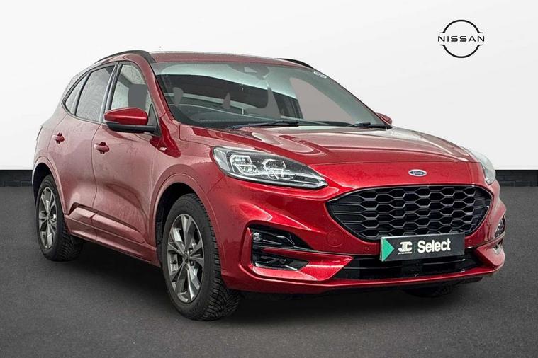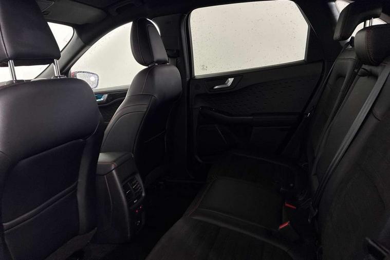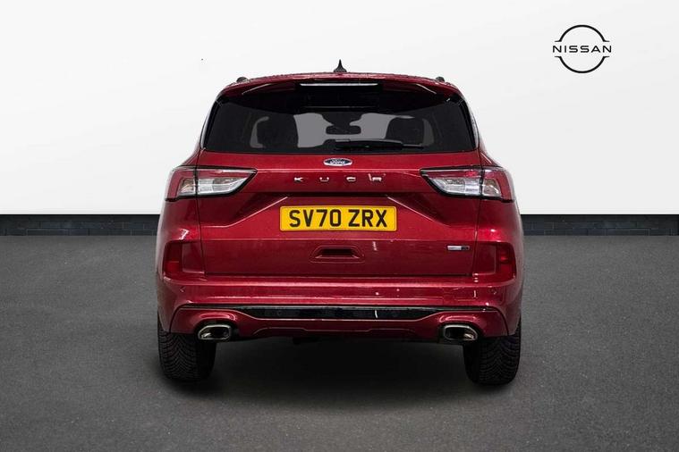 Driver impairment monitor, Ford easy fuel, Ford SYNC 3 with 8" colour touchscreen, App Link, andriod auto/apple carPlay and navigation with Ford pass connect, Front and rear parking sensors, Intelligent speed assist, Lane keeping aid with lane departure warning, Mobile phone wireless charging pad, Power assist steering, Selectable drive modes, Sports suspension, Auto dimming rear view mirror, Auto headlamps with high and low beam, Auto wipers, Black roof rails, Front LED fog lights with cornering function, Full LED headlamps, Large rear spoiler, LED daytime running lights, LED rear lights, Power folding heated door mirrors with puddle lights, Power front/rear windows with global close, Privacy glass, Quickclear heated windscreen, ST Line body styling kit with unique front and rear fascia and bumper, rear painted diffuser, front painted skid plates, dark mesh upper grille, ST Line front scuff plates, Twin exhausts, 2nd row sliding seats, 8 way manual passenger seat including lumbar support and height adjust, Alloy pedals, Ambient lighting, Centre console with electronic parking brake, Dark headlining and pillars, Dual electronic automatic temperature control, Flat bottomed leather steering wheel in sensico with red stitching, Front and rear head restraints, Rear charging point, Sensico partial premium leather upholstery, Sports seats, ST Line front and rear floor mats, Unique ST Line leather gear knob, B&O with large instrument cluster pack - Kuga, 3x3 point rear seatbelts, Airbags - front driver/passenger, front and rear curtain, Drivers knee airbag, Electronic stability control (ESC) and ABS, Ford MyKey Gen 2 safety system, Post collision braking, Powered child proof rear door locks, Pre collision assist with autonomous emergency braking, Red brake calipers, Tyre pressure monitoring system, Engine immobiliser, Keyless entry, Keyless start with 'Ford Power' starter button, Locking wheel nuts, Remote powered central double locking doors, Thatcham category 1 alarm, Tyre inflation kit,
