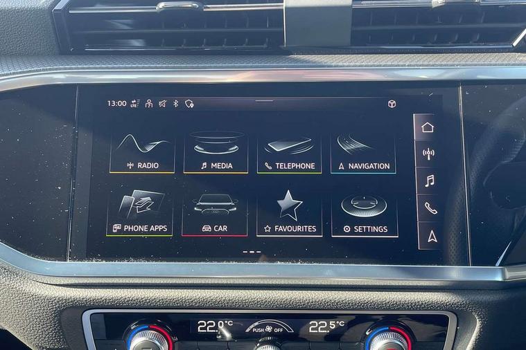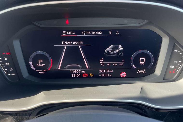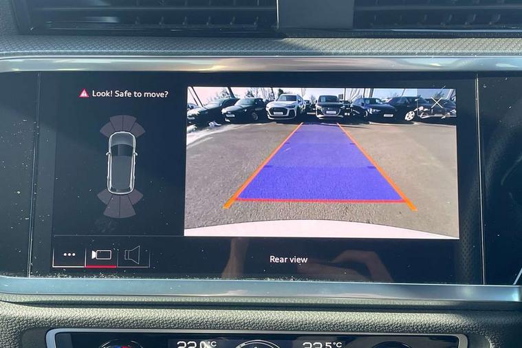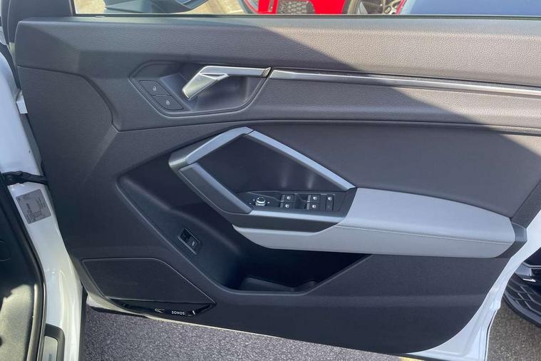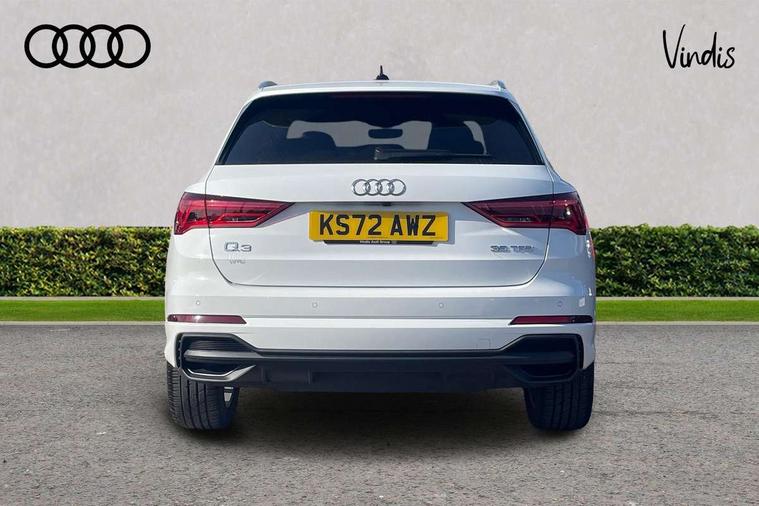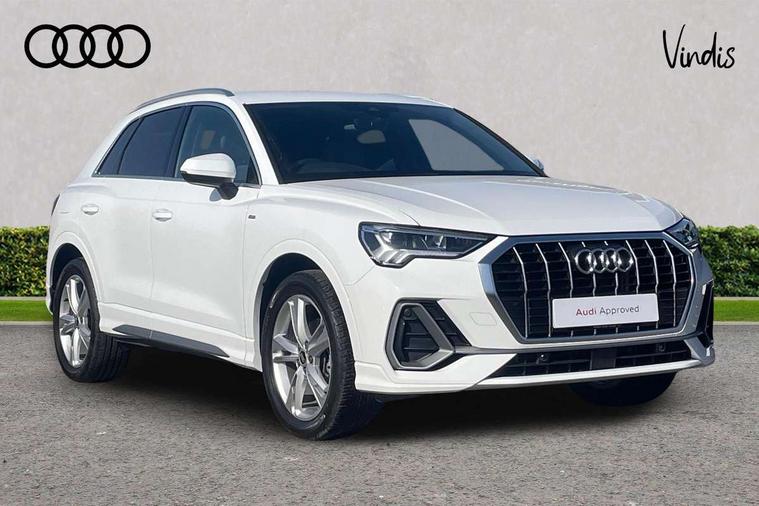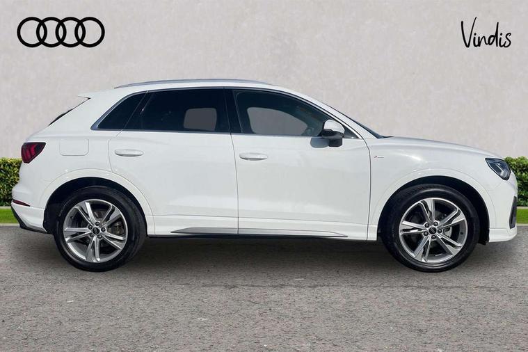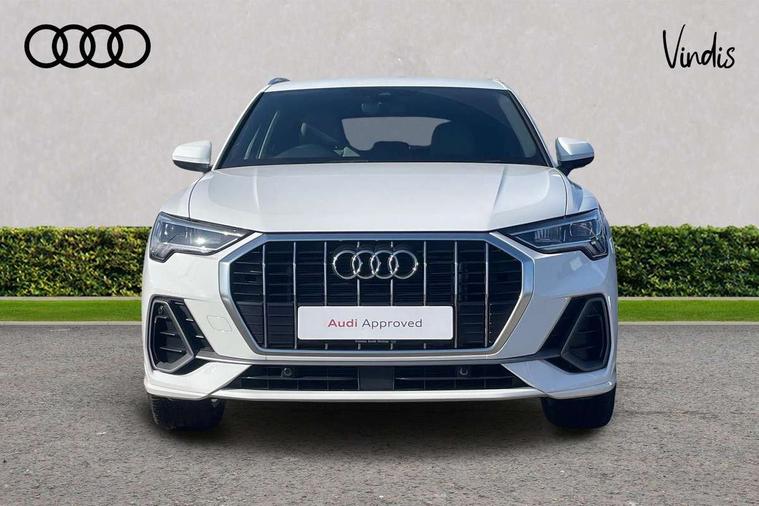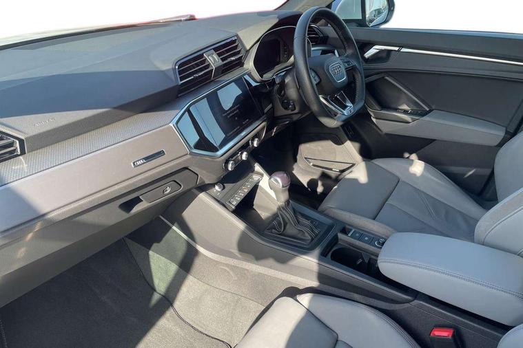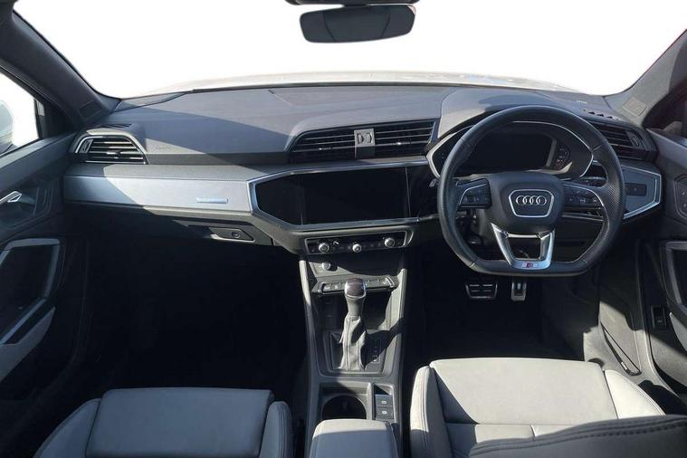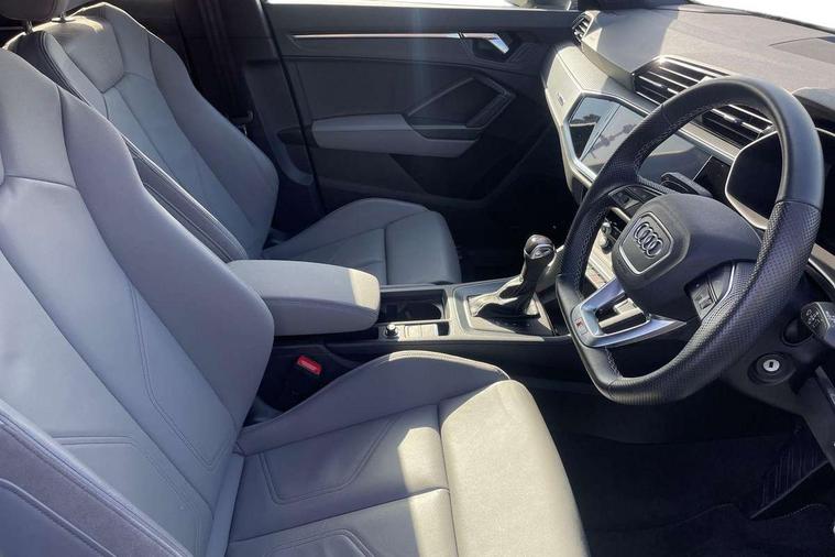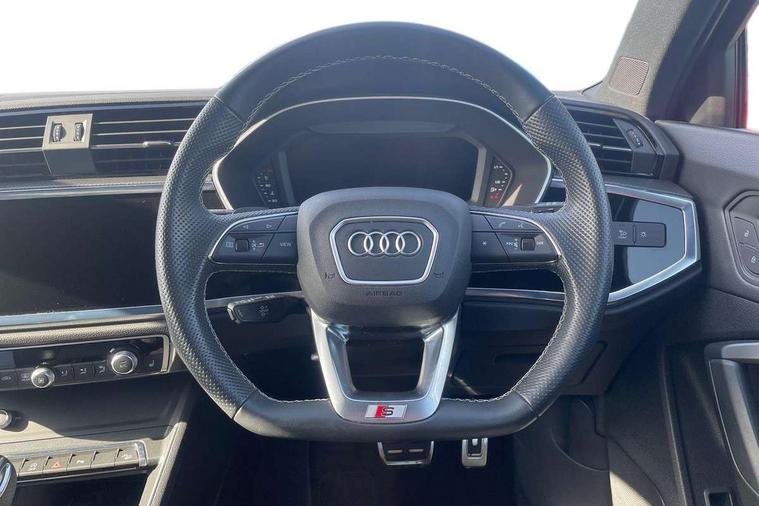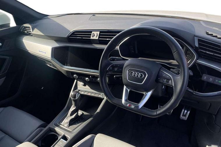 Amazon alexa Integration, Audi drive select, Audi lane departure warning, Audi Virtual Cockpit - 10.25" display, Bluetooth interface, Camera based traffic sign recognition, Legal emergency call, MMI Navigation Plus with high resolution 10.1 inch touchscreen colour display, Power operated tailgate, Progressive steering, Service interval indicator, Smartphone interface includes wireless Apple carplay/Android Auto, Start stop system with recuperation, Voice control system with natural language interaction, Sports suspension, 2 USB-C ports with charge and data functions, 6 passive loudspeakers, DAB digital radio module, Acoustic windscreen, Aluminium roof rails, Aluminium window trim, Auto dimming frameless rear view mirror, Body colour front spoiler blade, Body coloured bumpers, Electrically folding, adjustable and heated door mirrors with integrated LED side indicators and kerb view function for passenger side, Front and rear electric windows, Front fog lights, Front side air inlets in matt platinum grey, Grille vertical bars in aluminium silver/Matt, High gloss black finish B and C pillars, LED Dynamic rear indicators, LED headlights with LED daytime running lights, LED rear lights, LED third brake light, Privacy glass dark tinted rear and rear-side windows (from B-pillar backwards), Rain and light sensors, Rear diffuser grille in grained matt black, Rear diffuser strip in matt titanium black, Rear side wing doors, Rear wiper, S line badges on front wings, S Line front and rear bumpers, Side skirt insert in matt Platinium grey, Titanium black radiator grille, Variable front intermittent wipers, 12V socket in rear centre console, 3 seat bench in 2nd row, 40:20:40 folding with manual adjustment for 60:40 forwards/backwards position and backrest angle, Adjustable rear seat bench/backrest with centre armrest and cupholder, Black cloth headlining, Dual zone electronic climate control, Front and rear black floor mats with contrast stitching in rock grey, Front and rear headrests, Front and rear roof module including reading lights, Front centre armrest, Glove compartment lighting, Height and reach adjustable steering wheel, Illuminated door sill trims with S logo, ISOFIX child seat mounting for front passenger with airbag deactivation and outer rear seat including top tether attachment point for outer rear seats, Luggage compartment light, Manual front seats with height adjustment, Perforated leather gearknob, Single front passenger seat, Stainless steel luggage compartment sill finisher, Stainless steel pedals, Ambient lighting pack - Q3, Non smoking pack - Q3, 3x3 point rear seatbelts, 6 airbags - Driver, front passenger, curtain and side windows, Audi pre-sense front with pedestrain and cyclist recognition, Electrically operated child locks on rear doors, Electromechanical parking brake, Electronic stabilisation control including ABS, ASR and EDL, Front seatbelt reminder, Hill descent control, Hill hold assist, Pre sense basic, Seatbelt monitoring, Tyre pressure warning, Warning triangle and first aid kit, Anti theft alarm, Anti theft wheel bolts, Immobiliser, Remote central locking, Dark matt brushed aluminium inlay, Detail dashboard around MMI touch colour display in glass look, black with surround in aluminium look, Leatherette door armrest,