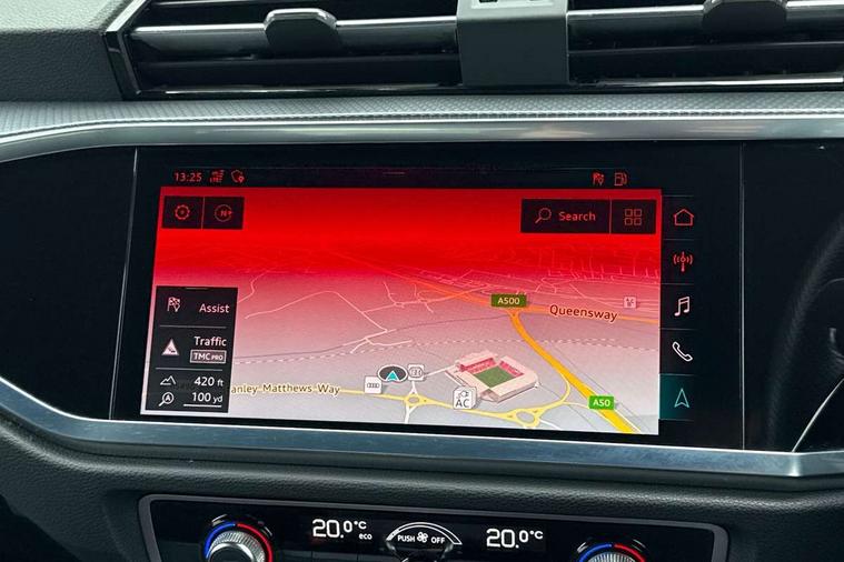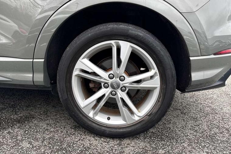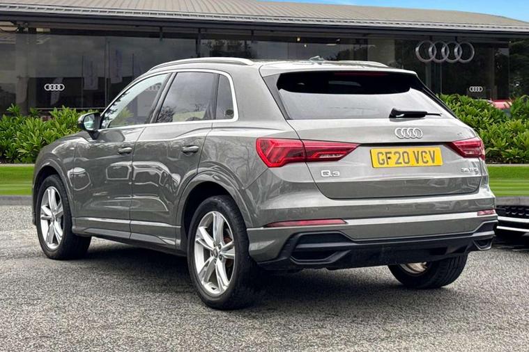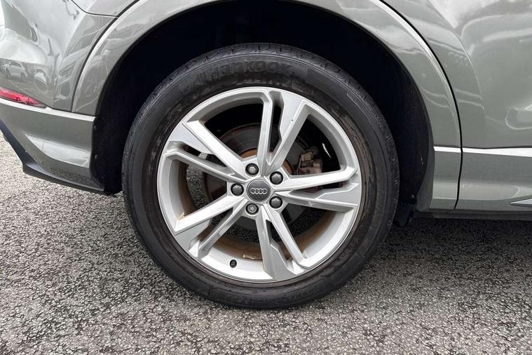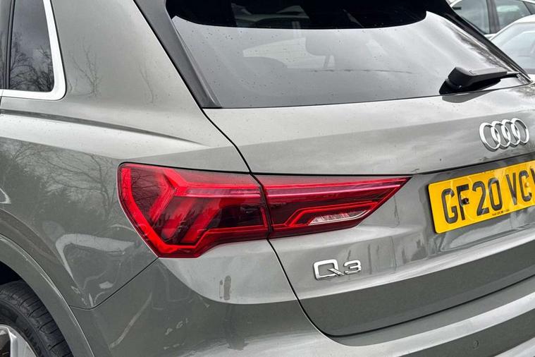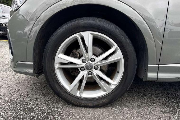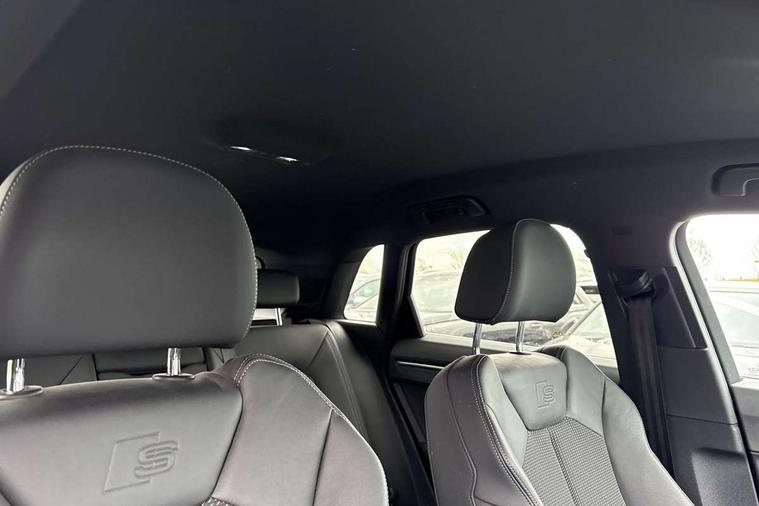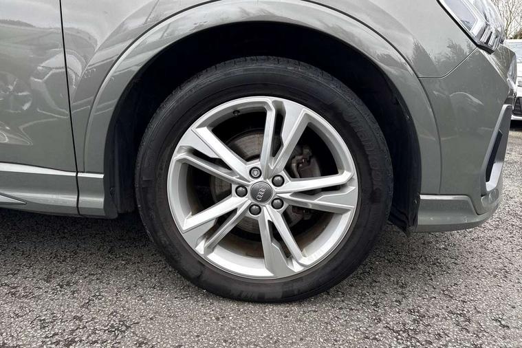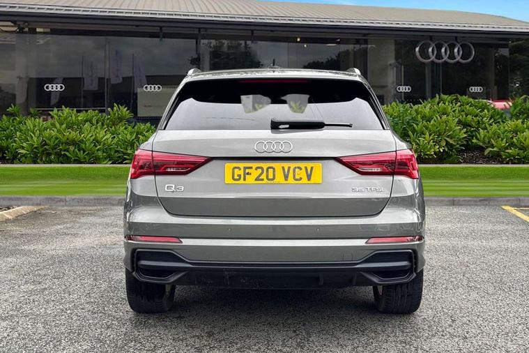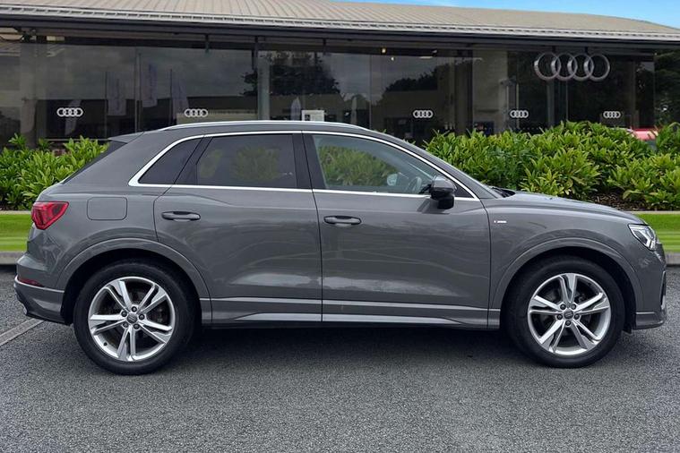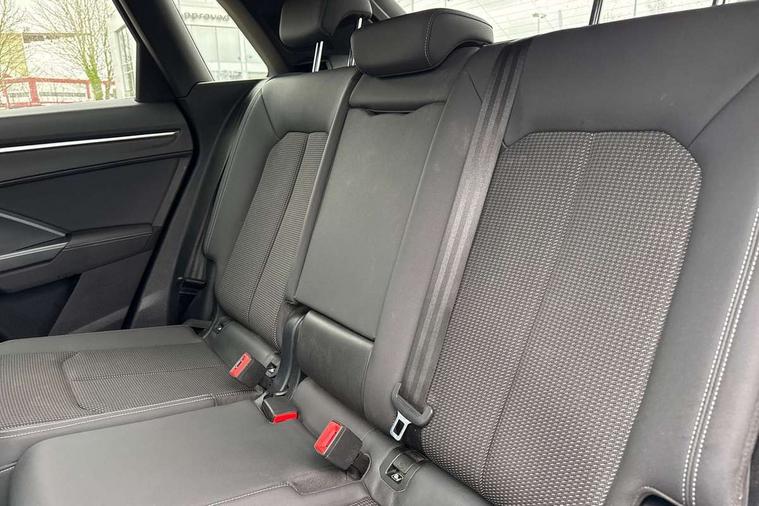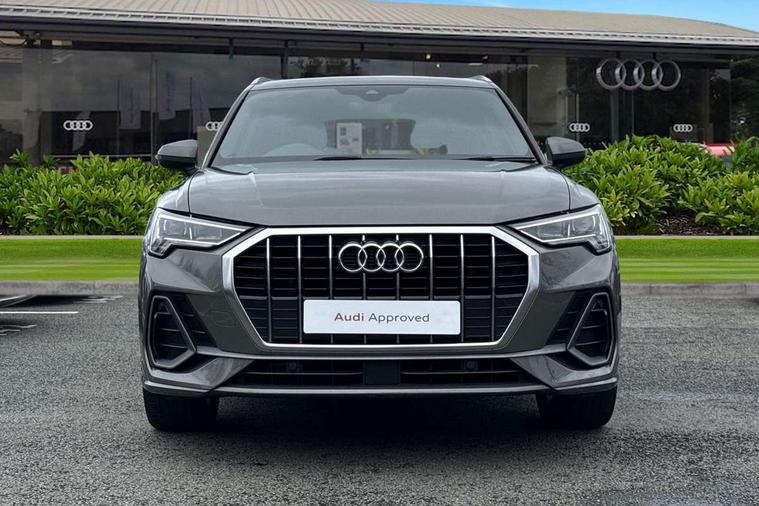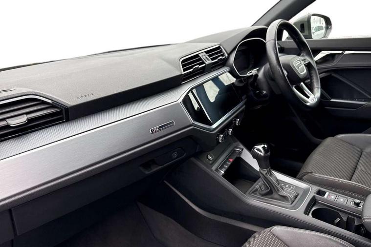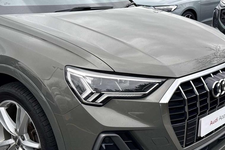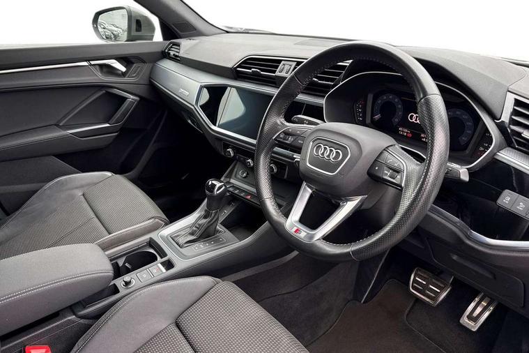 Audi connect safety and service (e-call), Audi drive select, Audi lane departure warning, Audi side assist, Audi Virtual Cockpit - 10.25" display, Bluetooth interface, Camera based traffic sign recognition, MMI Navigation Plus with high resolution 10.1 inch touchscreen colour display, Power operated tailgate, Progressive steering, Service interval indicator, Smartphone interface includes wireless Apple carplay/Android Auto, Start stop system with recuperation, Voice control system with natural language interaction, 48V Mild hybrid technology, Sports suspension, 1 x USB type C and 1 USB type A charging points, 6 passive loudspeakers, DAB digital radio module, Acoustic windscreen, Aluminium roof rails, Aluminium window trim, Auto dimming frameless rear view mirror, Body coloured bumpers, Electrically folding, adjustable and heated door mirrors with integrated LED side indicators and kerb view function for passenger side, Front and rear electric windows, Front fog lights, Front side air inlets in matt platinum grey, Front spoiler blade in matt platinum grey, Grille vertical bars in aluminium silver/Matt, High gloss black finish B and C pillars, LED headlights with LED daytime running lights and dynamic rear indicator, LED rear lights, Privacy glass dark tinted rear and rear-side windows (from B-pillar backwards), Rain and light sensors, Rear diffuser strip in matt titanium black, S line badges on front wings, S Line front and rear bumpers, Side skirt insert in matt Platinium grey, Silver chrome grille surround, Titanium black radiator grille, 12V socket in rear centre console, 40:20:40 folding with manual adjustment for 60:40 forwards/backwards position and backrest angle, Adjustable rear seat bench/backrest with centre armrest and cupholder, Black cloth headlining, Dual zone electronic climate control, Front and rear black floor mats with contrast stitching in rock grey, Front and rear headrests, Front and rear roof module including reading lights, Front centre armrest, Glove compartment lighting, Height and reach adjustable steering wheel, Illuminated door sill trims with S logo, ISOFIX child seat mounting for front passenger with airbag deactivation and outer rear seat including top tether attachment point for outer rear seats, Luggage compartment light, Manual front seats with height adjustment, Perforated leather gearknob, Stainless steel luggage compartment sill finisher, Stainless steel pedals, Non smoking pack - Q3, 3x3 point rear seatbelts, 6 airbags - Driver, front passenger, curtain and side windows, Audi pre-sense front with pedestrain and cyclist recognition, Electrically operated child locks on rear doors, Electromechanical parking brake, Electronic stabilisation control including ABS, ASR and EDL, Hill descent control, Hill hold assist, Pre sense basic, Seatbelt monitoring, Tyre pressure warning, Warning triangle and first aid kit, Anti theft alarm, Anti theft wheel bolts, Remote central locking, Dark matt brushed aluminium inlay, Detail dashboard around MMI touch colour display in glass look, black with surround in aluminium look, Leatherette door armrest, Tool kit, Tyre repair kit,