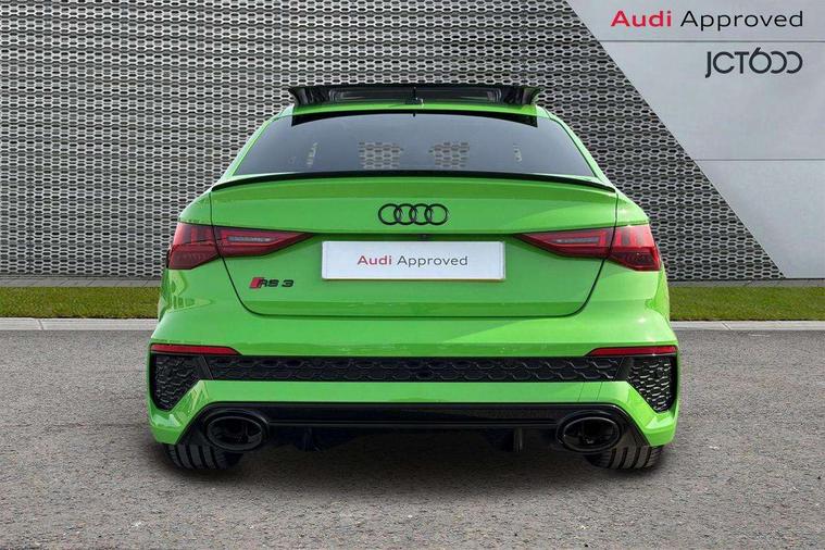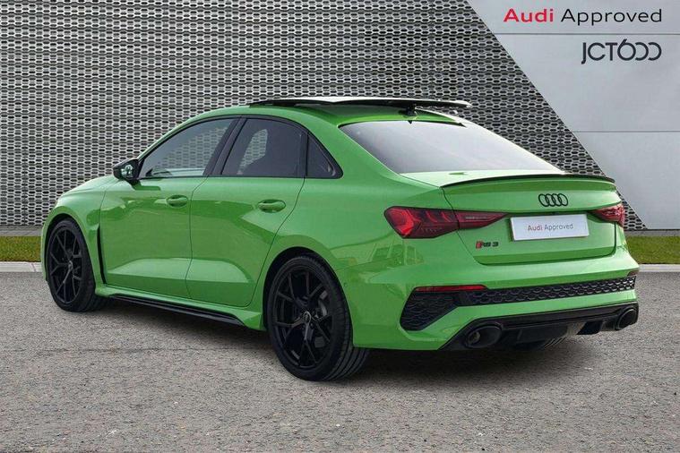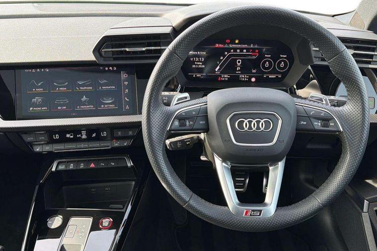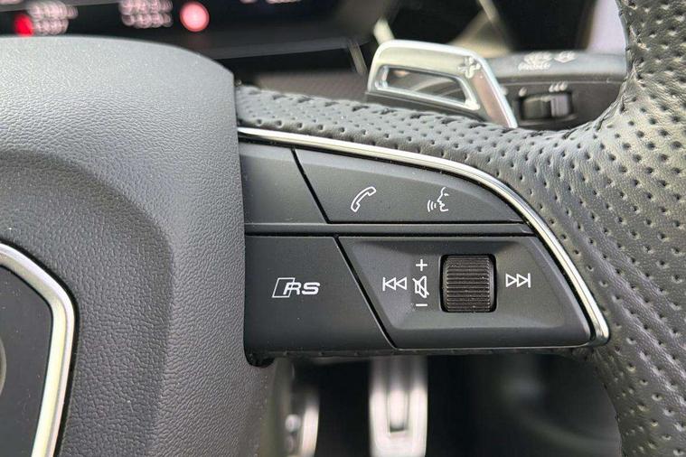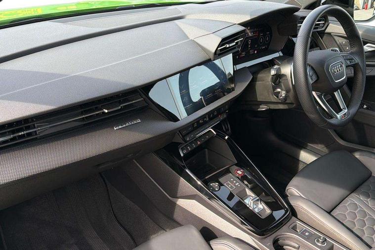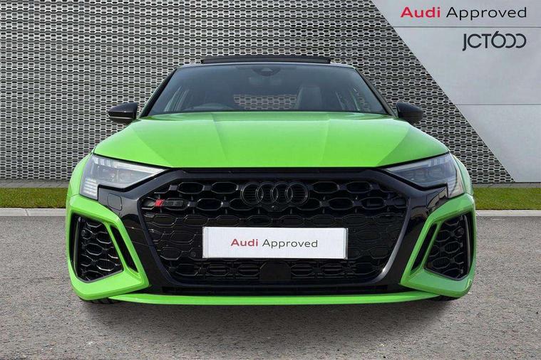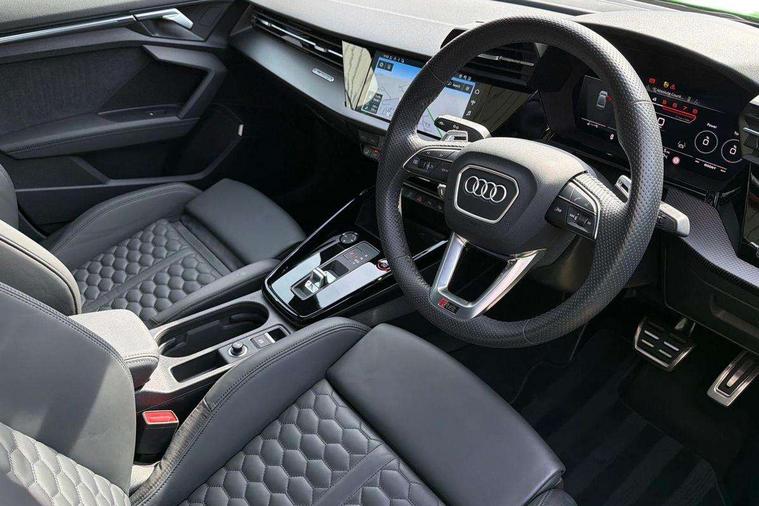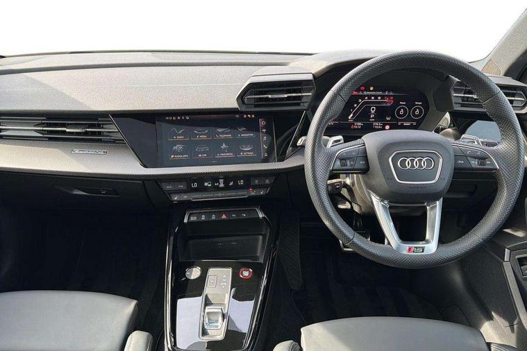 Audi smartphone interface, Audi virtual cockpit with RS specific display 12.3" full colour digital instrument cluster, Automatic start/stop system with recuperation, Bluetooth interface, Collision avoidance assistant, Emergency e-call, Head up Display, Lane departure warning system, Legal emergency call, Parking assist with parking system plus, Power operated tailgate - Luggage compartment lid opens electrically, Progressive power assisted steering, Reversing camera, Quattro permanent four wheel drive, Rear suspension, DAB Digital radio, 3rd brake light, Acoustic glass windscreen, Audi beam uses LEDs to project the Audi sport logo onto the ground as you exit your RS 3, Audi matrix LED headlights, LED rear lights, dynamic front and rear indicators and headlight cleaning system, Auto dimming rear view mirror, Black side skirts, Body colour roof, Carbon fibre engine cover, Electric adj heated/folding + auto dimming exterior mirrors with memory + LED indicator + auto kerb side function for passenger side exterior mirror, Front spoiler in high gloss black, Heat insulating glass windscreen, LED daytime running lights, Light and rain sensors, Panoramic glass sunroof, Privacy glass - dark tinted rear and rear side windows from B-pillar backwards, Rear boot, Rear side wing doors, RS exterior features in gloss black, RS sports exhaust system, 3 seat bench in 2nd row, 3 spoke leather multifunction steering wheel with gear shift paddles, 4 way lumbar support for front seats, 40/20/40 split folding rear seat bench, Black cloth headlining, Dual zone electronic climate control, Electrically adjustable front seats with memory function for driver's side, Front and rear headrests, Front centre armrest, Front sports seats RS embossed logo, Front/rear floor mats, Heated front seats, Honeycomb stitching and RS embossing, Illuminated door sill trims inlays in aluminium with RS 3 logo, RS emblems, Single front passenger seat, Stainless steel pedals and front footrest in black, Aluminium interior elements pack - RS3, Ambient lighting pack - RS3, Comfort and sound pack - RS3, Driver assistance pack with 3 spoke leather multi function steering wheel - RS3, MMI navigation plus with MMI touch - RS3, RS bodystyling - RS3, Storage Pack - RS3, 3x3 point rear seat belts, ABS/EBD, ASR, Audi pre sense front, Driver/Front Passenger airbags, EDL, ESC - Electronic Stability Control + traction control, Front passenger airbag deactivation, Front side airbags with head airbags and interaction airbag, Hill hold assist, Seat belt reminder with passenger presence detection in rear, Tyre pressure loss indicator, Warning triangle and first aid kit, Anti theft alarm, Anti-theft wheel bolts, Electronically operated child lock, Remote control central locking, Full decorative carbon trim, 19" 5 Y spoke black with graphic print alloy wheels, Tool kit, Tyre repair kit,