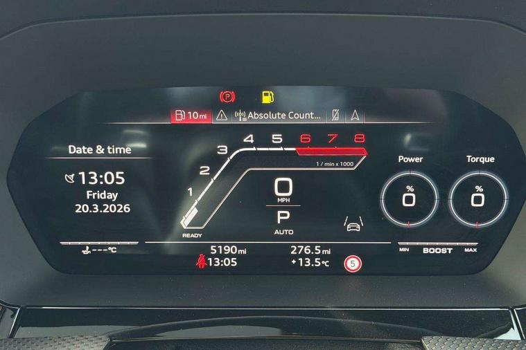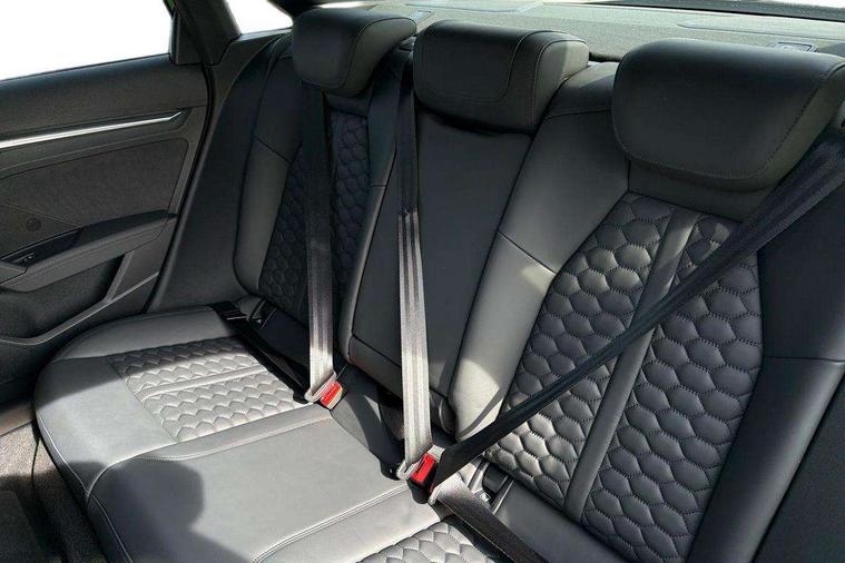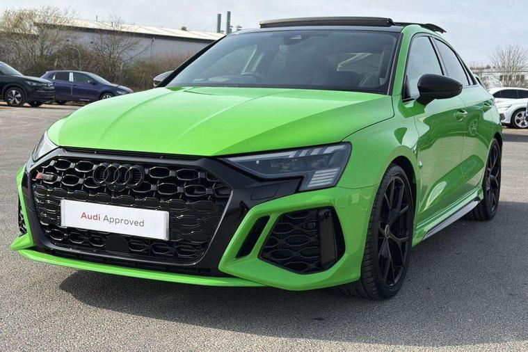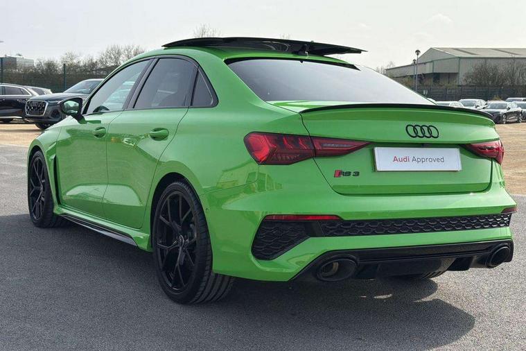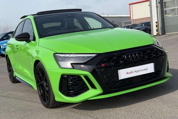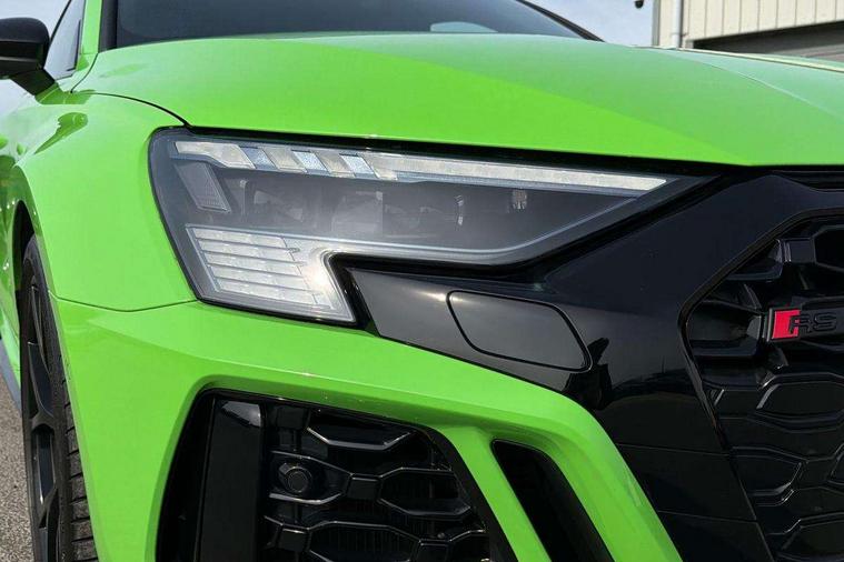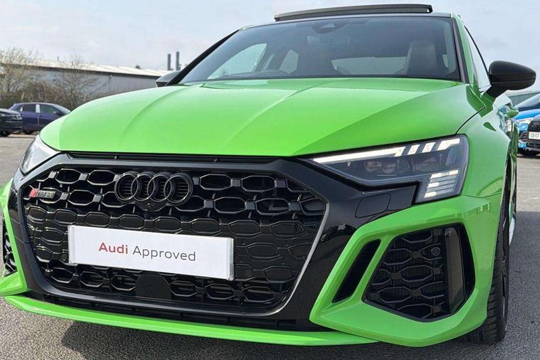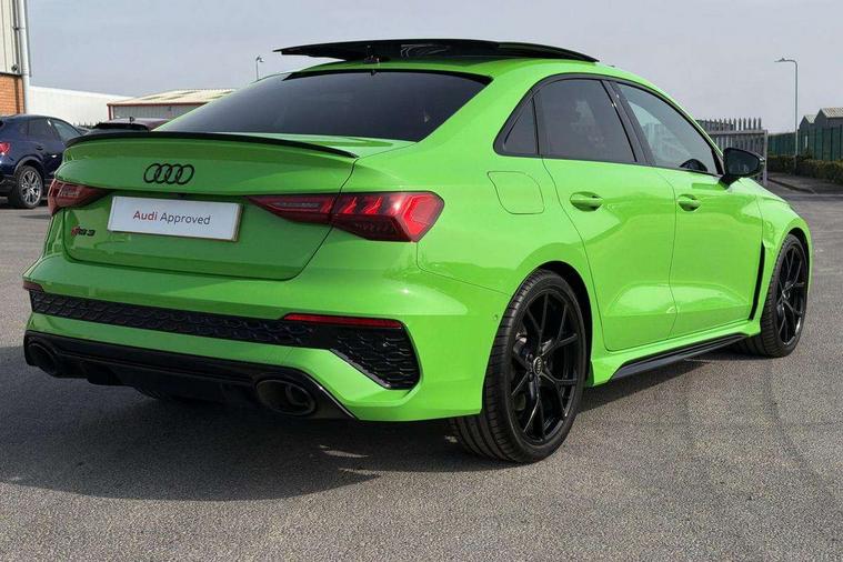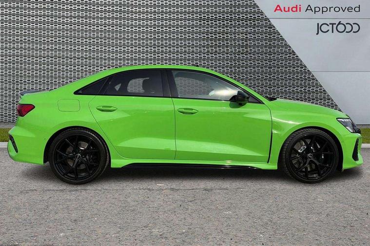 Audi smartphone interface, Audi virtual cockpit with RS specific display 12.3" full colour digital instrument cluster, Automatic start/stop system with recuperation, Bluetooth interface, Collision avoidance assistant, Emergency e-call, Head up Display, Lane departure warning system, Legal emergency call, Parking assist with parking system plus, Power operated tailgate - Luggage compartment lid opens electrically, Progressive power assisted steering, Reversing camera, Quattro permanent four wheel drive, Rear suspension, DAB Digital radio, 3rd brake light, Acoustic glass windscreen, Audi beam uses LEDs to project the Audi sport logo onto the ground as you exit your RS 3, Audi matrix LED headlights, LED rear lights, dynamic front and rear indicators and headlight cleaning system, Auto dimming rear view mirror, Black side skirts, Body colour roof, Carbon fibre engine cover, Electric adj heated/folding + auto dimming exterior mirrors with memory + LED indicator + auto kerb side function for passenger side exterior mirror, Front spoiler in high gloss black, Heat insulating glass windscreen, LED daytime running lights, Light and rain sensors, Panoramic glass sunroof, Privacy glass - dark tinted rear and rear side windows from B-pillar backwards, Rear boot, Rear side wing doors, RS exterior features in gloss black, RS sports exhaust system, 3 seat bench in 2nd row, 3 spoke leather multifunction steering wheel with gear shift paddles, 4 way lumbar support for front seats, 40/20/40 split folding rear seat bench, Black cloth headlining, Dual zone electronic climate control, Electrically adjustable front seats with memory function for driver's side, Front and rear headrests, Front centre armrest, Front sports seats RS embossed logo, Front/rear floor mats, Heated front seats, Honeycomb stitching and RS embossing, Illuminated door sill trims inlays in aluminium with RS 3 logo, RS emblems, Single front passenger seat, Stainless steel pedals and front footrest in black, Aluminium interior elements pack - RS3, Ambient lighting pack - RS3, Comfort and sound pack - RS3, Driver assistance pack with 3 spoke leather multi function steering wheel - RS3, MMI navigation plus with MMI touch - RS3, RS bodystyling - RS3, Storage Pack - RS3, 3x3 point rear seat belts, ABS/EBD, ASR, Audi pre sense front, Driver/Front Passenger airbags, EDL, ESC - Electronic Stability Control + traction control, Front passenger airbag deactivation, Front side airbags with head airbags and interaction airbag, Hill hold assist, Seat belt reminder with passenger presence detection in rear, Tyre pressure loss indicator, Warning triangle and first aid kit, Anti theft alarm, Anti-theft wheel bolts, Electronically operated child lock, Remote control central locking, Full decorative carbon trim, 19" 5 Y spoke black with graphic print alloy wheels, Tool kit, Tyre repair kit,