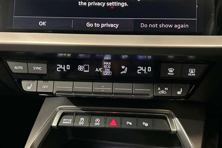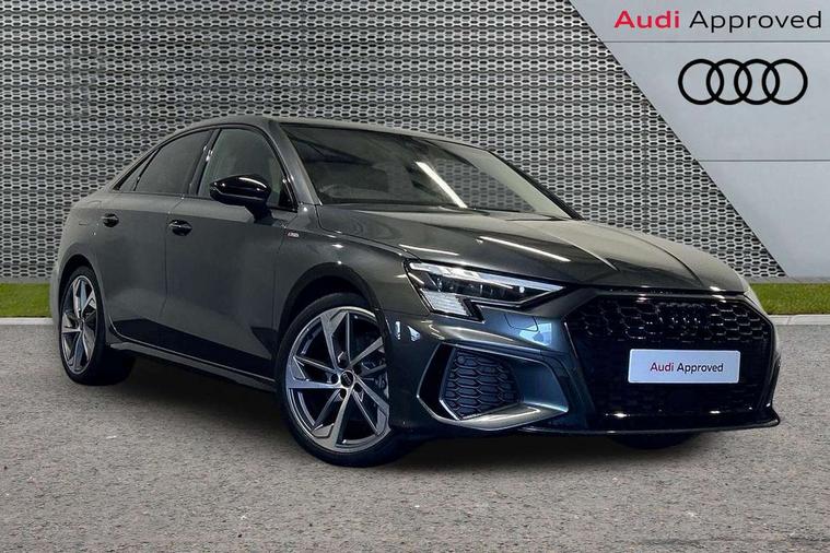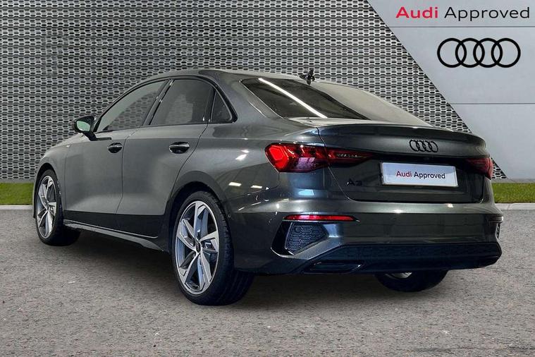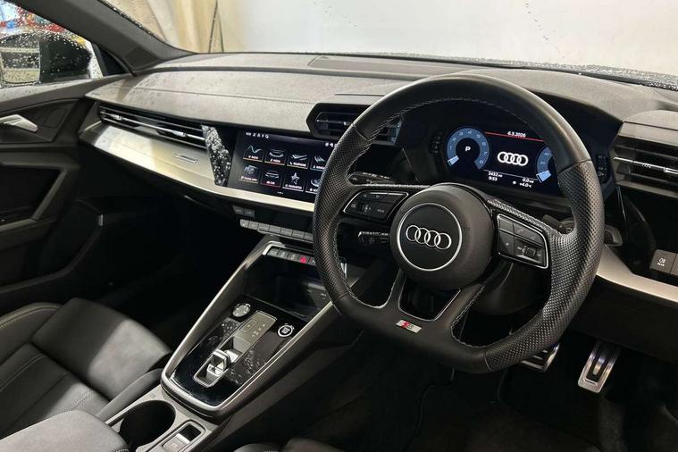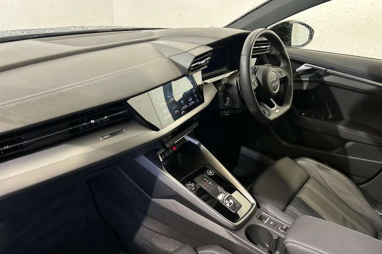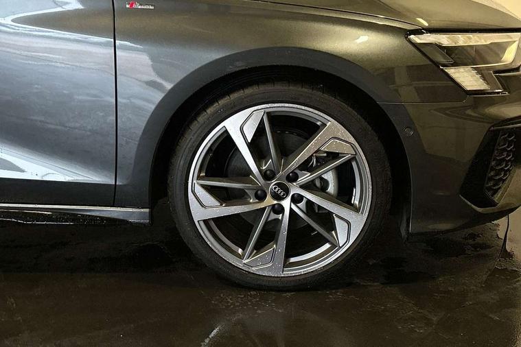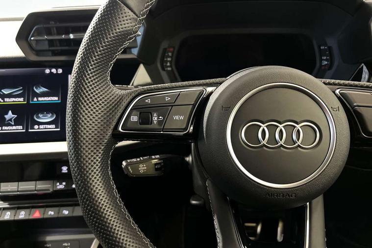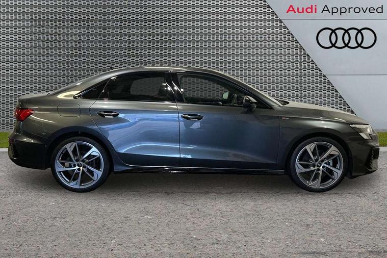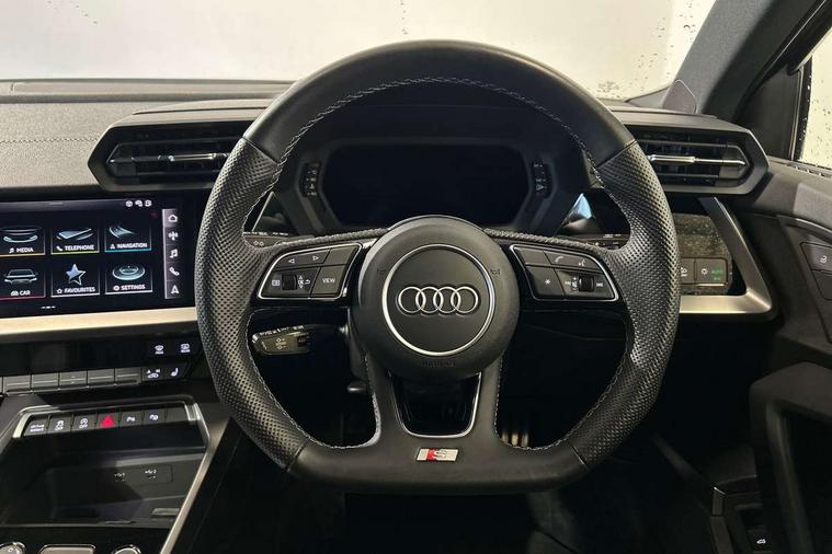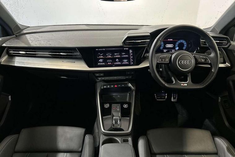 Audi drive select (Auto, Comfort, Dynamic, Efficiency and Individual), Audi smartphone interface, Audi Virtual Cockpit - 10.25" digital and colour instrument cluster, Automatic start/stop system with recuperation, Bluetooth interface, Camera based traffic sign recognition, Collision avoidance assistant, e-Call (emergency call), Electromechanical power speed sensitive steering, Lane departure warning system, MMI Navigation Plus with high resolution 10.1" colour touch screen display, Service indicator, Trip computer, Voice control system with natural language interaction, Sports suspension, 2xUSB-C connection with data and charging functions, 6 passive loudspeakers, CD player, DAB Digital radio, 3rd brake light, Acoustic glass windscreen, Audi beam uses LEDs to project the Audi logo onto the ground as you exit your A3, Auto dimming frameless rear view mirror, Electrically adjustable/heated/folding/auto dimming door mirrors with integrated LED indications + kerb view function for passenger side, Front electric windows, Illuminated door sills with aluminium inserts at the front with S logo, LED daytime running lights, LED headlights with LED rear lights and dynamic rear indicators, Light and rain sensors, Model and engine designation badges at rear, Privacy glass - dark tinted rear window, rear door and side windows, Rear boot, Rear electric windows, Rear side wing doors, S roof spoiler, 12V socket and storage compartment in front centre console, 3 seat bench in 2nd row, 3 spoke flat bottomed leather multifunction sport steering wheel with gear shift paddles, 4 way electrically adjustable lumbar support for driver and front passenger, 60/40 split folding rear seat bench, Black cloth headlining, Dual zone electronic climate control, Front and rear centre armrest in artificial leather, Front and rear headrests, Front/rear floor mats, Height and reach adjustable steering wheel, Interior lighting - glove compartment light and right hand side, Luggage compartment floor covering, Manual boot compartment lid, Single front passenger seat, Stainless steel pedals and front footrest in black, Twin leather upholstery with front sports seats S embossed logo, Aluminium interior elements pack - A3, Black styling pack - A3 Saloon/Black edition, LED interior lighting pack - A3 Saloon, 3x3 point rear seat belts, Driver and front passenger airbag with passenger airbag deactivation, Electronic Stabilisation Control (ESC) including ABS, ASR and EDL, First aid kit with warning triangle and 2 safety vests, Front side airbags with head airbags and interaction airbag, Pre-sense front with pedestrian and cyclist detection, Seatbelt monitoring, Tyre pressure loss indicator, Anti theft alarm, Anti-theft wheel bolts, Electronically operated child locks, Immobiliser, Remote control central locking, Aluminium air vent surrounds, Dark spectrum aluminium inlays, accent surfaces in the dashboard and centre console in platinum grey silk effect paint finish, 19" 5 arm trapezoid design alloy wheels in matt grey with diamond cut finish,
