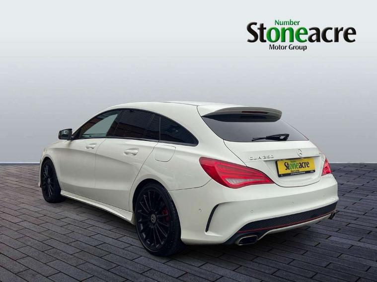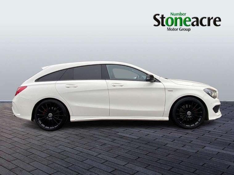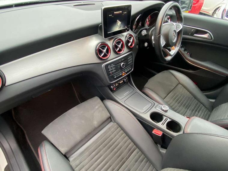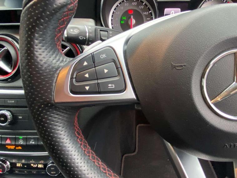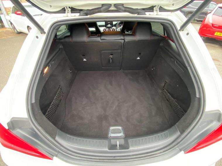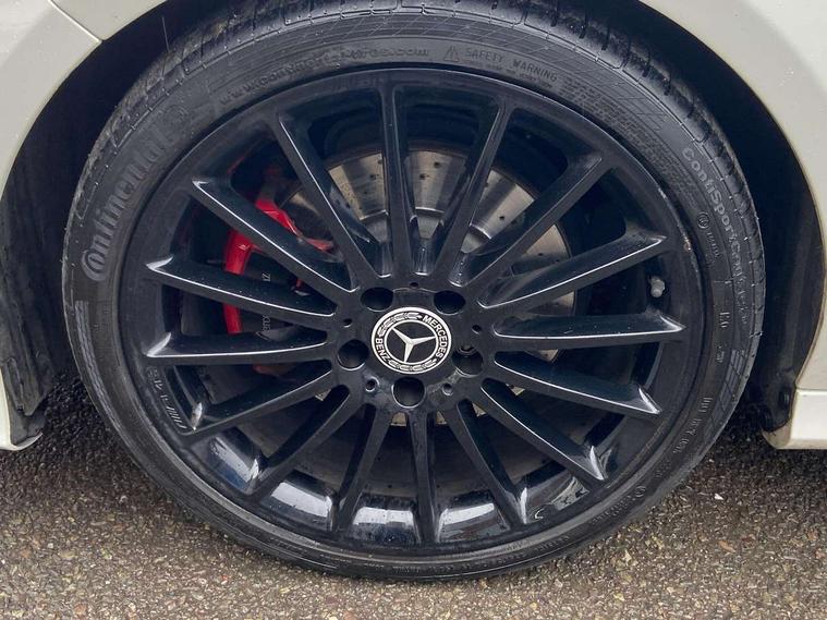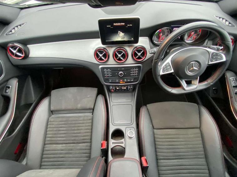 Active park assist with parktronic system, AMG speed sensitive sports steering, Attention assist, Bluetooth system, Collision prevention assist plus, DYNAMIC SELECT with a choice of driving modes (ECO, Comfort, Sport, Sport+ and Individual), Easy-pack tailgate - Powered opening/closing automatically, Garmin Map pilot navigation system with SD Card, Low fluid warning light, Outside temperature gauge, Service indicator (ASSYST), Trip computer, Lowered sports suspension, Media interface, Mercedes Audio 20 radio/single CD, USB connection, Adaptive brake lights, AMG body styling, Automatic headlights, Automatic rain sensing wipers, Bi-Xenon headlights with LED day running lights, Black high gloss beltline, Body colour bumpers, Body colour door handles, Body colour side skirt, Dual stainless steel exhaust tailpipes, Electric adjustable heated door mirrors, Front and rear electric windows, Heated rear window with timer, High gloss black door mirror housing, LED tail lights, Privacy glass, Rear wiper, 1/3 to 2/3 split folding rear seats, 12 colour Ambient lighting, 3 spoke flat bottomed leather steering wheel, Auto Mercedes-Benz child seat recognition sensor, Black roof lining, Designo seat belts in red, Door sill illumination, Dual zone climate control, Front centre armrest with storage box, Front footwell lights, Front head restraints, Front sports seats, Gearshift paddles, Height/reach adjustable steering column, Illuminated glovebox, Illuminated storage compartment, Isofix rear child seat fastenings, Load securing rings in luggage compartment, Luggage compartment cover, Multifunction steering wheel, Reading lights, Rear footwell lights, Rear head restraints, Sports pedals with rubber studs, Sunvisors with illuminated vanity mirrors, Twin console mounted cup holders, Mirror pack - CLA, 3x3 point rear seatbelts, ABS with Brake Assist, Adaptive brake system, Brake calipers in red, Child proof door locks, Drivers knee airbag, Dual stage driver/passenger airbags, Electronic parking brake, ESP with ASR, Front and rear seatbelt reminder, Front passenger airbag deactivation, Front side airbags, Hill start assist, Tyre pressure monitoring system, Warning triangle and first aid kit, Window airbags, Anti theft alarm system, Immobiliser, Remote central locking, Black air vent surrounds with red insert, Light aluminium with longitudinal grain interior trim, 18" AMG 5 spoke alloy wheels, Tirefit,