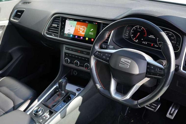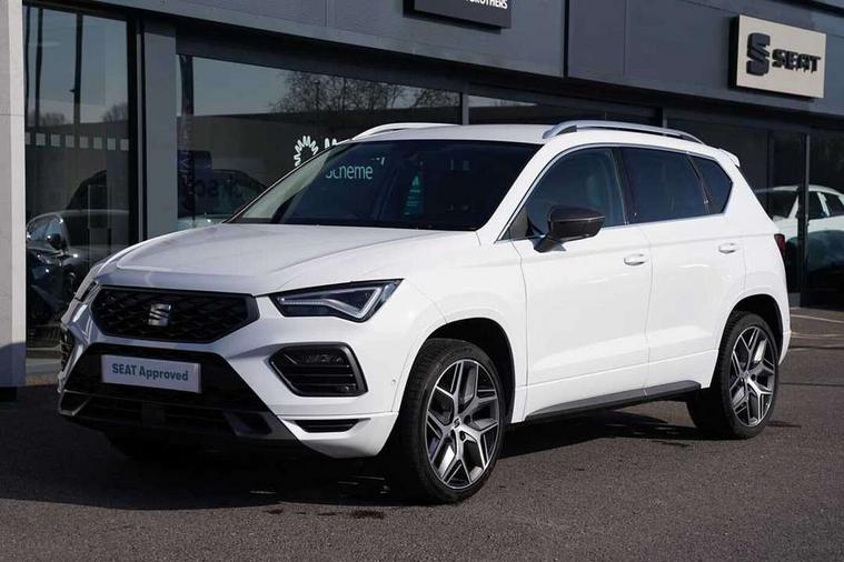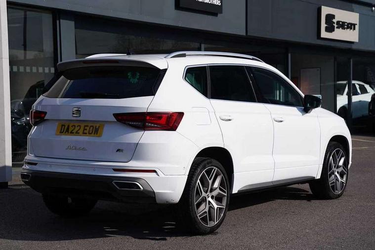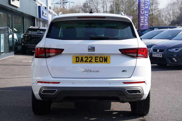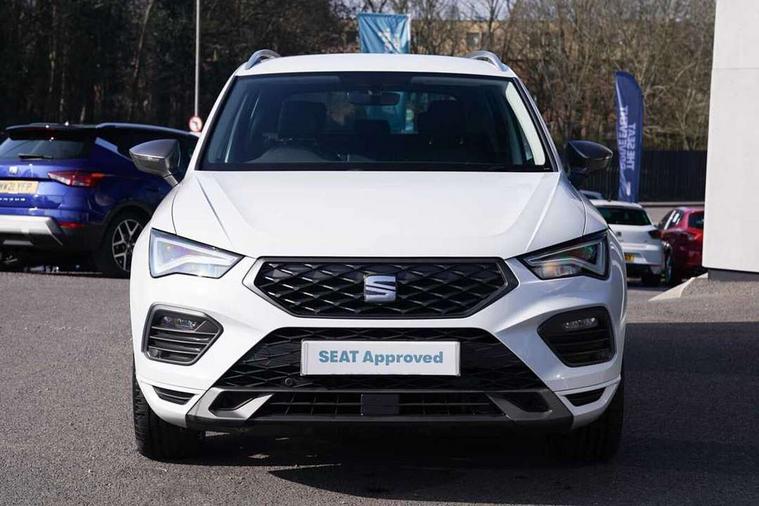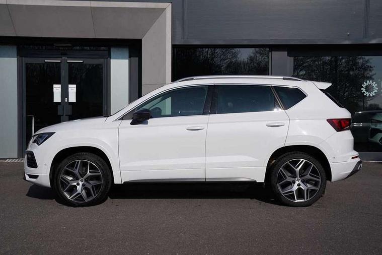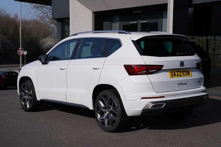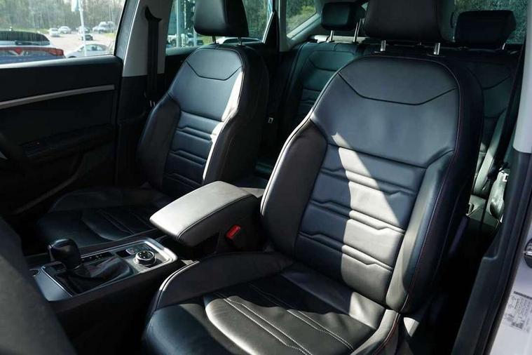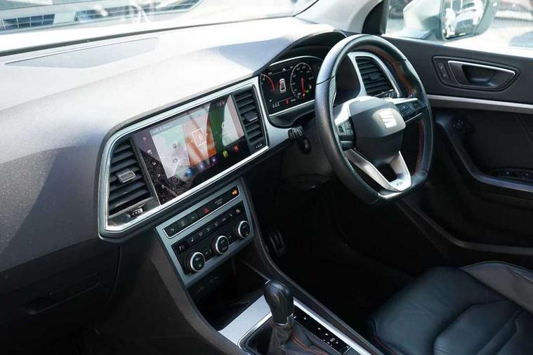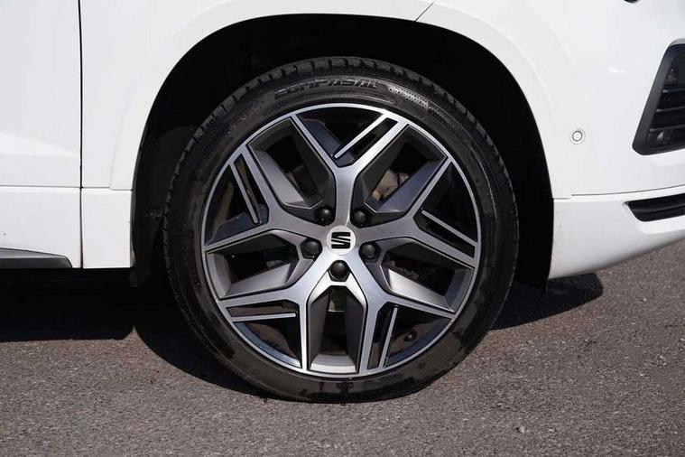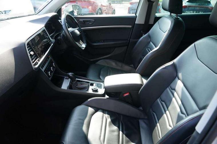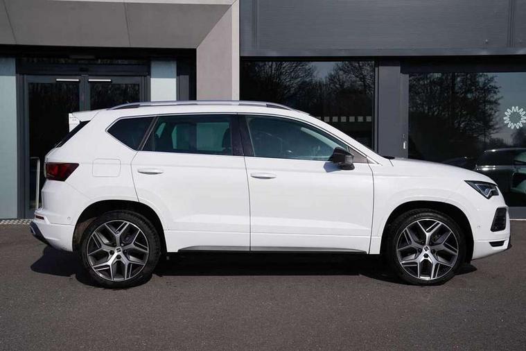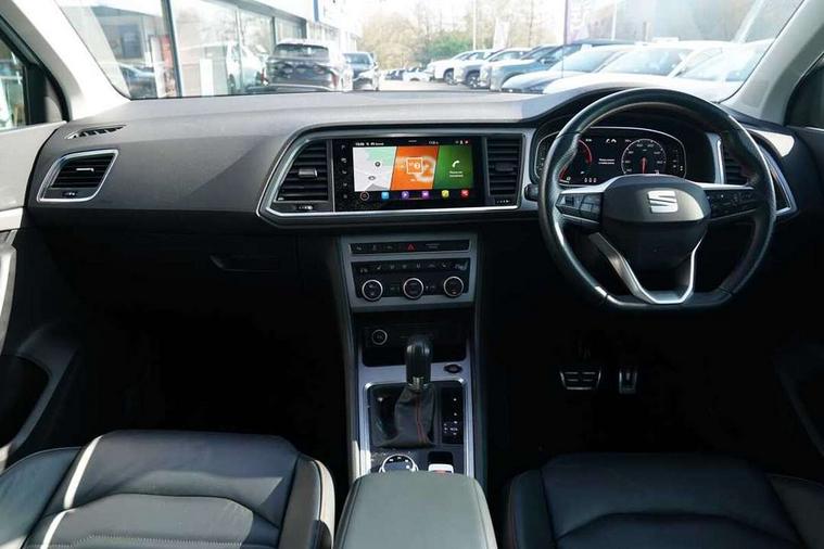 Cruise control system with speed limiter, Digital cockpit, E-call, Outside temperature gauge, Progressive power assisted steering, SEAT drive profile with driving experience button - Normal, Sport, Eco and Individual mode, gearshift, steering and throttle response, Self parking functionality (includes front and rear parking sensors), Trip computer, Wireless full link smartphone integration, Wireless phone charger, Steering wheel mounted audio/phone controls, Body colour bumpers, Body coloured wheel arch surrounds, Chrome roof rails, Chrome side window trim, Cosmo grey front grille frame, Dark tinted rear windows, Daytime running lights, Door mirrors with welcome light silhouette, Dynamic headlight range control with self adjusting whilst driving, Electric adjustable/heated/folding door mirrors, Front and rear electric windows, Full LED headlamps with lens and LED front fog lamps with cornering function, Illuminated aluminium front door sill, LED rear tail lights with dynamic indicators, Rear fog lights, Rear side wing doors, Rear spoiler, Rear wash/wipe, Simulated exhaust pipes in chrome frame, Third brake light, 12v socket in front, 3 seat bench in 2nd row, 60/40 split folding rear seat, Aluminium pedals, Dual zone climate control, Electric adjustable driver seat with lumbar adjustment, Front and rear head restraints, Front centre armrest, Front seat back storage pockets, Heated front seats, Height adjustable passenger seats with lumbar adjustment, ISOFIX points in outer rear seats with top tether anchorage points, Leather steering wheel and gear knob, Leather upholstery with front sports seats, Rear armrest and easy back seat release mechanism from boot, Single front passenger seat, Steering wheel mounted gearshift paddles, Convenience pack - Ateca, Interior lighting pack - Ateca, Navigation system pack with DAB - Ateca, 3x3 point rear seatbelts, ABS, Traction control system (TCS), Electronic stability control (ESC) and Electronic differential lock system (XDS), Airbags - Driver and front passenger airbag with deactivation, front side, two curtain and driver's knee airbags, Electric parking brake with auto hold function, Front and rear seatbelt reminder, Front assist with autonomous emergency braking, Hill hold control, Manual rear child locks, Tiredness recognition system, Traction control, Tyre pressure monitoring system, Alarm, Keyless entry, Locking wheel bolts, Chrome interior detailing, 19" Exclusive machined alloy wheels with decorative inserts 36/7 in cosmo grey,