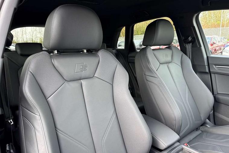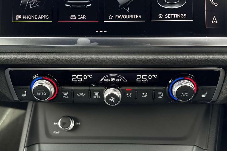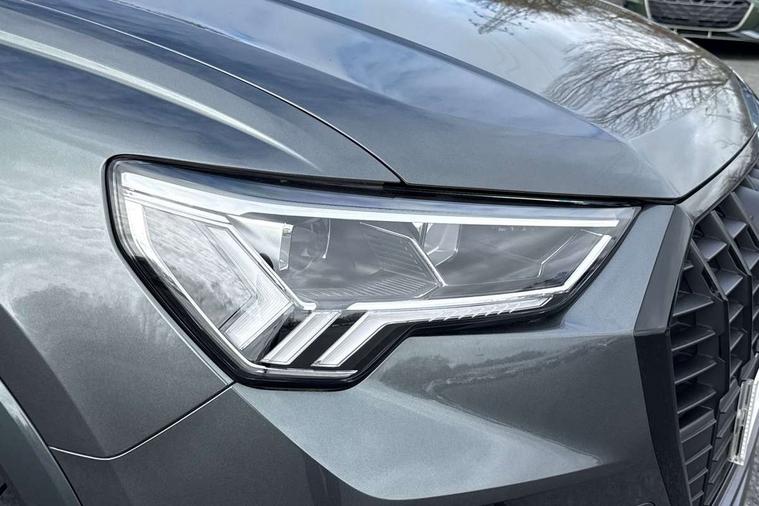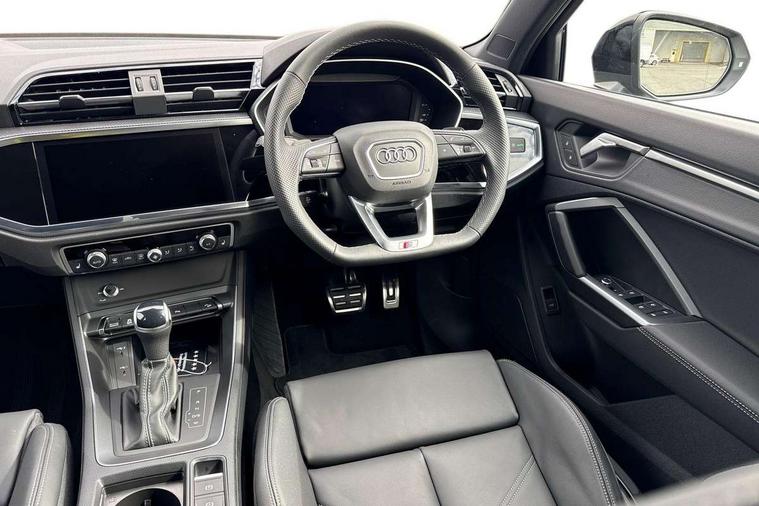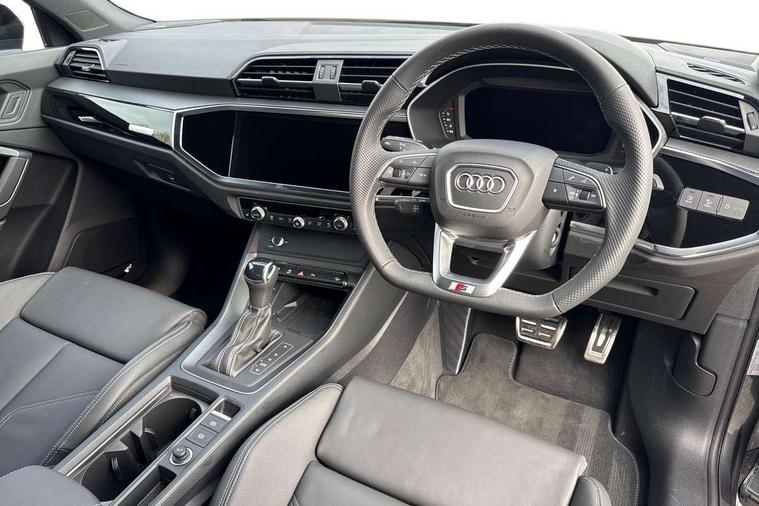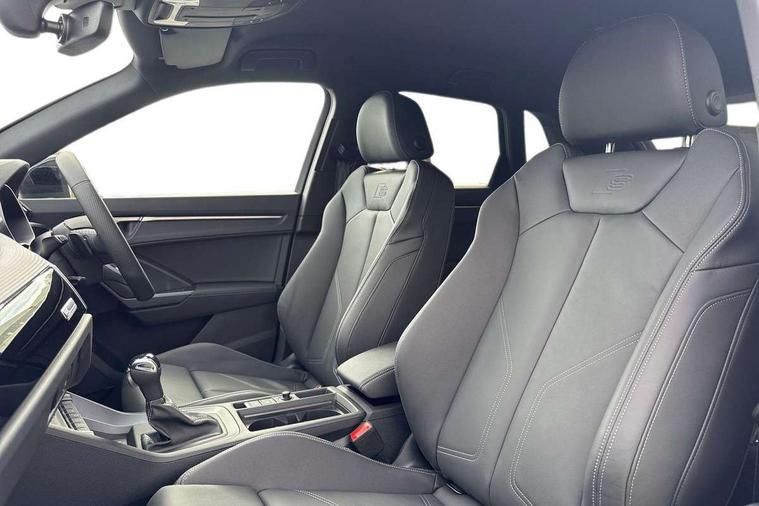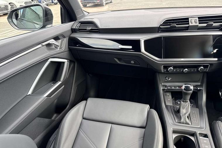 Amazon alexa Integration, Audi connect safety and service, Audi drive select, Audi lane departure warning, Audi Virtual Cockpit - 10.25" display, Bluetooth interface, Camera based traffic sign recognition, Distraction and Fatigue warning, Legal emergency call, MMI Navigation Plus with high resolution 10.1 inch touchscreen colour display, Power operated tailgate, Progressive steering, Service interval indicator, Smartphone interface includes wireless Apple carplay/Android Auto, Start stop system with recuperation, Voice control system with natural language interaction, Sports suspension, 2 USB-C ports with charge and data functions, 6 passive loudspeakers, DAB digital radio module, Acoustic windscreen, Anthracite black radiator grille, Audi Beam uses LEDs to project the Audi logo onto the ground as you exit your Q3, Auto dimming door mirrors, Auto dimming frameless rear view mirror, Black roof rails, Electrically folding, adjustable and heated door mirrors with integrated LED side indicators and kerb view function for passenger side, Front and rear electric windows, Front fog lights, Grille vertical bars in aluminium silver/Matt, High gloss black finish B and C pillars, LED Dynamic rear indicators, LED headlights with LED daytime running lights, LED rear lights, LED third brake light, Privacy glass dark tinted rear and rear-side windows (from B-pillar backwards), Rain and light sensors, Rear diffuser grille in grained matt black, Rear diffuser strip in matt anthracite black, Rear side wing doors, Rear wiper, S line bumpers in contrasting Manhattan grey, Variable front intermittent wipers, 12V socket in rear centre console, 3 seat bench in 2nd row, 40:20:40 folding with manual adjustment for 60:40 forwards/backwards position and backrest angle, Adjustable rear seat bench/backrest with centre armrest and cupholder, Black carpet mats, Black cloth headlining, Dual zone electronic climate control, Electric lumbar support, Front and rear black floor mats with contrast stitching in rock grey, Front and rear headrests, Front centre armrest, Height and reach adjustable steering wheel, Illuminated door sill trims with S logo, ISOFIX child seat mounting for front passenger with airbag deactivation and outer rear seat including top tether attachment point for outer rear seats, Luggage compartment sill protection in stainless steel, Manual front seats with height adjustment, Perforated leather gearknob, Single front passenger seat, Stainless steel pedals, Twin leather upholstery with front sport seats + S embossing, Black styling pack - Q3, Non smoking pack - Q3, 3x3 point rear seatbelts, 6 airbags - Driver, front passenger, curtain and side windows, Audi pre-sense front with pedestrain and cyclist recognition, Electrically operated child locks on rear doors, Electromechanical parking brake, Electronic stabilisation control including ABS, ASR and EDL, Front seatbelt reminder, Hill descent control, Hill hold assist, Pre sense basic, Seatbelt monitoring, Tyre pressure warning, Warning triangle and first aid kit, Anti theft wheel bolts, Immobiliser, Remote central locking, Thatcham approved category 1 anti theft alarm, Aluminium look interior elements, Detail dashboard around MMI touch colour display in glass look, black with surround in aluminium look, Leatherette door armrest, Piano black inlay,