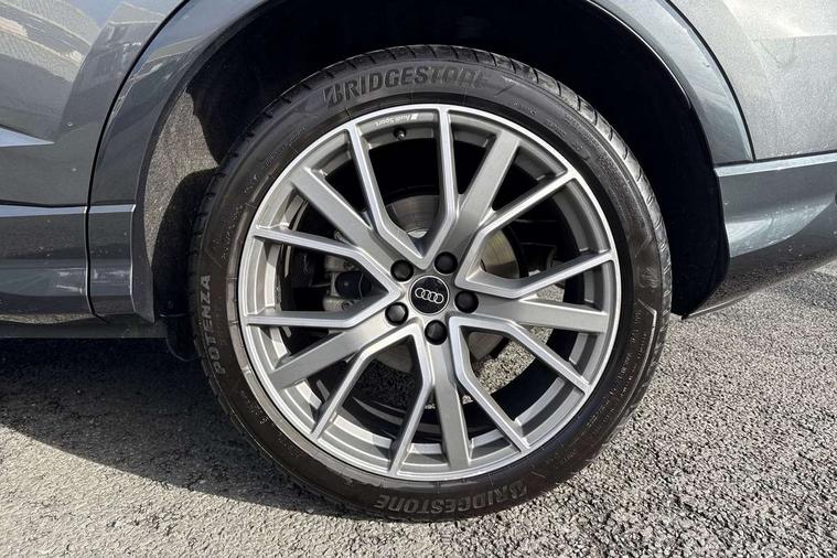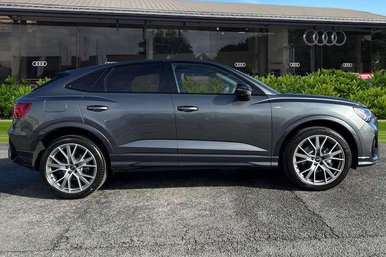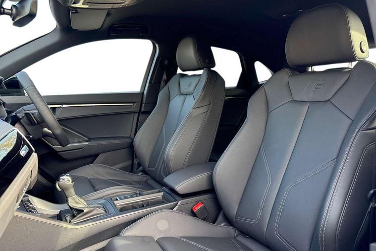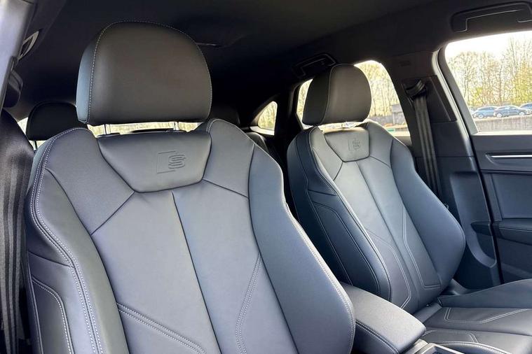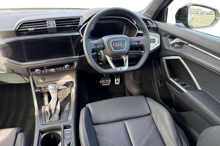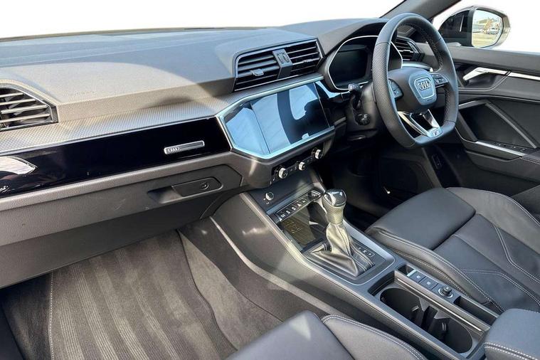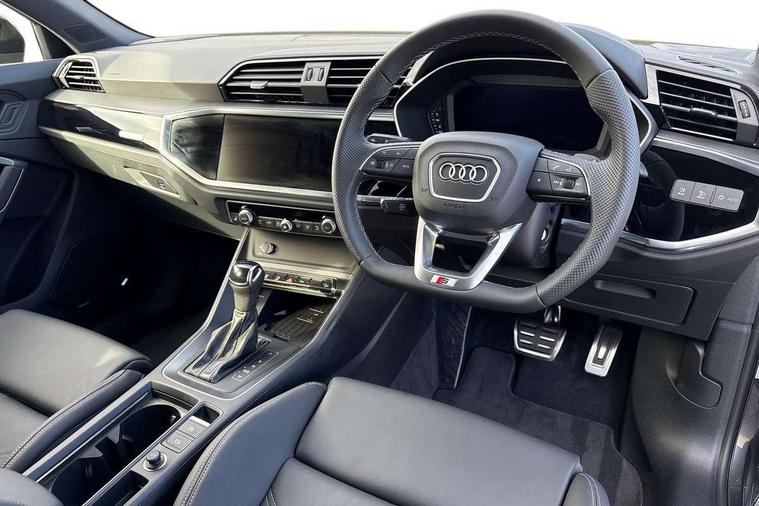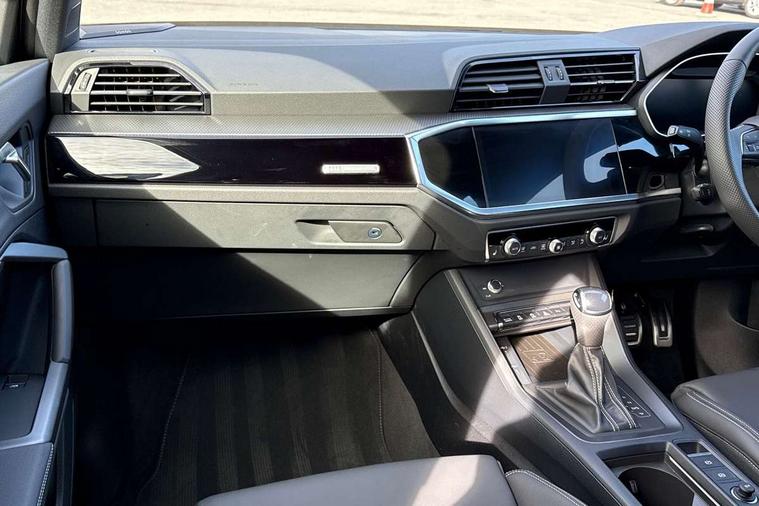Audi connect safety and service, Audi drive select, Audi lane departure warning, Audi Virtual Cockpit - 10.25" display, Bluetooth interface, Camera based traffic sign recognition, Distraction and Fatigue warning, Legal emergency call, MMI Navigation Plus with high resolution 10.1 inch touchscreen colour display, Power operated tailgate, Progressive steering, Service interval indicator, Smartphone interface includes wireless Apple carplay/Android Auto, Start stop system with recuperation, Voice control system with natural language interaction, Sports suspension, 2 USB-C ports with charge and data functions, 6 passive loudspeakers, DAB digital radio module, Acoustic windscreen, Audi Beam uses LEDs to project the Audi logo onto the ground as you exit your Q3, Auto dimming door mirrors, Auto dimming frameless rear view mirror, Electrically folding, adjustable and heated door mirrors with integrated LED side indicators and kerb view function for passenger side, Front and rear electric windows, Front fog lights, Front underbody protection in manhattan grey paint finish, High gloss black finish B and C pillars, Honeycomb design radiator grille in matt anthracite black, LED Dynamic rear indicators, LED headlights with LED daytime running lights, LED rear lights, LED third brake light, Privacy glass dark tinted rear and rear-side windows (from B-pillar backwards), Rain and light sensors, Rear diffuser grille in grained matt black, Rear diffuser strip in matt anthracite black, Rear side wing doors, Rear underbody protection in matt black, Rear wiper, S line front and rear bumpers and side skirts in contrasting Manhattan grey paint finish, Variable front intermittent wipers, 12V socket in rear centre console, 3 seat bench in 2nd row, 40:20:40 folding with manual adjustment for 60:40 forwards/backwards position and backrest angle, Adjustable rear seat bench/backrest with centre armrest and cupholder, Black carpet mats, Black cloth headlining, Dual zone electronic climate control, Electric lumbar support, Front and rear black floor mats with contrast stitching in rock grey, Front and rear headrests, Front centre armrest, Height and reach adjustable steering wheel, Illuminated door sill trims with S logo, ISOFIX child seat mounting for front passenger with airbag deactivation and outer rear seat including top tether attachment point for outer rear seats, Luggage compartment sill protection in stainless steel, Manual front seats with height adjustment, Perforated leather gearknob, Single front passenger seat, Stainless steel pedals, Twin leather upholstery with front sport seats + S embossing, Black styling pack - Q3, Non smoking pack - Q3, 3x3 point rear seatbelts, 6 airbags - Driver, front passenger, curtain and side windows, Audi pre-sense front with pedestrain and cyclist recognition, Electrically operated child locks on rear doors, Electromechanical parking brake, Electronic stabilisation control including ABS, ASR and EDL, Front seatbelt reminder, Hill descent control, Hill hold assist, Pre sense basic, Seatbelt monitoring, Tyre pressure warning, Warning triangle and first aid kit, Anti theft wheel bolts, Immobiliser, Remote central locking, Thatcham approved category 1 anti theft alarm, Aluminium look interior elements, Detail dashboard around MMI touch colour display in glass look, black with surround in aluminium look, Leatherette door armrest, Piano black inlay,