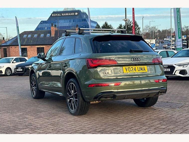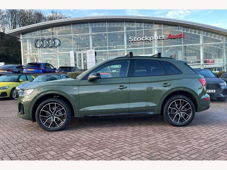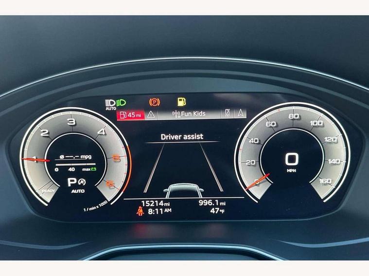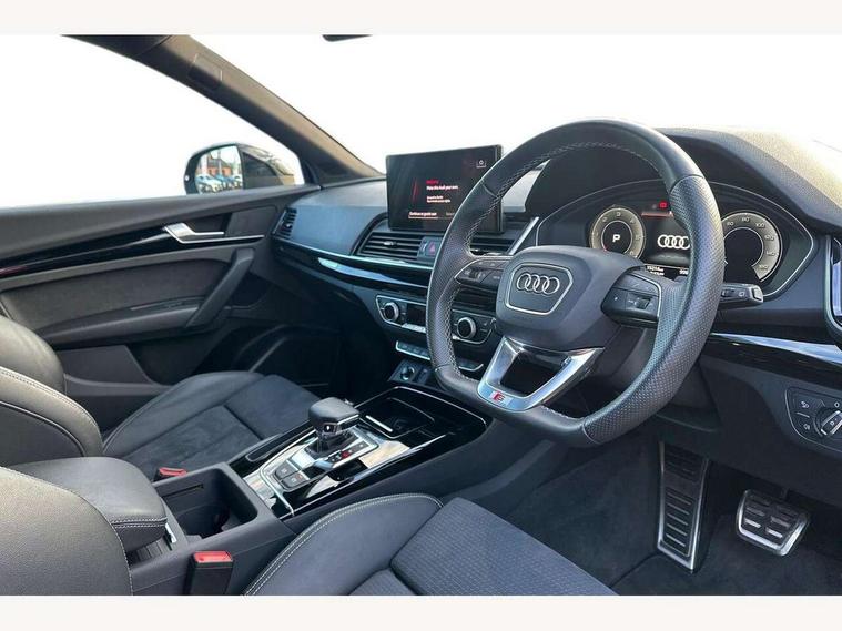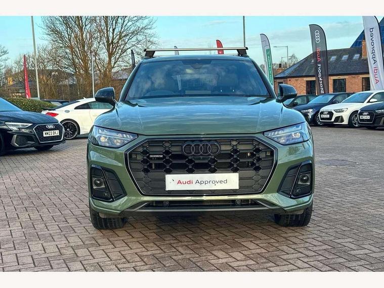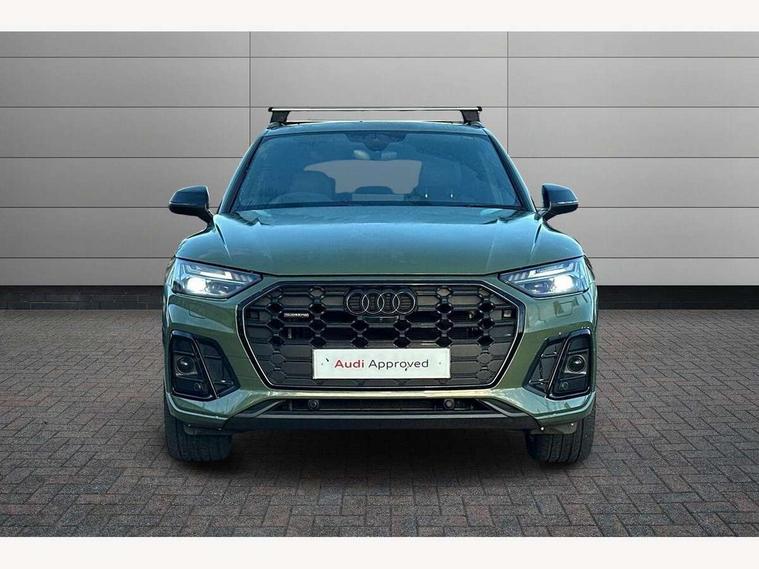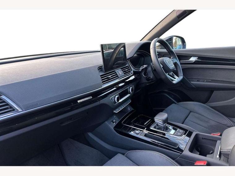 Acoustic front and rear parking sensor, Audi connect safety and service (e-call), Audi drive select, Audi virtual cockpit plus with 12.3" screen and three different layout designs, Audi wireless smartphone interface, Automatic start-stop system with coasting functionality and efficiency programme, Bluetooth interface, Camera based traffic sign recognition, Electro - mechanical power assisted steering, Lane departure warning, MMI navigation plus with 10.1" touch screen, Power tailgate, Reversing camera, Service interval indicator, Voice control system with Audi hotword activation "Hey Audi", Diesel particulate filter, Quattro on demand, S line sports suspension, 8 loudspeakers, DAB Digital radio, Acoustic windscreen, Auto dimming door mirrors, Auto dimming frameless rear view mirror, Automatic headlight adjustment, Automatic headlights and windscreen wipers, Black roof rails, Black styling with black rings, Body colour bumpers, Body colour rear diffuser with matt aluminium silver surrounds, Body colour underbody protection, Chrome plated exhaust trims, Daytime running lights, Door sills in Selenite silver, Electric adjustable/heated/folding door mirrors, Front air inlet surrounds in aluminium, Front and rear electric windows, Front radiator grille in honeycomb design, LED 3rd brake light, LED headlights and LED tail lights, Lower bumpers painted in contrast Manhattan grey, Rear chrome trim strip below lights, Rear privacy glass and rear side windows, Rear side wing doors, Rear wiper, Roof bars, S Line badges on the front wing panels, S Line front and rear bumpers, S Line rear spoiler, S Line side skirts, 2 x USB charging port with aux input socket, 3 rear headrests, Black cloth headlining, Comfort front centre armrest, Contrast stitching on seats, steering wheel and gear lever gaiter, Deluxe 3 zone electronic climate control, Front head restraints, Front sport seats with S embossed logo, Front/rear floor mats, Gear lever in black leather, Heated front seats, Height/reach adjustable steering column, Illuminated door sill trims with S logo, Loading edge protection in stainless steel, Luggage compartment cover, Manual seat adjustment with 4-way electric lumbar support, Single front passenger seat, Stainless steel pedals, Sunvisors with vanity mirrors, Tool kit, Top surface of the rear centre armrest in artificial leather, High gloss pack - Q5, LED interior light pack - Q5, 3 point seatbelts on all seats, 6 airbags - Driver, front passenger, curtain and side airbags, Attention and drowsiness assist, Electrically operated child locks on rear doors, Electromechanical parking brake, Electronic stabilisation control including ABS, ASR and EDL, First aid kit with warning triangle and vests, Front passenger airbag deactivation, Hill descent control, Hill hold assist, ISOFIX child seat mounting for front passenger seat and ISOFIX child seat mounting with Top Tether for outer rear seats, Multi collision brake assist, Pop-up bonnet for pedestrian protection, Pre sense city, Seatbelt monitoring, Tyre pressure warning, Anti theft alarm, Anti-theft wheel bolts, Remote central locking, Remote control key with SAFELOCK and keyless go, Air vents inserts and centre console in gloss black, Tyre repair kit,